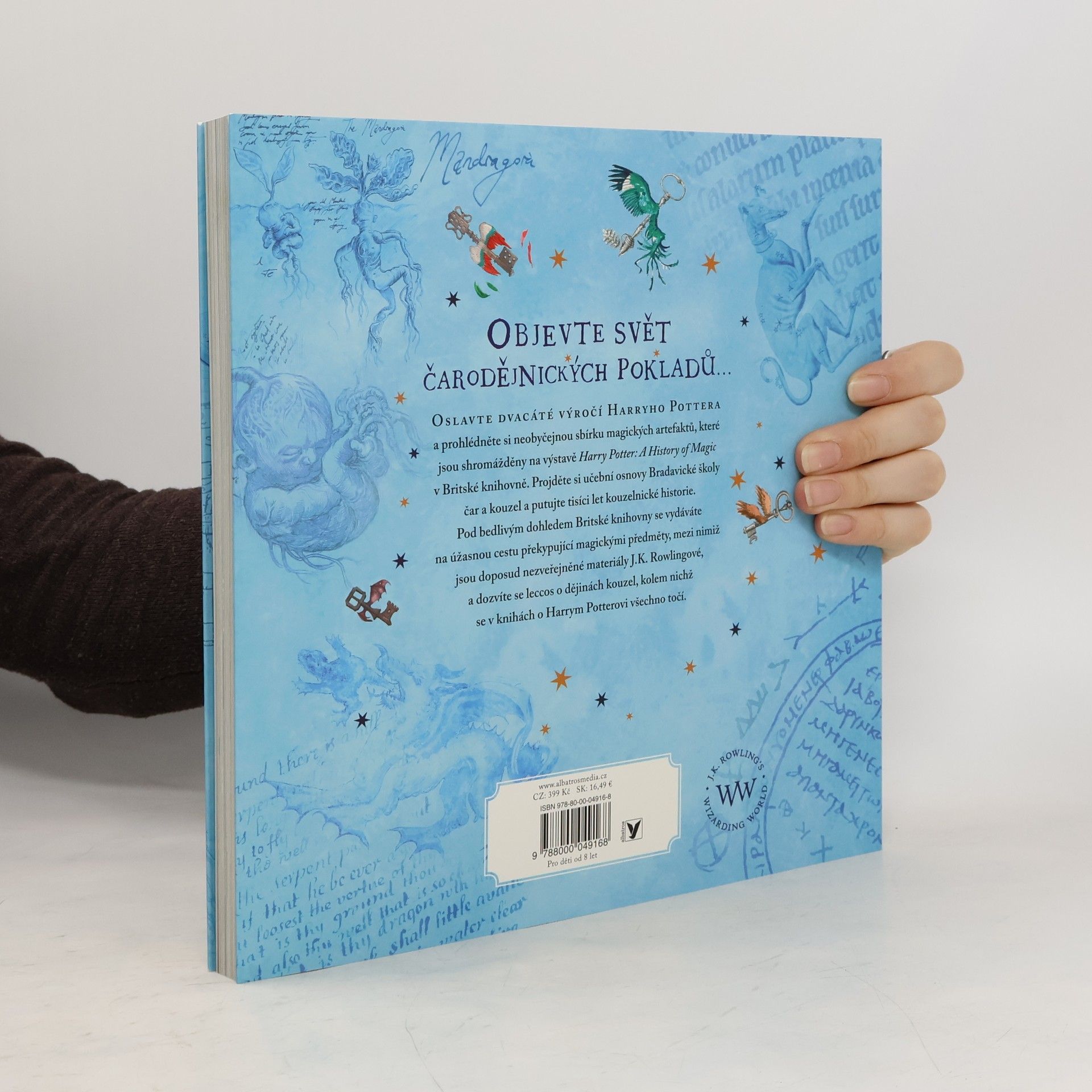 OBJEVTE SVĚT ČARODĚJNICKÝCH POKLADŮ... OSLAVTE DVACÁTÉ VÝROČÍ HARRYHO POTTERA a prohlédněte si neobyčejnou sbírku magických artefaktů, které jsou shromážděny na výstavě Harry Potter: A History of Magic v Britské knihovně. Projděte si učební osnovy Bradavické školy čar a kouzel a putujte ticíci let kouzelnické historie. Pod bedlivým dohledem Britské knihovny se vydáváte na úžasnou cestu překypující magickými předměty, mezi nimiž jsou doposud nezveřejněné materiály J.K. Rowlingové, a dozvíte se leccos o dějinách kouzel, kolem nichž se v knihách o Harrym Potterovi všechno točí. U PŘÍLEŽITOSTI DVACÁTÉHO VÝROČÍ původního vydání knihy Harry Potter a Kámen mudrců bereme čtenáře na úchvatnou cestu bradavickými školními osnovami od péče o kouzelné tvory a bylinkářství přes obranu proti černé magii a astronomii až po přeměňování. Za všemi těmito obory jsou tisíce let historie. Na stránkách této knihy objevíte pozoruhodné artefakty ze sbírek Britské knihovny, nikdy nepublikované skici a faksimile rukopisů J.K. Rowlingové a nádherné ilustrace Jima Kaye. Dozvíte se, odkud pochází Kámen mudrců a co skrývají strašliví draci a obtížní trollové. Sami si připravíte lektvar, prohlédnete si skutečné kouzelnické hůlky a zjistíte, proč doopravdy mandragory tak ječí. A pokocháte se stránkami z da Vinciho zápisníku nebo z nejstaršího atlasu noční oblohy.