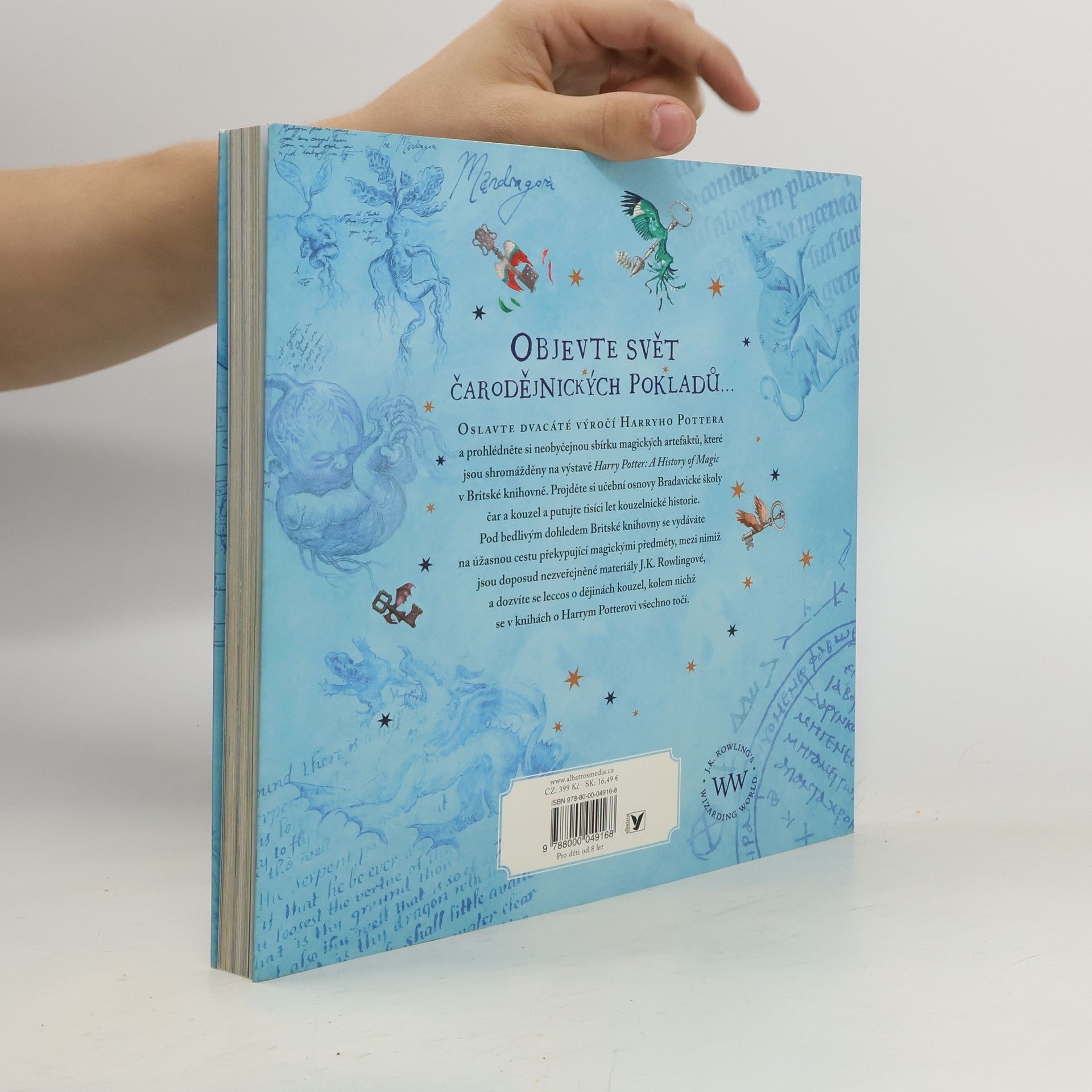 OBJEVTE SVĚT ČARODĚJNICKÝCH POKLADŮ... OSLAVTE DVACÁTÉ VÝROČÍ HARRYHO POTTERA a prohlédněte si neobyčejnou sbírku magických artefaktů, které jsou shromážděny na výstavě Harry Potter: A History of Magic v Britské knihovně. Projděte si učební osnovy Bradavické školy čar a kouzel a putujte ticíci let kouzelnické historie. Pod bedlivým dohledem Britské knihovny se vydáváte na úžasnou cestu překypující magickými předměty, mezi nimiž jsou doposud nezveřejněné materiály J.K. Rowlingové, a dozvíte se leccos o dějinách kouzel, kolem nichž se v knihách o Harrym Potterovi všechno točí. U PŘÍLEŽITOSTI DVACÁTÉHO VÝROČÍ původního vydání knihy Harry Potter a Kámen mudrců bereme čtenáře na úchvatnou cestu bradavickými školními osnovami od péče o kouzelné tvory a bylinkářství přes obranu proti černé magii a astronomii až po přeměňování. Za všemi těmito obory jsou tisíce let historie. Na stránkách této knihy objevíte pozoruhodné artefakty ze sbírek Britské knihovny, nikdy nepublikované skici a faksimile rukopisů J.K. Rowlingové a nádherné ilustrace Jima Kaye. Dozvíte se, odkud pochází Kámen mudrců a co skrývají strašliví draci a obtížní trollové. Sami si připravíte lektvar, prohlédnete si skutečné kouzelnické hůlky a zjistíte, proč doopravdy mandragory tak ječí. A pokocháte se stránkami z da Vinciho zápisníku nebo z nejstaršího atlasu noční oblohy.