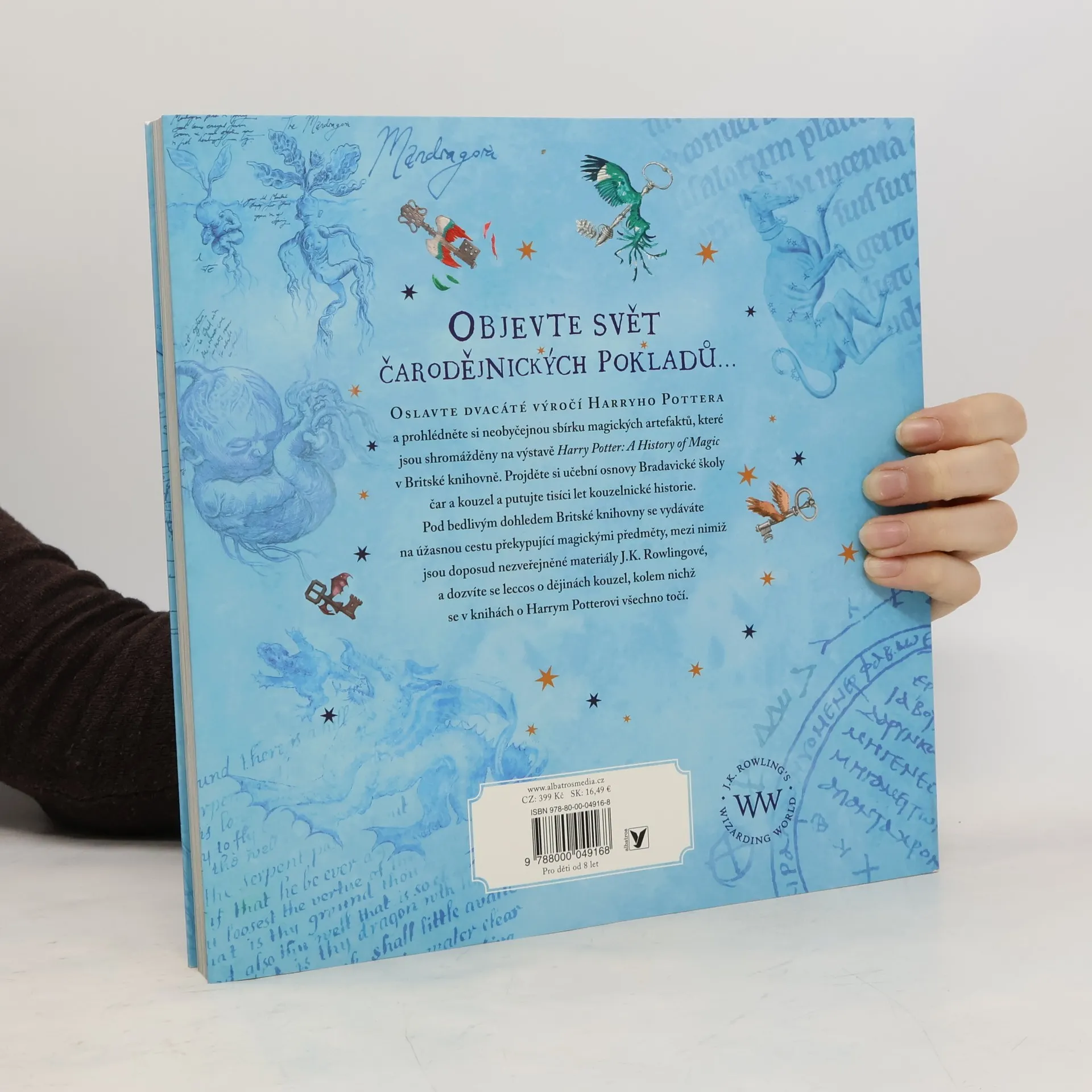 OBJEVTE SVĚT ČARODĚJNICKÝCH POKLADŮ... OSLAVTE DVACÁTÉ VÝROČÍ HARRYHO POTTERA a prohlédněte si neobyčejnou sbírku magických artefaktů, které jsou shromážděny na výstavě Harry Potter: A History of Magic v Britské knihovně. Projděte si učební osnovy Bradavické školy čar a kouzel a putujte ticíci let kouzelnické historie. Pod bedlivým dohledem Britské knihovny se vydáváte na úžasnou cestu překypující magickými předměty, mezi nimiž jsou doposud nezveřejněné materiály J.K. Rowlingové, a dozvíte se leccos o dějinách kouzel, kolem nichž se v knihách o Harrym Potterovi všechno točí. U PŘÍLEŽITOSTI DVACÁTÉHO VÝROČÍ původního vydání knihy Harry Potter a Kámen mudrců bereme čtenáře na úchvatnou cestu bradavickými školními osnovami od péče o kouzelné tvory a bylinkářství přes obranu proti černé magii a astronomii až po přeměňování. Za všemi těmito obory jsou tisíce let historie. Na stránkách této knihy objevíte pozoruhodné artefakty ze sbírek Britské knihovny, nikdy nepublikované skici a faksimile rukopisů J.K. Rowlingové a nádherné ilustrace Jima Kaye. Dozvíte se, odkud pochází Kámen mudrců a co skrývají strašliví draci a obtížní trollové. Sami si připravíte lektvar, prohlédnete si skutečné kouzelnické hůlky a zjistíte, proč doopravdy mandragory tak ječí. A pokocháte se stránkami z da Vinciho zápisníku nebo z nejstaršího atlasu noční oblohy.