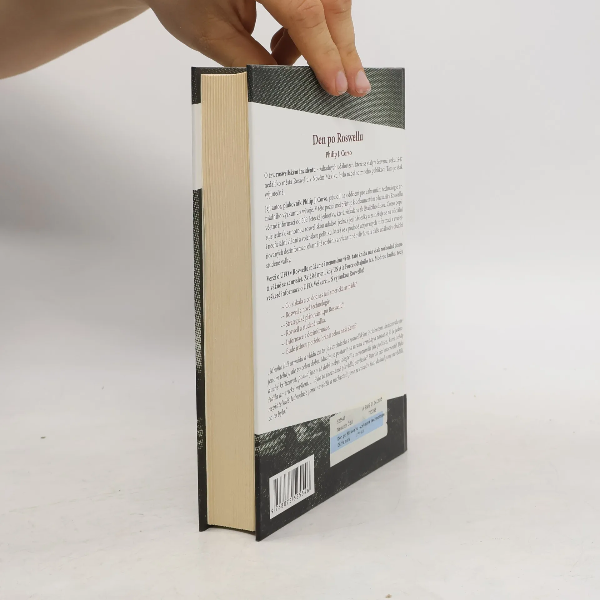 Svědectví plukovníka US Army o tzv. roswellském incidentu – záhadných událostech, které se staly v červenci roku 1947 nedaleko města Roswellu v Novém Mexiku, bylo napsáno mnoho publikací. Tato je však výjimečná. Její autor, plukovník Philip J. Corso, působil v Oddělení pro zahraniční technologie a armádního výzkumu a vývoje. V této pozici měl přístup k dokumentům o havárii v Roswellu včetně informací od 509. letecké jednotky, která získala vrak létajícího disku. Corso popisuje jednak samotnou roswellskou událost, jednak její následky a zaměřuje se na oficiální i neoficiální vládní a vojenskou politiku, která se v podobě utajovaných informací a zveřejňovaných dezinformací okamžitě rozběhla a významně ovlivňovala další události v období studené války. Verzi o UFO v Roswellu můžeme i nemusíme věřit, tato kniha nás však rozhodně donutí se vážně zamyslet. Zvláště nyní, kdy US Air Force odtajnilo tzv. Modrou knihu, tedy veškeré informace o UFO. Veškeré... S výjimkou Roswellu! – Co získala a co dodnes tají americká armáda? – Roswell a nové technologie. – Strategické plánování „po Roswellu“. – Roswell a studená válka. – Informace a desinformace. – Bude jednou potřeba bránit celou naši Zemi?