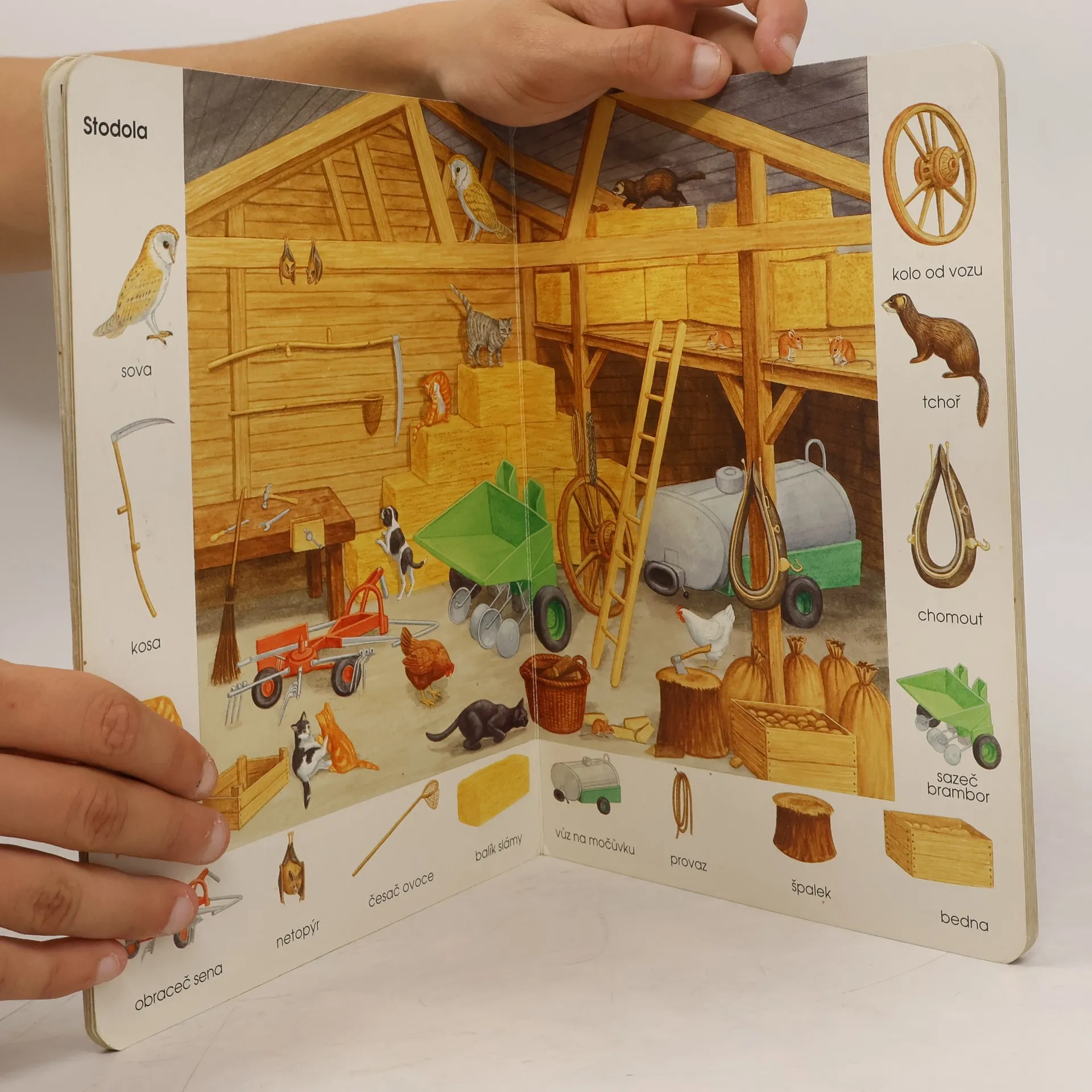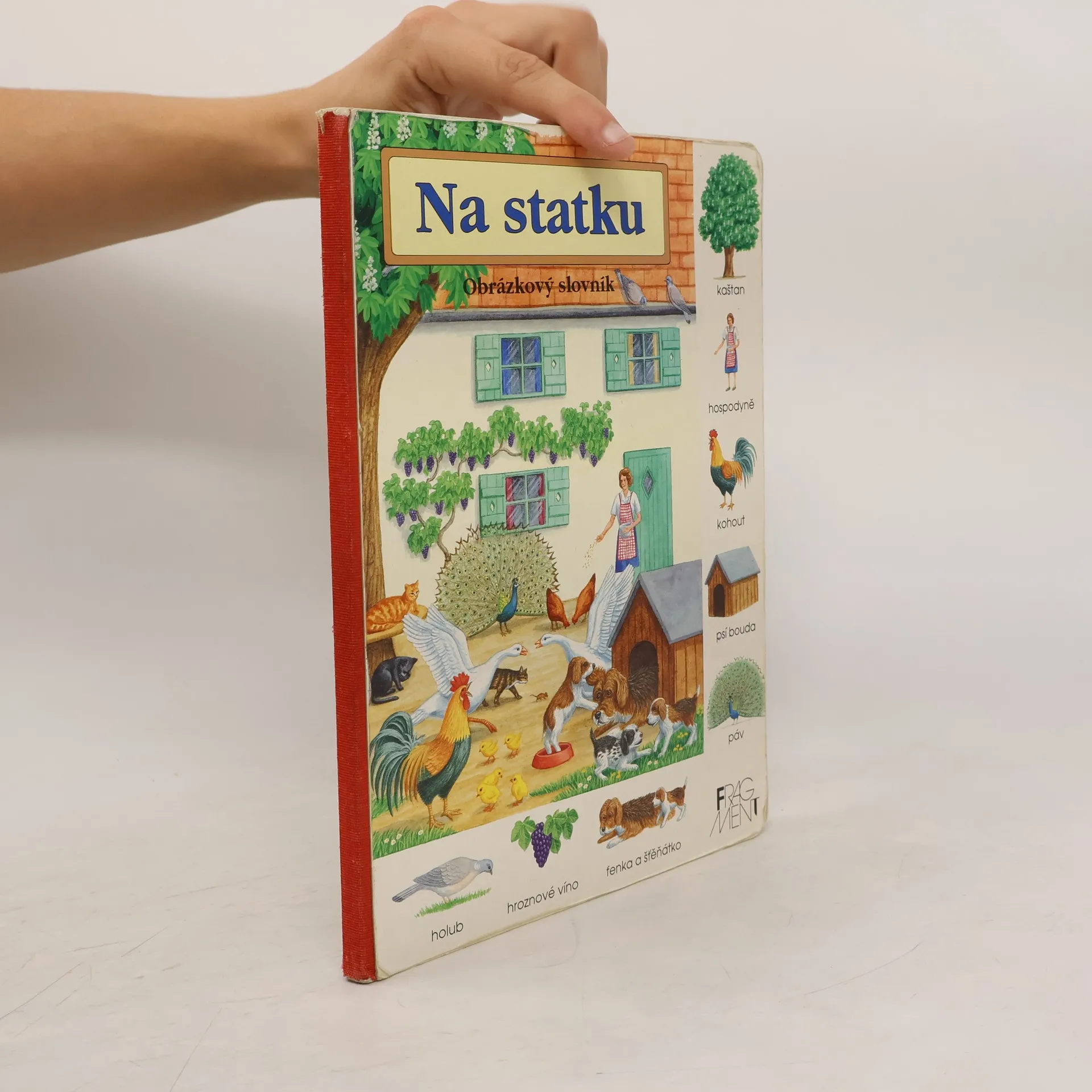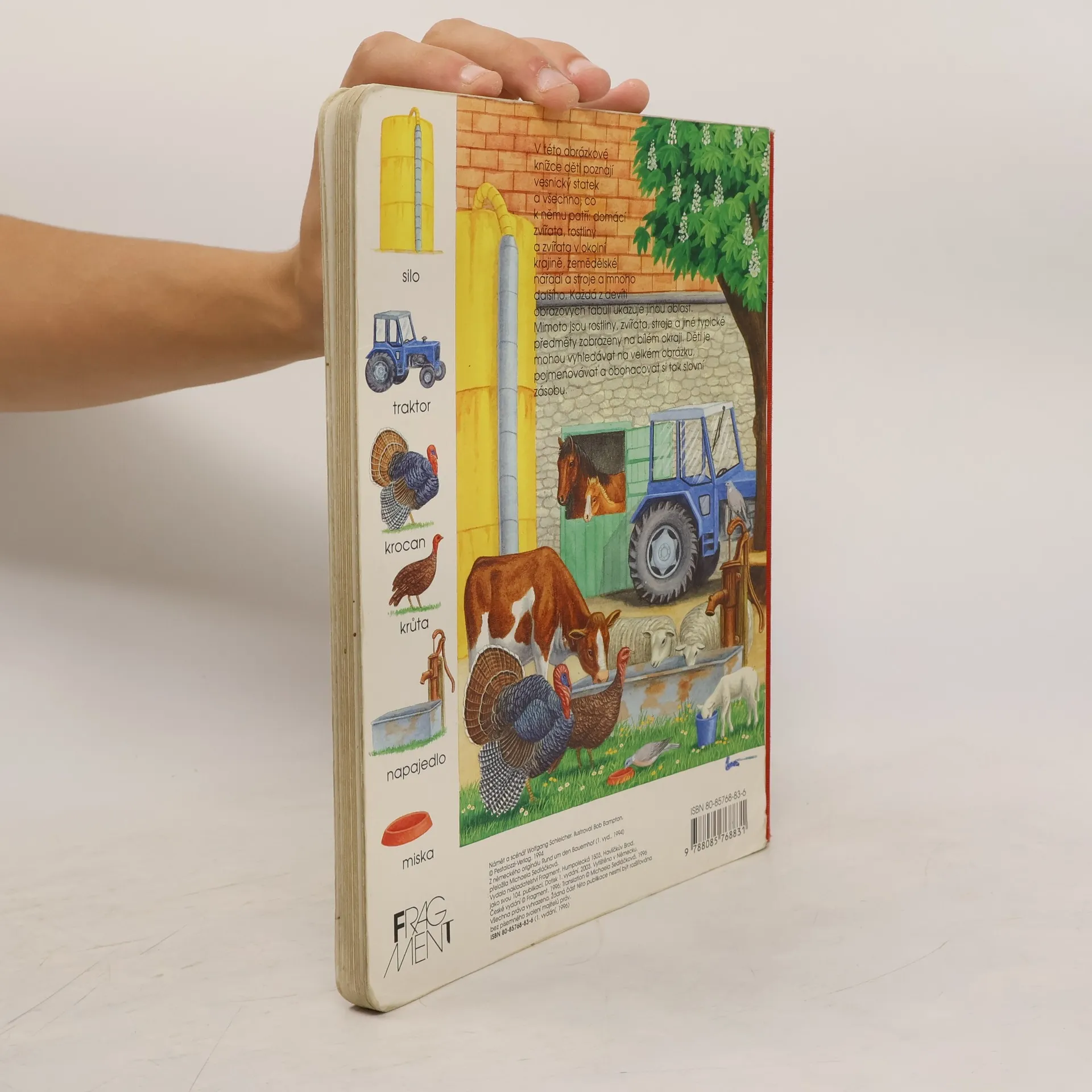 V této obrázkové knížce děti poznají vesnický statek a všechno, co k němu patří - domácí zvířata, rostliny i zvířata v širém okolí, zemědělské nářadí, stroje a mnoho dalšího. V bílém pásu kolem velké obrazové tabule jsou navíc zobrazeny jednotlivé rostliny, zvířata a stroje s uvedením názvu, aby je děti mohly v obrázku vyhledávat a pojmenovávat.