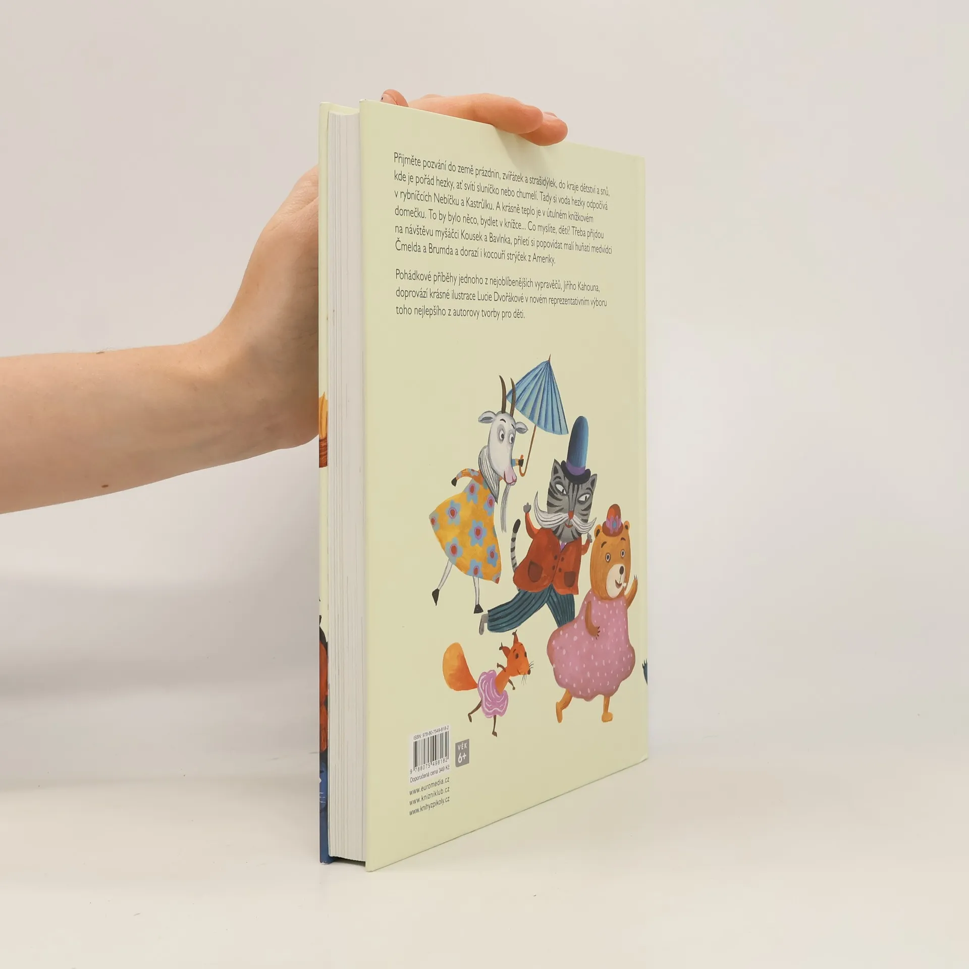 Nejkrásnější příběhy Jiřího Kahouna. Za devatero horami a devatero lesy, daleko, předaleko, ale vlastně jen co by kamenem dohodil, se rozkládá překrásný kraj. Dá se do něj dojít pěšky, s ruksakem na zádech, nebo dojet kodrcajícím vláčkem. Je to země prázdnin, zvířátek a strašidýlek, kraj dětství a snů, kde je pořád hezky, ať svítí sluníčko nebo chumelí. V jednom ze zdejších lesů stojí mohutný vykotlaný strom a vedle stromu židle sroubené ze smrkových kmínků. Kdybyste se sem náhodou přece jen dostali a měli štěstí, uvidíte tam vysedávat dědečka. Chvilku vedle něj poseďte a počkejte, až dobafá z fajfky. Pak se ozve zaskřípání a vy s překvapením zjistíte, že v mohutném kmeni jsou malá dvířka. A věřte nevěřte, jsou to dvířka do pohádky. Nejkrásnější pohádkové příběhy jednoho z nejoblíbenějších vypravěčů Jiřího Kahouha doprovází krásné a výpravné ilustrace Lucie Dvořákové v novém reprezentativním výboru toho nejlepšího z autorovy tvorby pro děti. Kniha je určena pro čtenáře od 6 let.