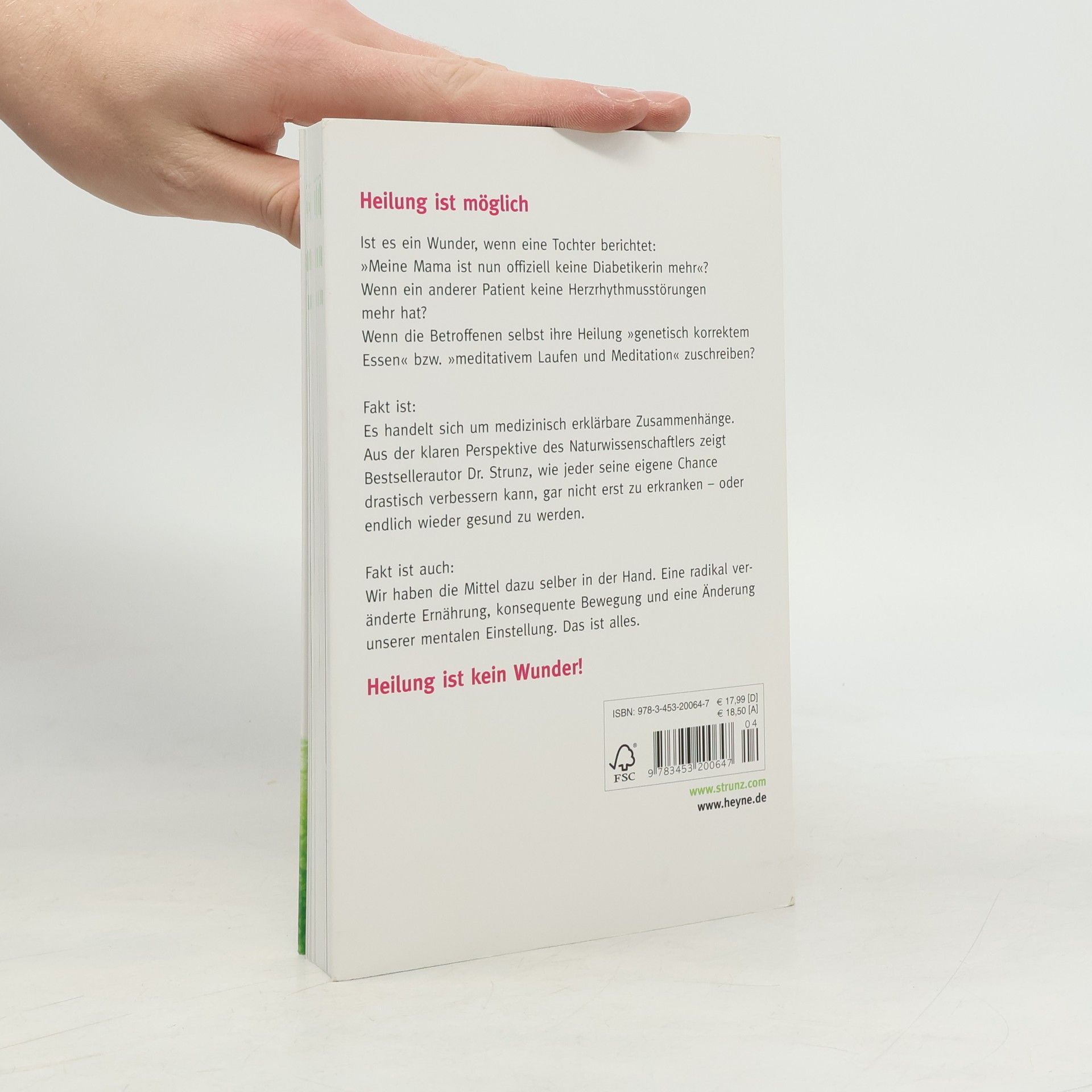 Heilung ist machbar Ist es ein Wunder, wenn eine Tochter berichtet: »Meine Mama ist nun offiziell keine Diabetikerin mehr«? Wenn ein anderer Patient keine Herzrhythmusstörungen mehr hat? Wenn die Betroffenen selbst ihre Heilung »genetisch korrektem Essen« bzw. »meditativem Laufen« zuschreiben? – Fakt ist: Es handelt sich um medizinisch erklärbare Zusammenhänge. Aus der klaren Perspektive des Naturwissenschaftlers zeigt Dr. Strunz, wie jeder seine eigene Chance drastisch verbessern kann, gar nicht erst zu erkranken – oder endlich gesund zu werden.Die erstaunlichen Genesungen, von denen viele Menschen Dr. Strunz berichten, dürfte es nach dem Verständnis der technisch orientierten Schulmedizin gar nicht geben: Können denn Asthma, Bluthochdruck, Herzrhythmusstörungen, Diabetes, ein Krebsgeschwür und andere Krankheiten einfach verschwinden? – Die Antwort lautet: Ja. Überzeugend erklärt Dr. Strunz die biologischen Zusammenhänge: Bei sehr vielen Krankheiten, unter denen wir leiden, handelt es sich letztlich um Zivilisationskrankheiten, die durch einen falschen Lebensstil ausgelöst werden. Die wirksamsten »Heilmittel« sind deshalb ganz simpel: eine radikal veränderte Ernährung, konsequente Bewegung, eine Änderung unserer mentalen Einstellung. – Heilung ist kein Wunder!