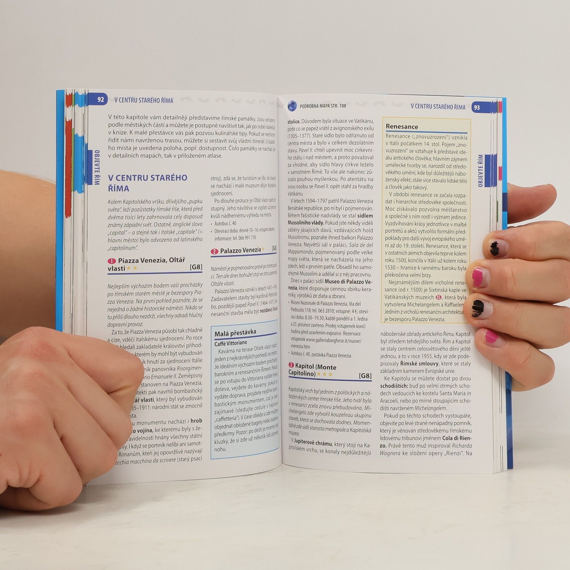 V úvodu shrnuje praktické rady o dopravě, ubytování, stravování atd. Následuje doporučení pro plánování programu k navštívení památek podle délky pobytu, od jednoho dne po dva týdny. V dalších kapitolách nabízí návrhy, jak strávit v Římě volný čas - památky, nákupy, noční radovánky, toulky městem ad., které se dají kombinovat s individuální prohlídkou města. Stručný popis památek, slovníček nejdůležitějších slov a frází, knižní tipy, mapky.