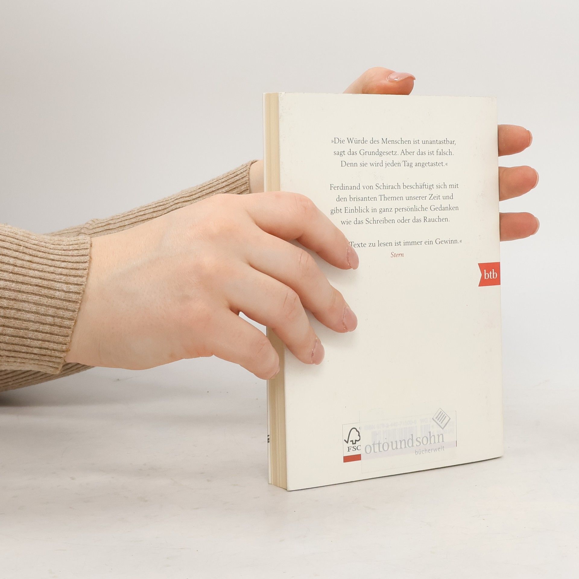 »Die Würde des Menschen ist unantastbar, sagt das Grundgesetz. Aber das ist falsch. Denn sie wird jeden Tag angetastet.« Ferdinand von Schirach beschäftigt sich in seinen Essays mit den großen Themen unserer Zeit – warum der Terrorismus letztlich über die Demokratie entscheidet – und geht zugleich sehr persönlichen Gedanken nach, über das Schreiben, das Lesen mit dem iPad und das Rauchen. Oft ist es nur der Zufall, der den Einzelnen zum Täter oder Opfer macht. Schuld ist das, was einem Menschen persönlich vorgeworfen werden kann. Nicht zuletzt seine so überzeugend formulierten Gedanken über Gut und Böse, über die moralischen und ethischen Fragestellungen in unserer Gesellschaft, haben seine Stories und Romane zu Welterfolgen gemacht. In seinen Essays widmet sich Ferdinand von Schirach brisanten Themen wie den Herausforderungen an unsere Demokratie im Zeichen des Terrorismus, den Schauprozessen gegen Prominente, der Sicherheitsverwahrung oder der Folterandrohung gegen Kindermörder. Daneben geht er aber auch der Frage nach, wie es in Zeiten des iPads um unser Lesen bestellt ist oder was der Zwang zu schreiben für einen Schriftsteller wirklich bedeutet.