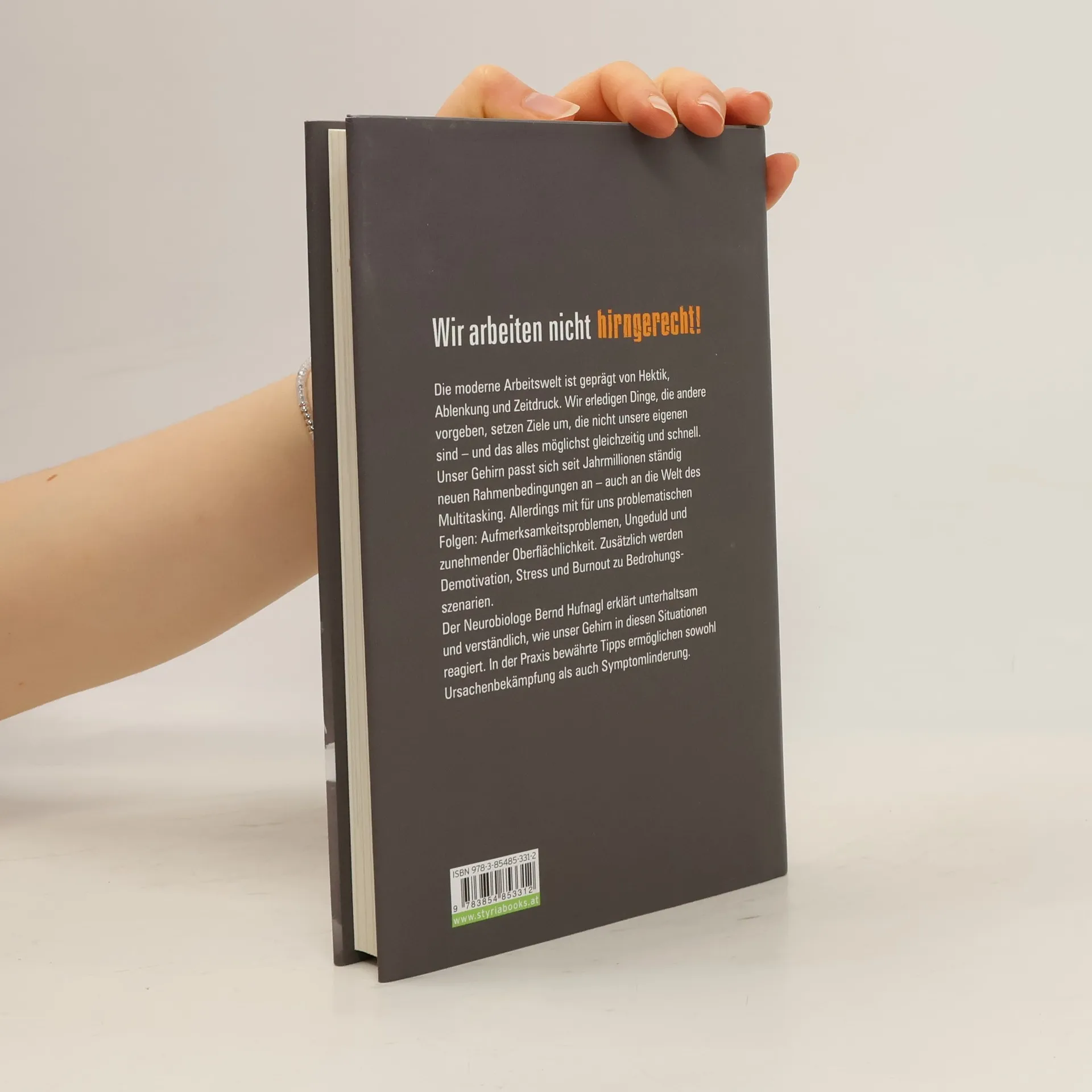 Der Neurobiologe Bernd Hufnagl zeigt, was die Behauptung, nicht hirngerecht zu arbeiten, mit unseren Instinkten, „Belohnungssystemen“, aber auch mit unserer sinkenden Veränderungsbereitschaft zu tun hat. Stress und Burnout werden leider oft undifferenziert zum Bedrohungsszenario erklärt – in der Familie, in der Schule – aber vor allem in der Arbeitswelt. Dieses Buch ist ein Plädoyer für mehr Geduld und Achtsamkeit in unserem hektischen Multitasking-Alltag. Es bietet eine neue, differenziertere Sichtweise und vergleicht die Kenntnis und Erfahrung zur Logik der Arbeitswelt internationaler Konzerne mit der Kenntnis der Logik unserer eigenen „Software“. Praktische, in der Praxis bewährte Tipps ermöglichen sowohl Ursachenbekämpfung als auch Symptomlinderung.