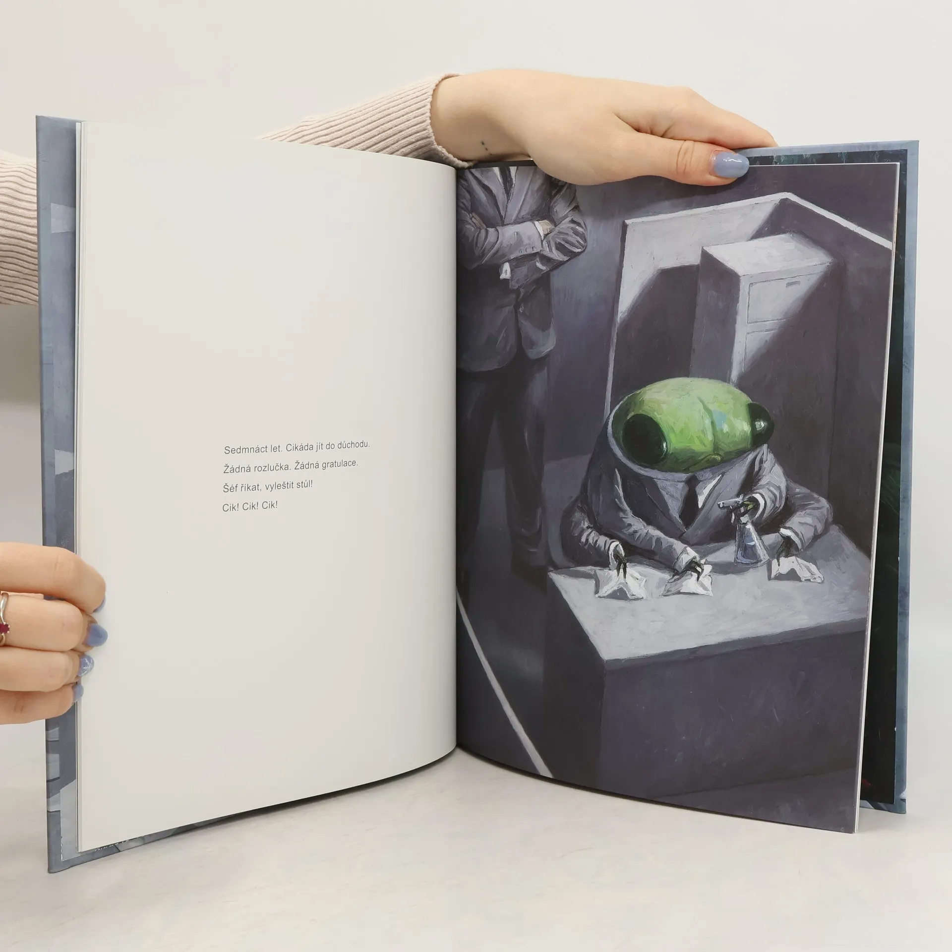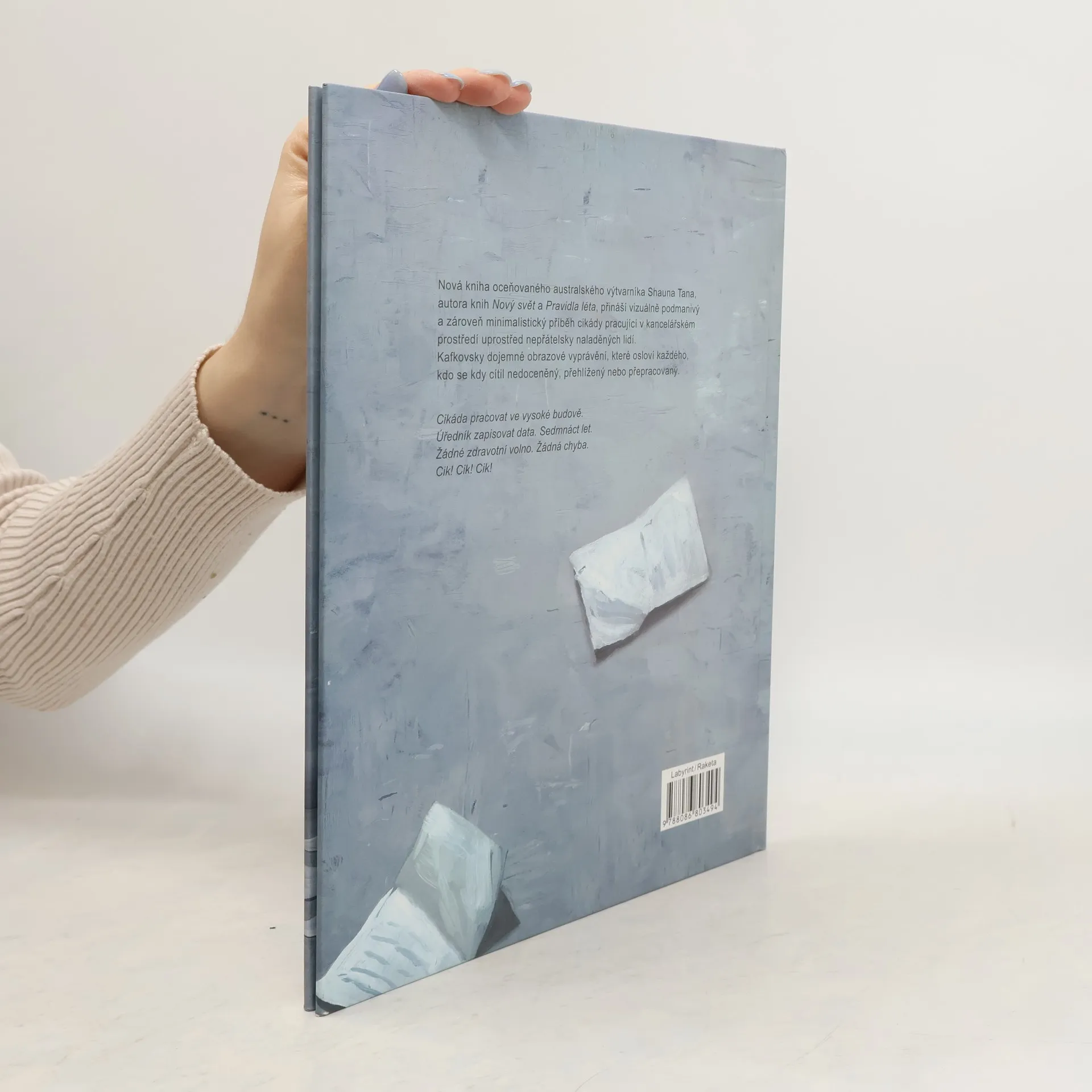 POZOR: Nejedná se o klasický komiks, ale o celostránkové barevné ilustrace, doprovozené vždy na protistraně krátkým textem! Nová kniha oceňovaného australského výtvarníka Shauna Tana, autora knih Nový svět a Pravidla léta, přináší vizuálně podmanivý a zároveň minimalistický příběh cikády pracující v kancelářském prostředí uprostřed nepřátelsky naladěných lidí. Kafkovsky dojemné obrazové vyprávění, které osloví každého, kdo se kdy cítil nedoceněný, přehlížený nebo přepracovaný.