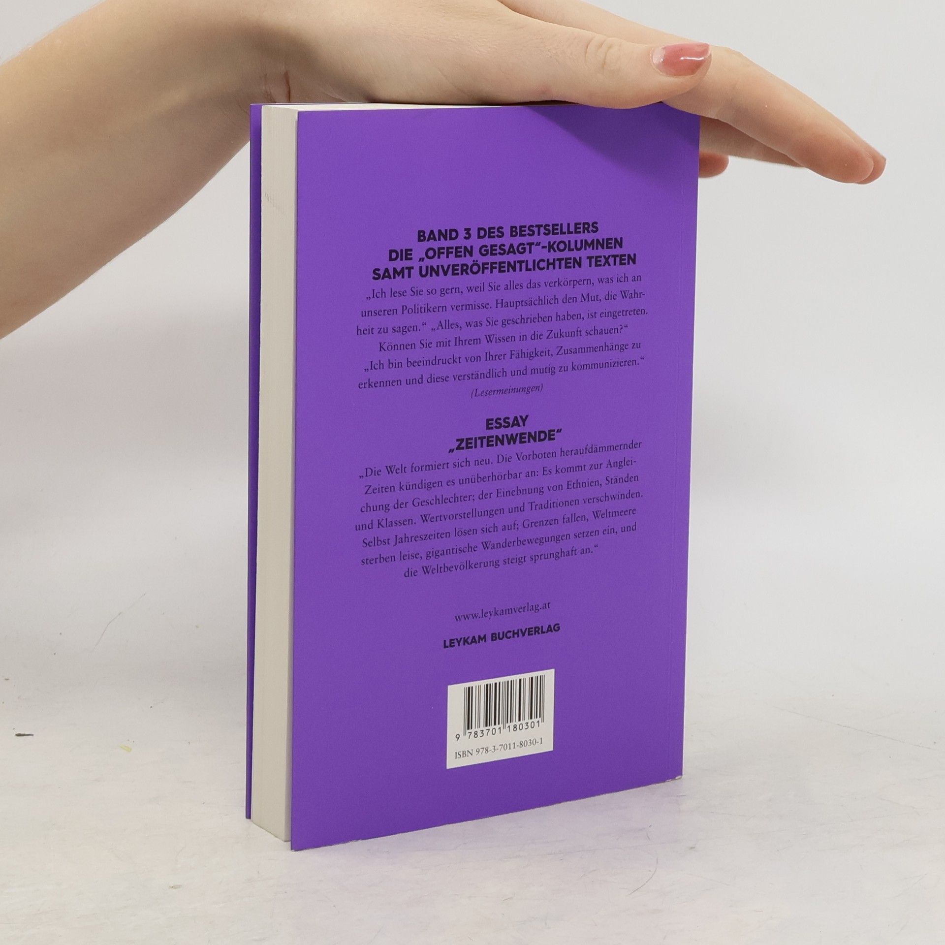 BAND 3 DES BESTSELLERS DIE „OFFEN GESAGT“-KOLUMNEN SAMT UNVERÖFFENTLICHTEN TEXTEN Dr. Tassilo Wallentin legt nun den dritten Band seiner Bestsellerreihe vor: die Chronologie der beliebten und von zahlreichen Lesern gesammelten „Offen gesagt“-Kolumnen samt dem Essay „Zeitenwende“, einem Gleichnis und unveröffentlichten Texten. Wie gewohnt: tiefgründig, humorvoll und respektlos gegenüber dem Zeitgeist. Und die LeserInnen sind begeistert: „Ich lese Sie so gern, weil Sie alles das verkörpern, was ich an unseren Politikern vermisse. Hauptsächlich den Mut, die Wahrheit zu sagen.“ „Alles, was Sie geschrieben haben, ist eingetreten. Können Sie mit Ihrem Wissen in die Zukunft schauen?“ „Ich bin beeindruckt von Ihrer Fähigkeit, Zusammenhänge zu erkennen und diese verständlich und mutig zu kommunizieren.“ ESSAY: „ZEITENWENDE“ „Die Welt formiert sich neu. Die Vorboten heraufdämmernder Zeiten kündigen es unüberhörbar an: Es kommt zur Angleichung der Geschlechter; der Einebnung von Ethnien, Ständen und Klassen. Wertvorstellungen und Traditionen verschwinden. Selbst Jahreszeiten lösen sich auf; Grenzen fallen, Weltmeere sterben leise, gigantische Wanderbewegungen setzen ein, und die Weltbevölkerung steigt sprunghaft an. Flüchtlingskrise | EU-Krise | Bankenrettung | Bildungspolitik | Gender