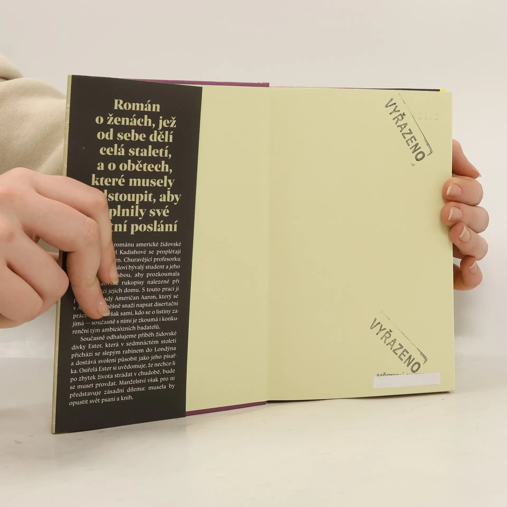 Román o ženách oddělených staletími a o obětech, které musely podstoupit, aby naplnily své životní poslání. V nejnovějším románu americké židovské autorky Rachel Kadishové se proplétají příběhy dvou žen. Churavějící profesorku historie Helen osloví bývalý student s prosbou, aby prozkoumala vzácné židovské rukopisy nalezené při rekonstrukci domu. Helen si na pomoc přizve mladého Američana Aarona, který se v Anglii neúspěšně pokouší napsat disertační práci. Nejsou však sami, kdo se o listiny zajímá — souběžně s nimi je zkoumá i konkurenční tým ambiciózních badatelů. Současně odhalujeme příběh dívky Ester, která v sedmnáctém století prchá před inkvizicí a v Londýně dostane svolení působit jako písařka slepého rabína. Osiřelá Ester dobře ví, že nechce-li po zbytek života strádat v chudobě, bude se muset provdat. Manželství však pro ni představuje zásadní dilema: musela by opustit svět knih a psaní.