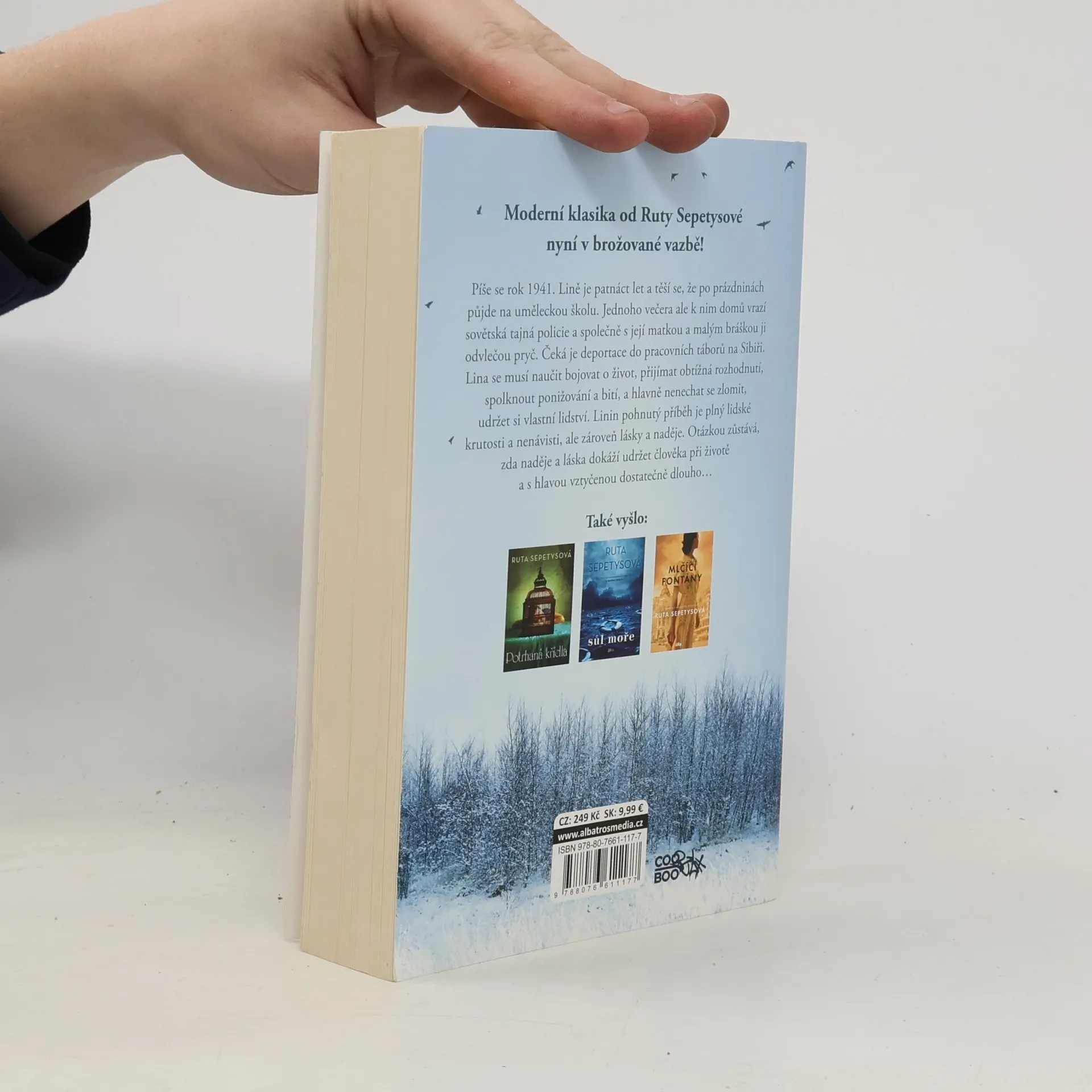 Moderní klasika od Ruty Sepetysové nově v brožované vazbě! Píše se rok 1941. Lině je patnáct let a těší se, že po prázdninách půjde na uměleckou školu. Jednoho večera ale k nim domů vrazí sovětská tajná policie a společně s její matkou a malým bráškou ji odvlečou pryč. Čeká je deportace do pracovních táborů na Sibiři. Lina se musí naučit bojovat o život, přijímat obtížná rozhodnutí, spolknout ponižování a bití, a hlavně se nenechat zlomit, udržet si vlastní lidství. A to se jí daří díky rodině a také lásce k výtvarnému umění.