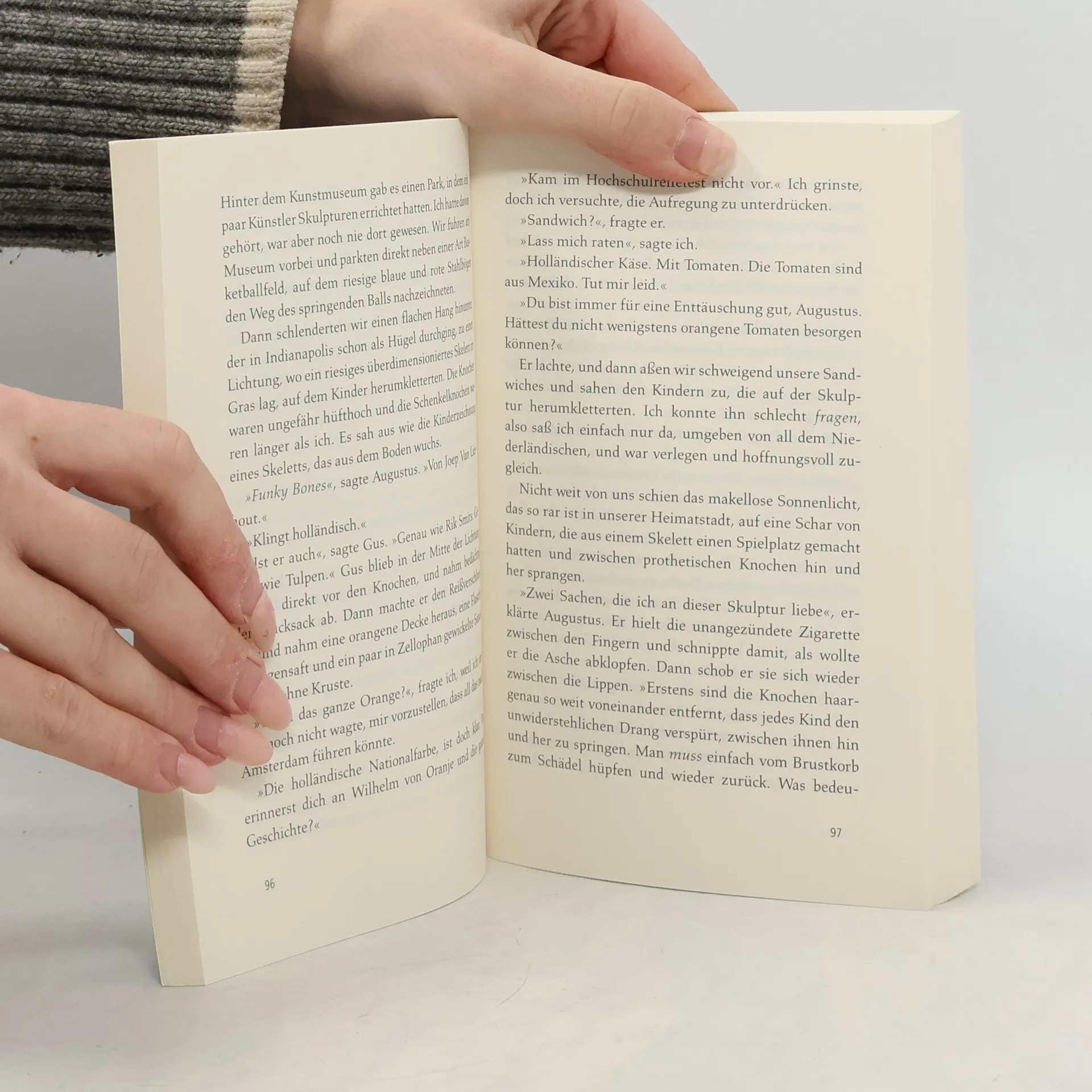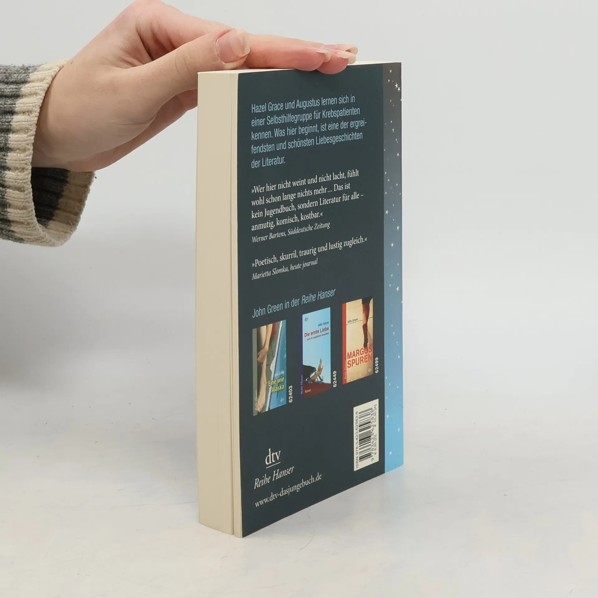 „Krebsbücher sind doof“, sagt die 16-jährige Hazel, die selbst Krebs hat. Sie will auf gar keinen Fall bemitleidet werden und kann mit Selbsthilfegruppen nichts anfangen. Bis sie in einer Gruppe auf den intelligenten, gut aussehenden und umwerfend schlagfertigen Gus trifft. Der geht offensiv mit seiner Krankheit um. Hazel und Gus diskutieren Bücher, hören Musik, sehen Filme und verlieben sich ineinander - trotz ihrer Handicaps und Unerfahrenheit. Gus macht Hazels großen Traum wahr: Gemeinsam fliegen sie nach Amsterdam, um dort Peter Van Houten zu treffen, den Autor von Hazels absolutem Lieblingsbuch. Ein tiefgründiges, emotionales und zugleich freches Jugendbuch über Krankheit, Liebe und Tod. Ausgezeichnet mit dem Deutschen Jugendliteraturpreis 2013 (Preis der Jugendjury).