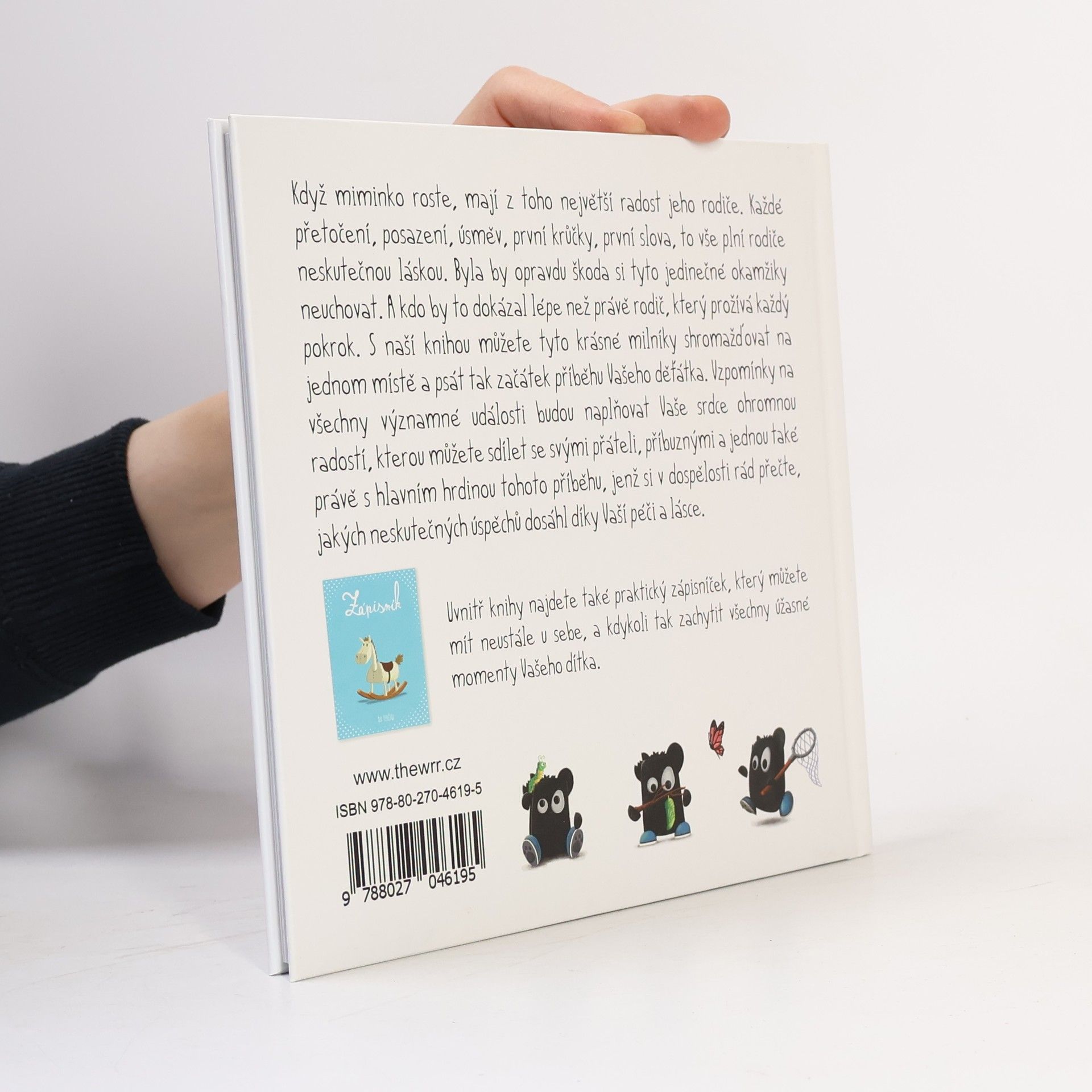 Když miminko roste, mají z toho největší radost jeho rodiče. Každé přetočení, posazení, úsměv, první krůčky, první slova, to vše plní rodiče neskutečnou láskou. Byla by opravdu škoda si tyto jedinečné okamžiky neuchovat. A kdo by to dokázal lépe než právě rodič, který prožívá každý pokrok. S naší knihou můžete tyto krásné milníky shromažďovat na jednom místě a psát tak začátek příběhu Vašeho děťátka. Vzpomínky na všechny významné události budou naplňovat Vaše srdce ohromnou radostí, kterou můžete sdílet se svými přáteli, příbuznými a jednou také právě s hlavním hrdinou tohoto příběhu, jenž si v dospělosti rád přečte, jakých neskutečných úspěchů dosáhl díky Vaší péči a lásce. Uvnitř knihy najdete také praktický zápisníček, který můžete mít neustále u sebe, a kdykoli tak zachytit všechny úžasné momenty Vašeho dítka.