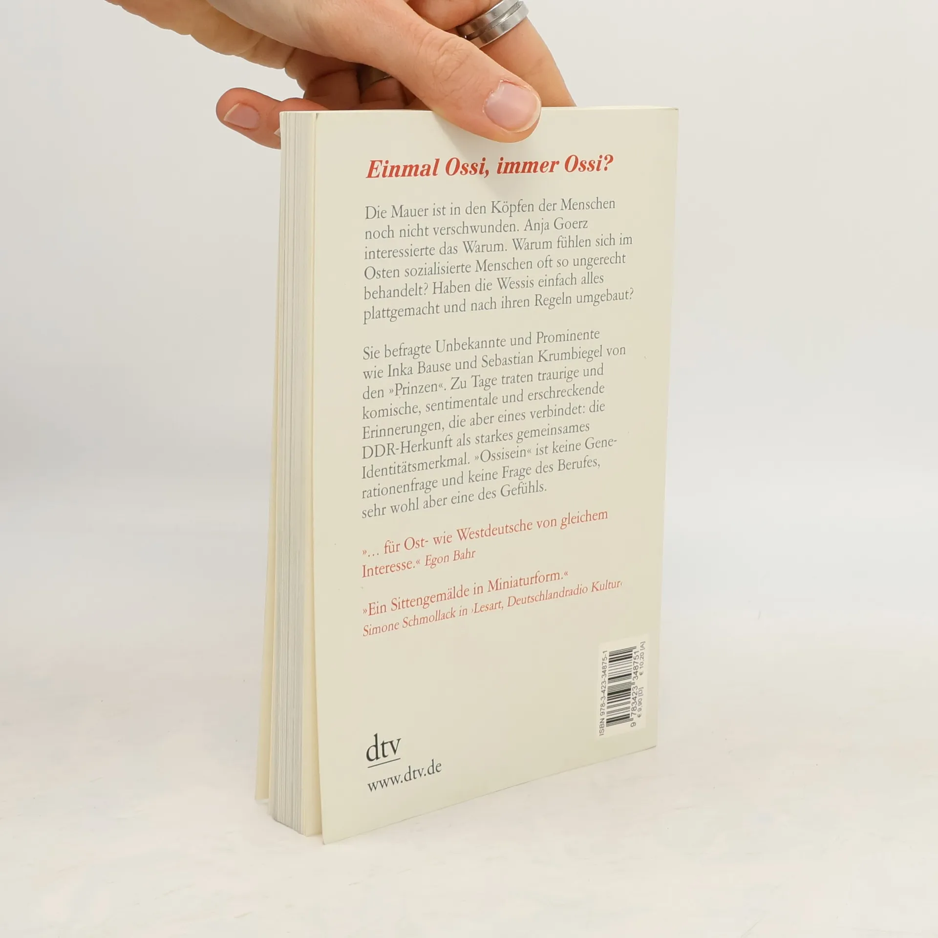 Einmal Ossi, immer Ossi? Auch heute noch ist die Mauer in den Köpfen der Menschen nicht verschwunden. Das erfährt Anja Goerz in ihrer täglichen Rundfunkarbeit. Deshalb wollte sie es genauer wissen: Warum fühlen sich im Osten sozialisierte Menschen oft so ungerecht behandelt? Stimmen die Behauptungen über das Verdrängen der Ossis von den Spitzen der Universitäten, Gerichte und Kliniken? Waren die Ossifrauen wirklich so viel emanzipierter? Haben die Wessis einfach alles plattgemacht und nach ihren Regeln umgebaut? Anja Goerz stellt ganz unterschiedliche Menschen aus der ehemaligen DDR vor. In die Porträts ist viel Biografisches eingeflossen, erzählt wird aber auch von Motivationen und Haltungen, Verletzungen und Chancen. Und es gibt auch den umgekehrten Blick von West nach Ost. So unterschiedlich die Erinnerungen sind, so haben sie doch die DDR-Herkunft als starkes Identitätsmerkmal gemein. »Ossi-Sein«, so zeigt sich, ist keine Generationen-Frage und keine Frage des Berufes, sehr wohl aber eine des Gefühls. »Ein Glück ist, dass Anja Goerz, eine westdeutsche Moderatorin, an der Nahtstelle des RBB kundige Menschen zusammengebracht hat, die erlebt und geschrieben haben, was an unterschiedlichem Denken und Empfinden noch immer geblieben ist. Das ist für Ost- wie Westdeutsche zum Teil aufregend, jedenfalls von gleichem Interesse. Dem Buch ist große Verbreitung zu wünschen.« Egon Bahr