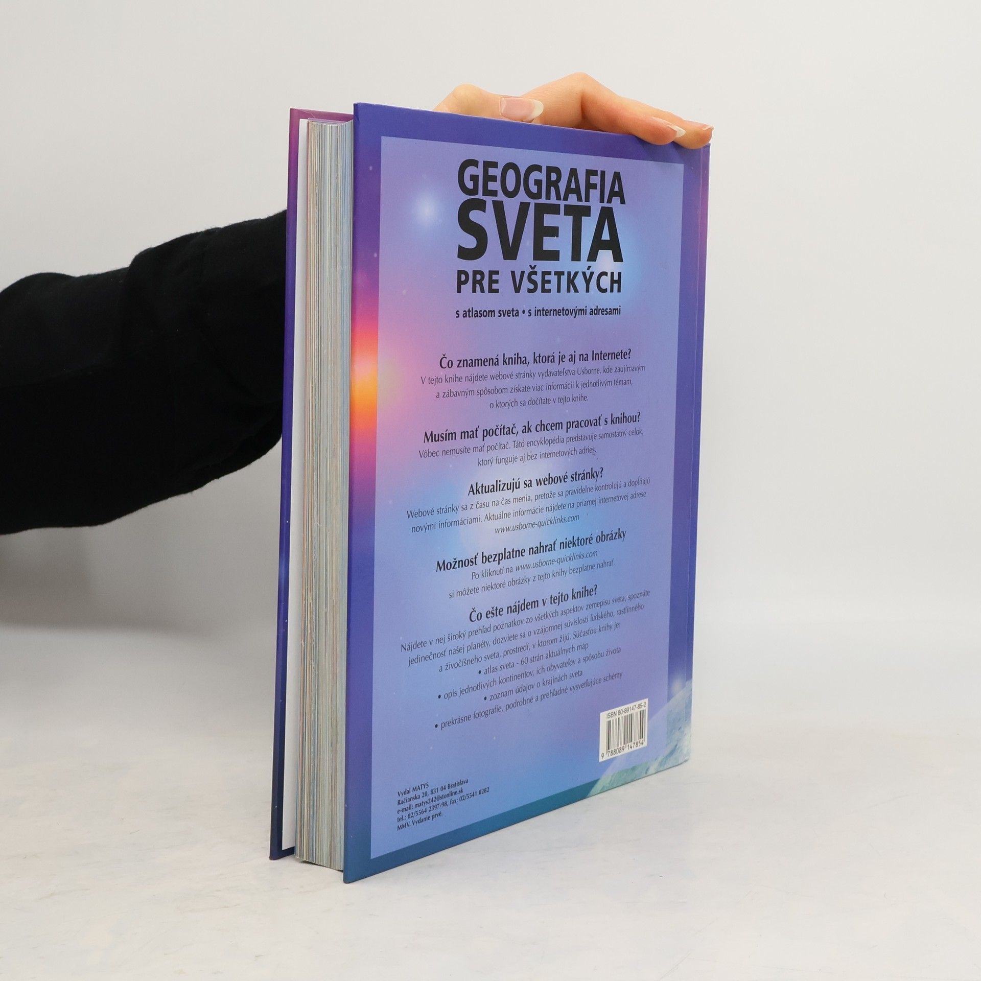 V tejto knihe nájdete webové stránky vydavateľstva Usborne, kde zaujímavým a zábyvným spôsobom získate informácie k jednotlivým témam o ktorých sa dočítate v tejto knihe. Okrem iného tu nájdete široký prehľad poznatkov zo všetkých aspektov zemepisu sveta, spoznáte jedinečnosť našej prírody, dozviete sa o vzájomnej súvislosti ľudského, rastlinného a živočíšneho sveta, prostredí v ktorom žijú. Súčasťou tejto knihy je: - atlas sveta - 60 strán aktuálnych máp - opis jednotlivých kontinentov, ich obyvateľov a spôosobe života - zoznam údajov o krajinách sveta - prekrásne fotografie, podrobné a prehľadné vysvetľujúce schémy