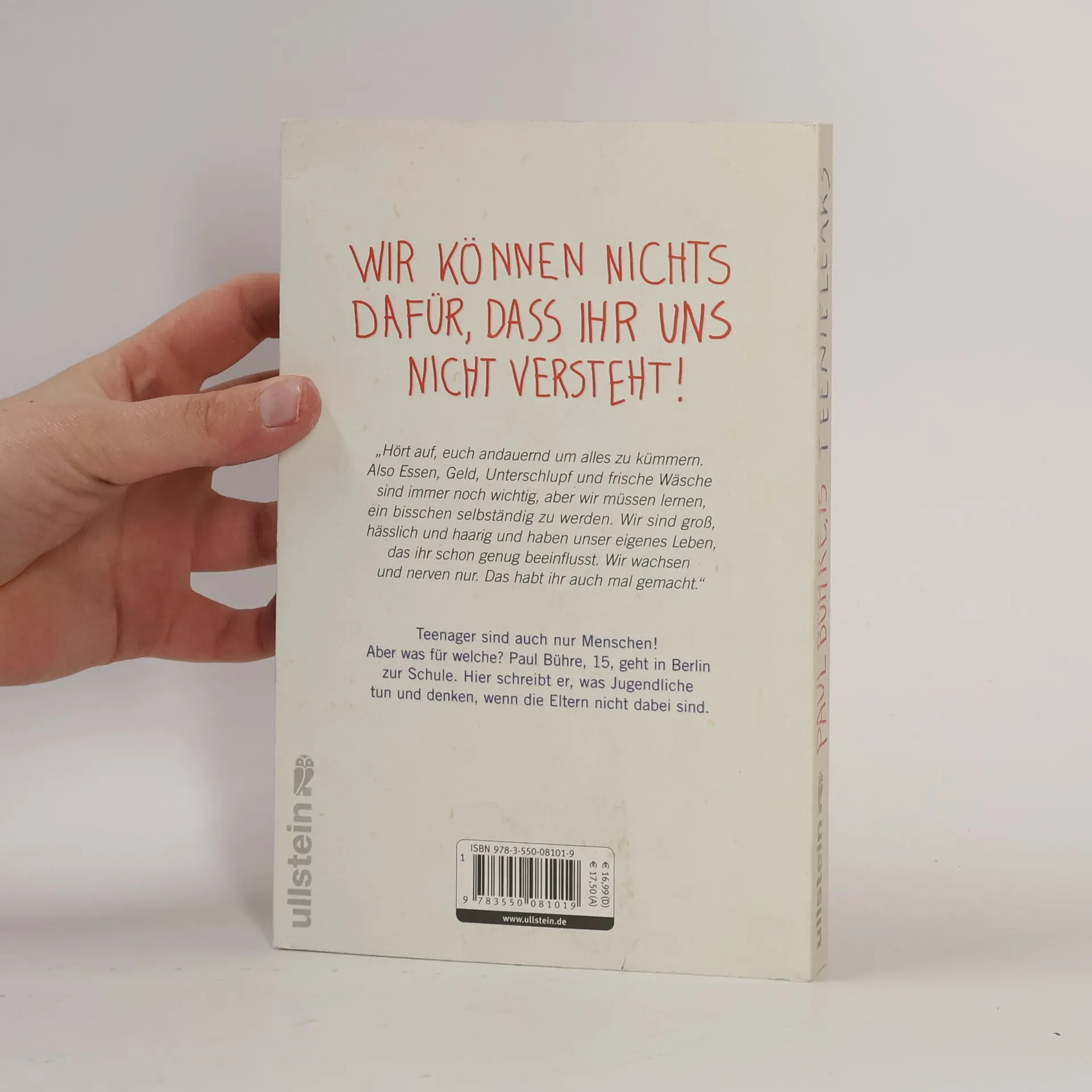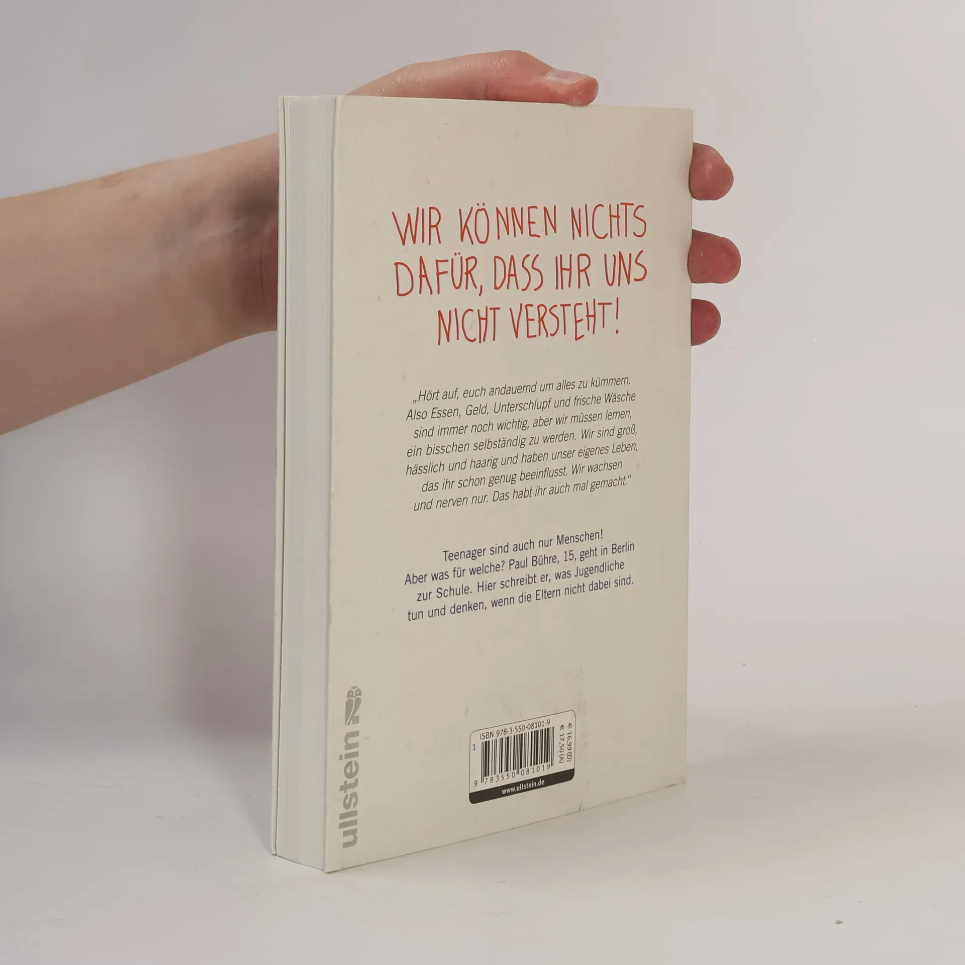 Teenager sind auch nur Menschen! Aber was für welche? Paul Bühre, 15, geht in Berlin zur Schule. Hier schreibt er, was Jugendliche tun und denken, wenn die Eltern nicht dabei sind. Konsumorientiert, pornographieverdorben und jederzeit bereit, das Geschenk von Oma gegen Gras oder Wodka-Energy einzutauschen? Bisher kennen wir den Pubertätsalltag hauptsächlich aus der Sicht von verunsicherten Eltern, überlasteten Lehrern oder gar Familientherapeuten. Jetzt gewährt erstmals ein 15-Jähriger Einblick in das, was ihm und seiner Generation wichtig ist. Er erzählt von Computerspielen, Unterhosenmoden, Mädchenkleidung, Schüleraustausch, Verliebtsein in Zeiten des Internets und diesen Momenten, in denen alles zu viel wird. Und von Eltern, die ständig nur das Beste wollen, aber damit genau das Gegenteil erreichen.