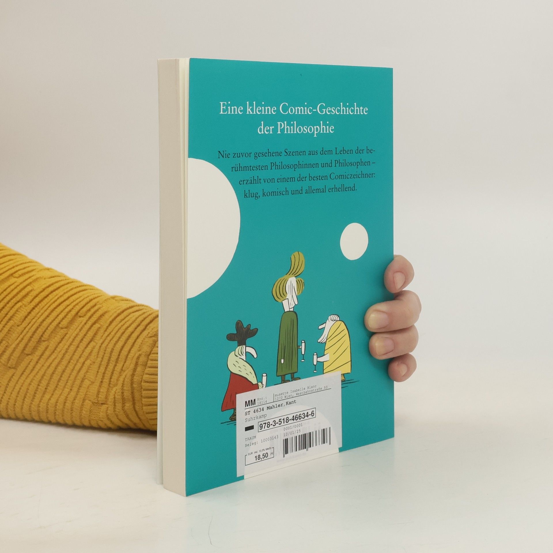 Nicolas Mahlers kleine Comic-Geschichte der Philosophie von Platon bis Foucault Philosophie ist unverständlich, langweilig und witzlos? Denkste! Das kann nur der behaupten, der noch nicht Nicolas Mahlers ebenso kluge wie subtil komische Comic-Geschichte der Philosophie kennt. Hier erzählt er bislang unbekannte Szenen aus dem Leben der 22 berühmtesten Philosophinnen und Philosophen: Wir erleben Partyspaß mit Kant, besuchen mit Hegel eine Kunstausstellung, sind mit Marx im Supermarkt und mit Nietzsche im Pfadfinderlager, gehen mit Deleuze ins Kino und feiern Traumhochzeit mit Simone de Beauvoir … Und auch wenn sich nichts so zugetragen hat, haben wir mehr über das Leben, Denken und Fühlen des jeweiligen Philosophen erfahren als je zuvor – und wie selten über die Absurdität unserer menschlichen Existenz gelacht.