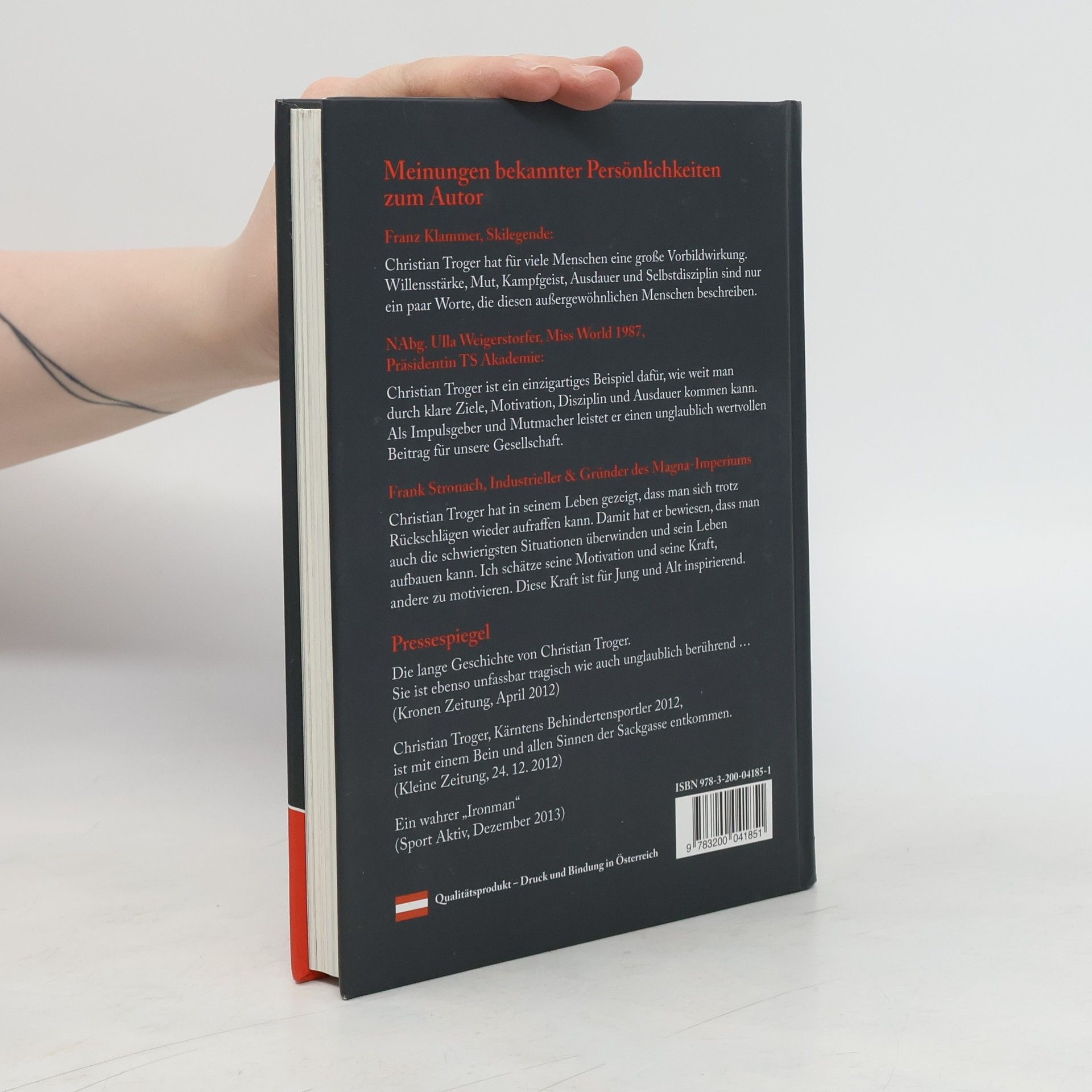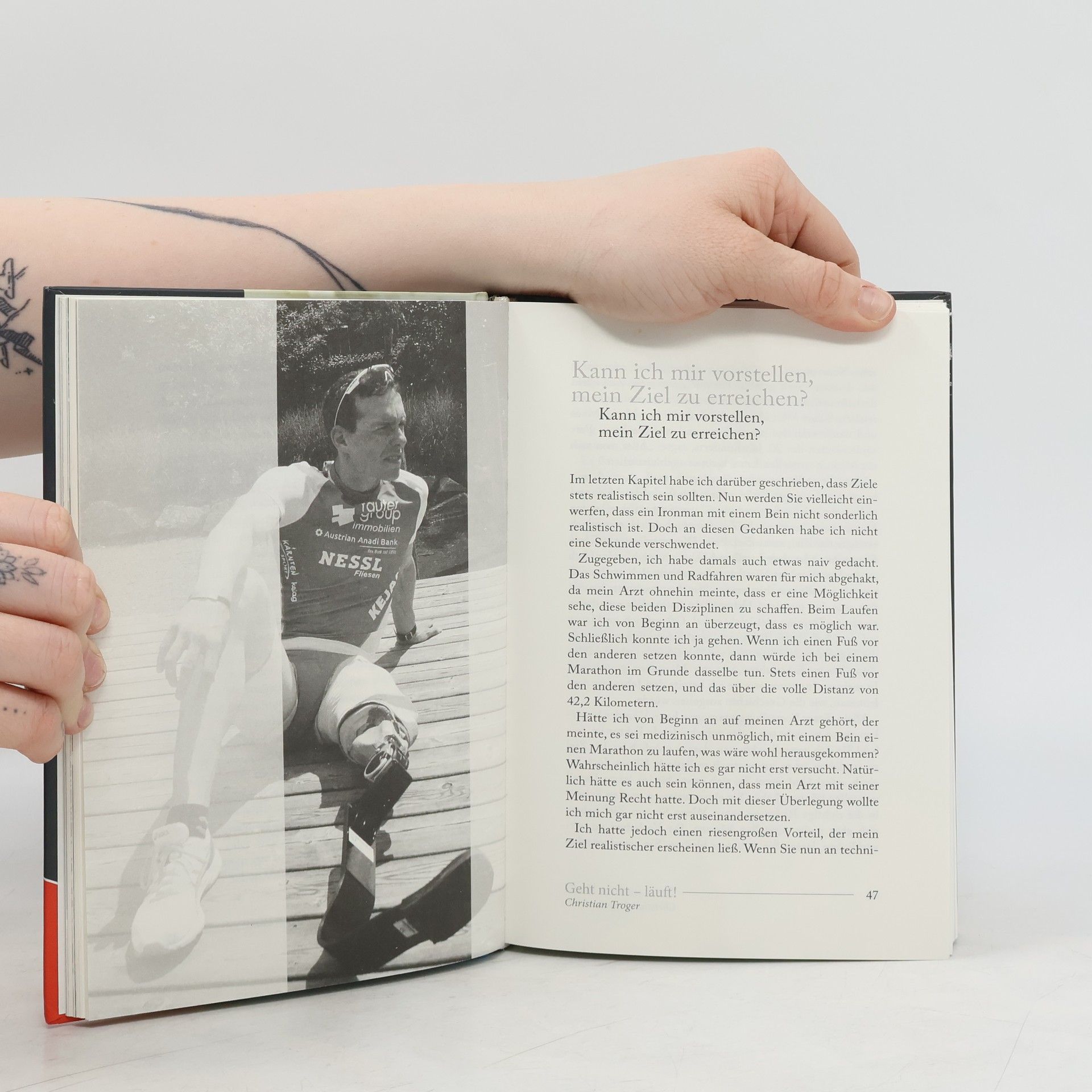 Christian Troger wurde am 8. Oktober 1983 ohne linkes Bein und Hüftpfanne geboren. Ärzte sagten seinen Eltern, dass er niemals gehen könne, doch mit 14 Monaten bewies er das Gegenteil. Mit 24 Jahren war Troger ein Kettenraucher, der ziellos durchs Leben ging und immer mehr Halt verlor. Die Beobachtung eines Ironman faszinierte ihn, und er setzte sich das scheinbar unmögliche Ziel, selbst an einem solchen Wettkampf teilzunehmen. 2011 erreichte er beim Ironman Austria nach 3,8 km Schwimmen, 180 km Radfahren und 42,2 km Laufen das Ziel. Heute ist er mehrfacher Welt- und Europameister und erzählt in seinem Buch seine persönliche Geschichte. Er beschreibt, wie er aus einer Lebenskrise herausfand und ein erfüllteres Leben führte. Troger teilt seine Erfahrungen im Umgang mit Extremsituationen, Ängsten und Niederlagen und lädt die Leser ein, das Leben durch seine Einsichten zu betrachten. Zudem zeigt er Bilder aus seiner Kindheit und von seinen größten Erfolgen. Franz Klammer schreibt im Vorwort, dass das Buch Menschen berühren und Hoffnung schenken soll, insbesondere jenen, die durch Schicksalsschläge vom Weg abgekommen sind. Der Verkauf des Buches unterstützt zudem die Franz Klammer Foundation, die Personen in Not im Zusammenhang mit Sport hilft.