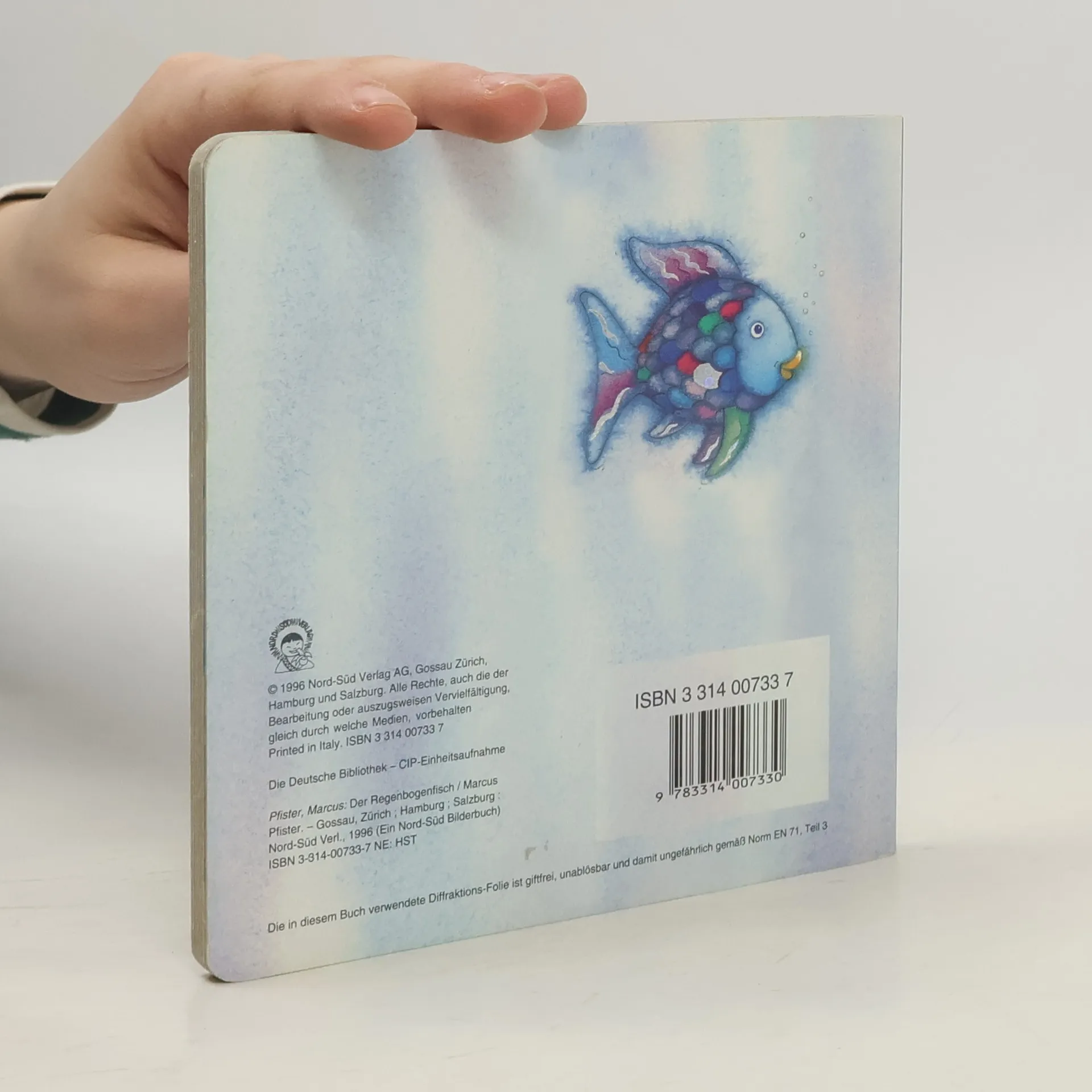 Der Erfolgstitel von 1992 (BA 1/93), der einen weiteren Band nach sich zog ("Regenbogenfisch komm hilf mir!", BA 11/95), auch in einer Riesenausgabe lieferbar, hat noch eine Schwester bekommen: eine Pappausgabe in kleinem Format, die Zahl der Bilder auf die Hälfte reduziert, der Text drastisch gekürzt, z.T. umformuliert und in die Gegenwart gebracht. Knapp wird nun das Wesentliche berichtet: der Regenbogenfisch ist zu stolz zum Teilen und vereinsamt. Erst als er von seinen glitzernden Schuppen abgibt, wird er glücklich. Die wesentlichen Teile der Bilder wurden nur um ein Drittel verkleinert, auch die eingeprägten Schuppen aus Diffraktionsfolie fehlen nicht, dafür wurden Randbeispiele abgeschnitten. Natürlich vermitteln die grossen Bilder mehr Weite, als stärkeren Eingriff empfinde ich den neuen Text. Der märchenhafte Klang, der gut zu den Illustrationen passte, fehlt. 4jährige brauchen keine Pappbände mehr. Für Bibliotheken würde ich trotz des stolzen Preises von inzwischen DM 29,80 die Originalausgabe vorziehen
