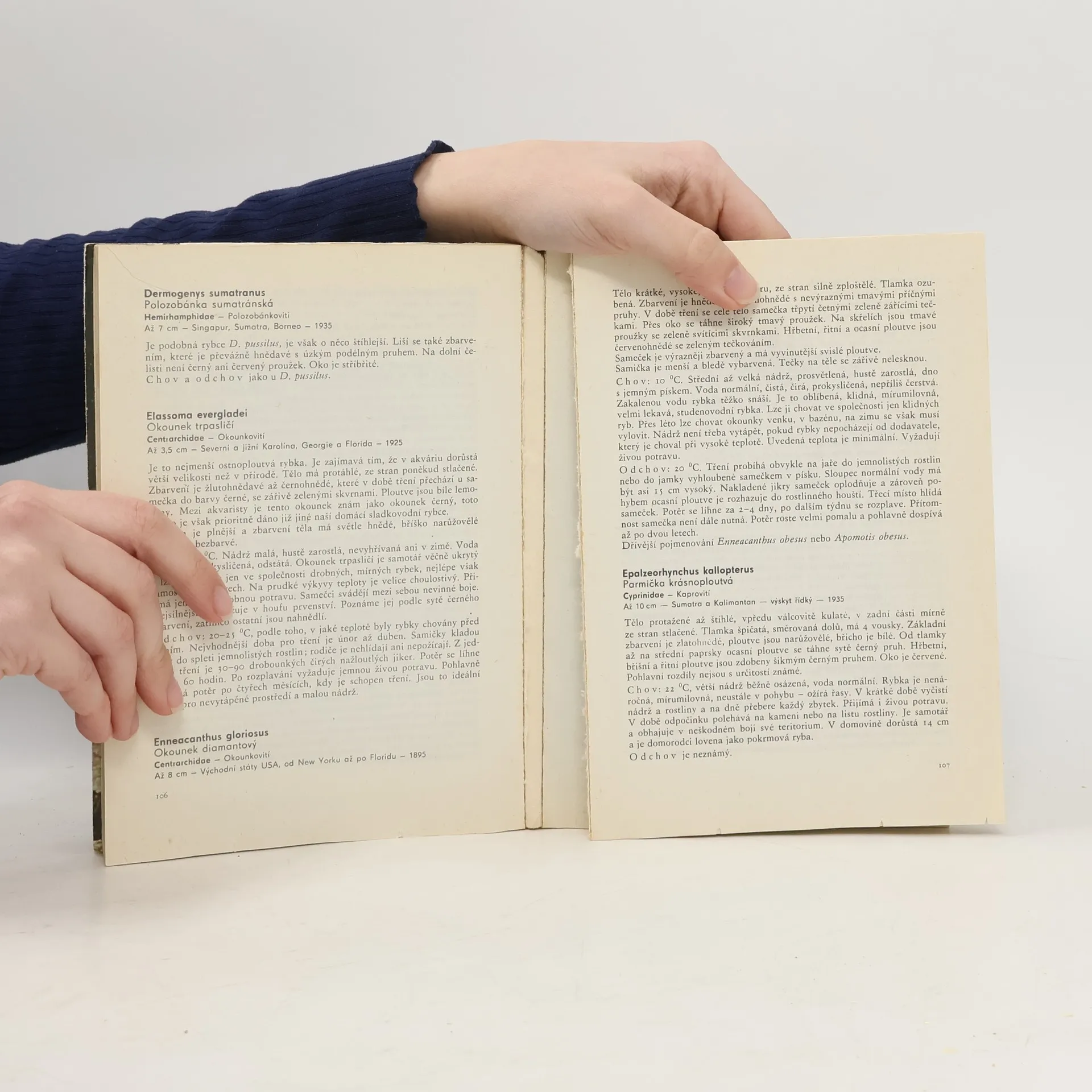 Při popisu jednotlivých druhů akvarijních ryb uvádí autor kromě latinského a českého názvu i příslušnou čeleď, maximální velikost, místo původu, rok dovozu do Evropy, popis ryby, její chov a odchov. Publikace je uvedenavšeobecnou statí o chovu akvarijních ryb, jejich krmení apod. 8. upravené vydání.