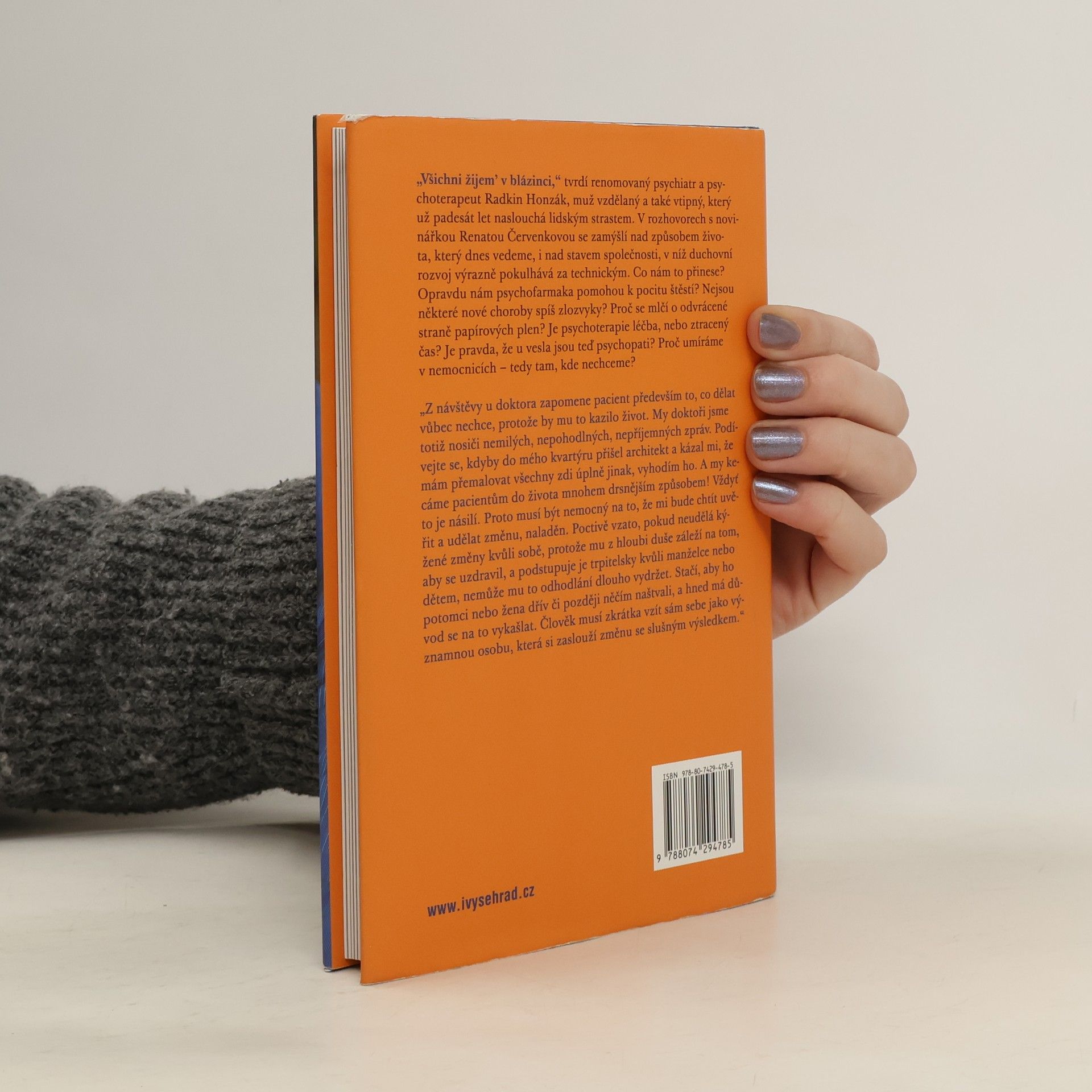 „Všichni žijem’ v blázinci,“ tvrdí renomovaný psychiatr a psychoterapeut Radkin Honzák, který již padesát let naslouchá lidským strastem. V rozhovorech s novinářkou Renatou Červenkovou se zamýšlí nad naším způsobem života a stavem společnosti, v níž duchovní rozvoj zaostává za technickým pokrokem. Jaké to má důsledky? Pomohou nám psychofarmaka k pocitu štěstí? Jsou některé nové choroby spíše zlozvyky? Proč se mlčí o negativních stránkách papírových plen? Je psychoterapie skutečně léčbou, nebo ztraceným časem? A co psychopati u vesla? Proč umíráme v nemocnicích, kde to nechceme? Témata rozhovorů nejsou povzbudivá, ale Radkin Honzák je komentuje s ironií a humorem, přičemž upozorňuje na fenomény dnešní doby, které se „příčí Matce přírodě“ a zajišťují psychiatrům dostatek pacientů i do budoucna. Radkin Honzák (* 1939) po promoci na Fakultě všeobecného lékařství UK v Praze 1962 pracoval jako sekundární lékař v psychiatrické léčebně Kosmonosy a poté jako psychiatr – konzultant v Ústavu pro výzkum výživy a později v IKEM. Dnes je asistentem Ústavu všeobecného lékařství 1. Lékařské fakulty UK, ambulantním psychiatrem IKEM a sekundárním lékařem PL Bohnice.