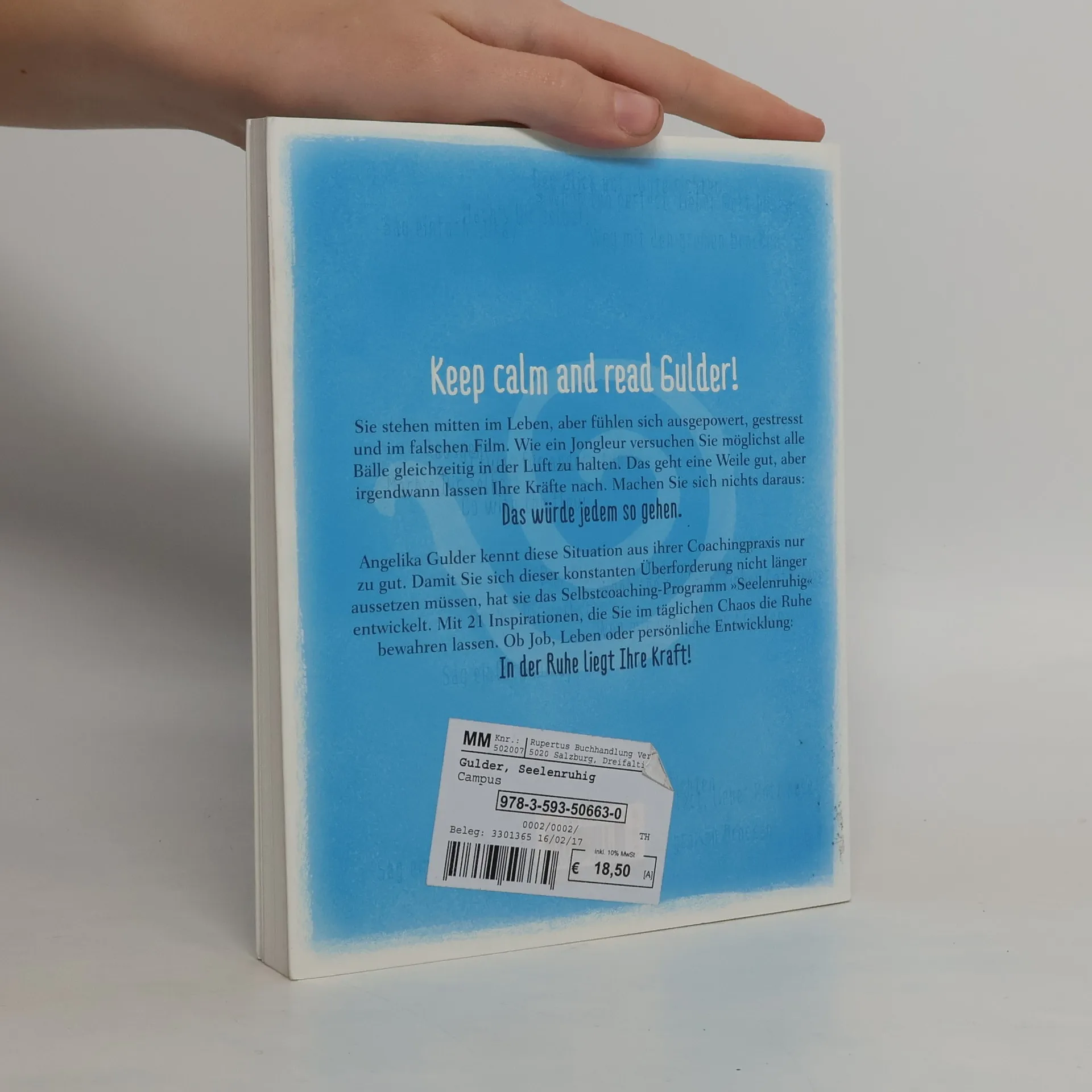 Keep calm and read Gulder! Sie steht mitten im Leben, aber fühlt sich ständig ausgepowert, gestresst und im falschen Film. Oktopusgleich versucht die souveräne Frau von heute möglichst alle Bälle gleichzeitig in der Luft zu halten: „Und - hey! - wenn acht gehen, dann gehen auch zehn! Ach warte - geht ja doch nicht …“ Crash, boom, bang! Angelika Gulder kennt diese Fälle aus ihrer Coachingpraxis nur zu gut. Damit es erst gar nicht zu dieser konstanten Selbstüberforderung kommt, hat sie das Seelenruhig-Selbstcoaching-Programm entwickelt. Mit 21 Inspirationen, die uns im täglichen Chaos die Ruhe bewahren lassen. Ob Job, Leben oder persönliche Entwicklung: In der Ruhe liegt Ihre Kraft! - Gulder hat mit „Seelenruhig“ ein Inspirierendes Selbstcoaching-Buch für Menschen geschrieben, die mitten im Leben stehen. - Das Buch liefert konkrete Anleitungen für ein entspanntes und glückliches Leben. - Wer einen Erste-Hilfe-Koffer für schwierige Zeiten oder stressige Lebensphasen braucht, ist bei Angelika Gulder absolut richtig!