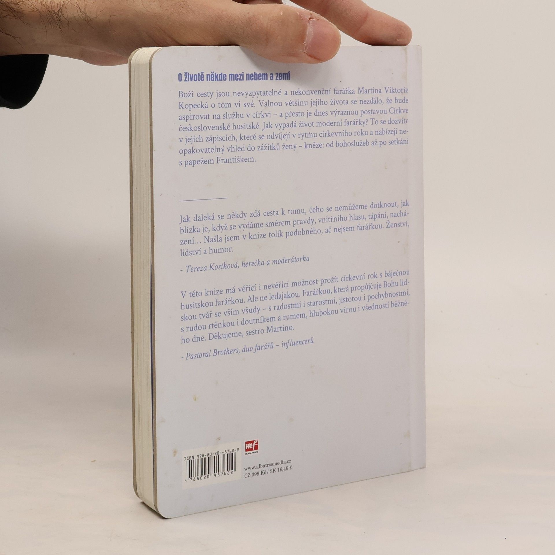 O životě někde mezi nebem a zemí. „Proboha! Tohle všechno se stalo za tři roky?“ Boží cesty jsou nevyzpytatelné a nekonvenční farářka Martina Viktorie Kopecká o tom ví své. Valnou většinu jejího života to nevypadalo, že bude aspirovat na službu v církvi – a přesto je dnes výraznou postavou Církve československé husitské. Knižní vydání blogu Deník farářky přináší zápisky posledních tří let a provádí čtenáře celým církevním rokem, který začíná adventem. Jaké to je být ženou – knězem? Čeho se kvůli službě musela vzdát? O čem přemýšlí, jak podle ní vypadá ráj a co by nám Ježíš pověděl, kdyby žil v dnes? S jakými předsudky se musí v životě vyrovnávat? V knize najdete úvahy, které se zdaleka netočí jen okolo náboženství, ale také vyprávění z cest po světě, příhody možné i dost nemožné, fotky, výstřižky z rozhovorů, vzpomínky na setkání, která mladé farářce bezmála změnila život. Přečtete si také její kázání, sny i otázky, na které není snadné odpovědět. Kniha vznikala v době pandemie, a tak se nevyhýbá ani tématům křehkosti života, smrti a snaze porozumět, co se to v naší společnosti děje, kam se poděla víra i kde hledat pevnou půdu pod nohama.