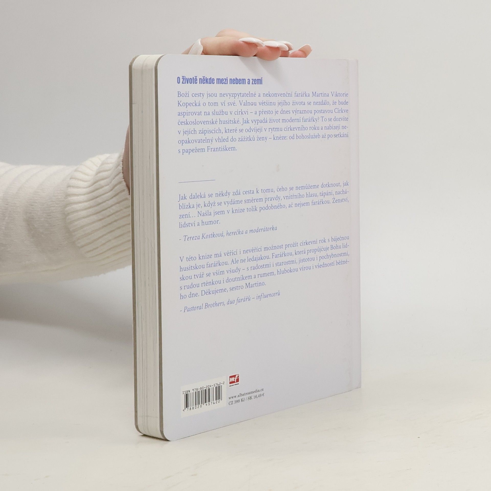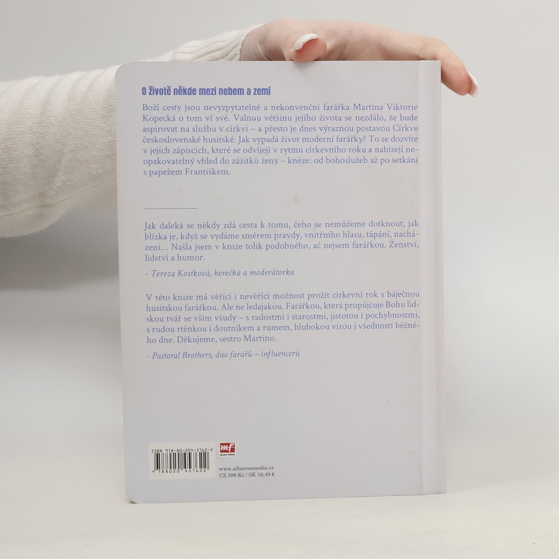 O životě někde mezi nebem a zemí. „Proboha! Tohle všechno se stalo za tři roky?“ Boží cesty jsou nevyzpytatelné a nekonvenční farářka Martina Viktorie Kopecká o tom ví své. Valnou většinu jejího života to nevypadalo, že bude aspirovat na službu v církvi – a přesto je dnes výraznou postavou Církve československé husitské. Knižní vydání blogu Deník farářky přináší zápisky posledních tří let a provádí čtenáře celým církevním rokem, který začíná adventem. Jaké to je být ženou – knězem? Čeho se kvůli službě musela vzdát? O čem přemýšlí, jak podle ní vypadá ráj a co by nám Ježíš pověděl, kdyby žil v dnes? S jakými předsudky se musí v životě vyrovnávat? V knize najdete úvahy, které se zdaleka netočí jen okolo náboženství, ale také vyprávění z cest po světě, příhody možné i dost nemožné, fotky, výstřižky z rozhovorů, vzpomínky na setkání, která mladé farářce bezmála změnila život. Přečtete si také její kázání, sny i otázky, na které není snadné odpovědět. Kniha vznikala v době pandemie, a tak se nevyhýbá ani tématům křehkosti života, smrti a snaze porozumět, co se to v naší společnosti děje, kam se poděla víra i kde hledat pevnou půdu pod nohama.