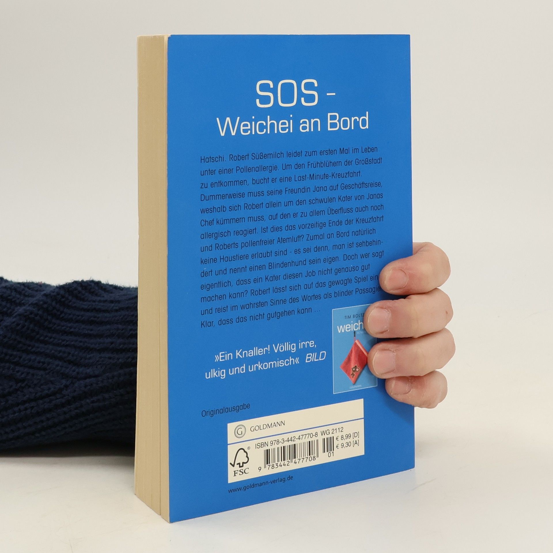 SOS - Weichei an Bord Hatschi. Robert Süßemilch leidet zum ersten Mal im Leben unter einer Pollenallergie. Um den Frühblühern der Großstadt zu entkommen, bucht er eine Last-Minute-Kreuzfahrt. Dummerweise muss seine Freundin Jana auf Geschäftsreise, weshalb sich Robert allein um den schwulen Kater von Janas Chef kümmern muss, auf den er zu allem Überfluss auch noch allergisch reagiert. Ist dies das vorzeitige Ende der Kreuzfahrt und Roberts pollenfreier Atemluft? Zumal an Bord natürlich keine Haustiere erlaubt sind – es sei denn, man ist sehbehindert und nennt einen Blindenhund sein eigen. Doch wer sagt eigentlich, dass ein Kater diesen Job nicht genauso gut machen kann? Robert lässt sich auf das gewagte Spiel ein und reist im wahrsten Sinne des Wortes als blinder Passagier. Klar, dass das nicht gutgehen kann ...