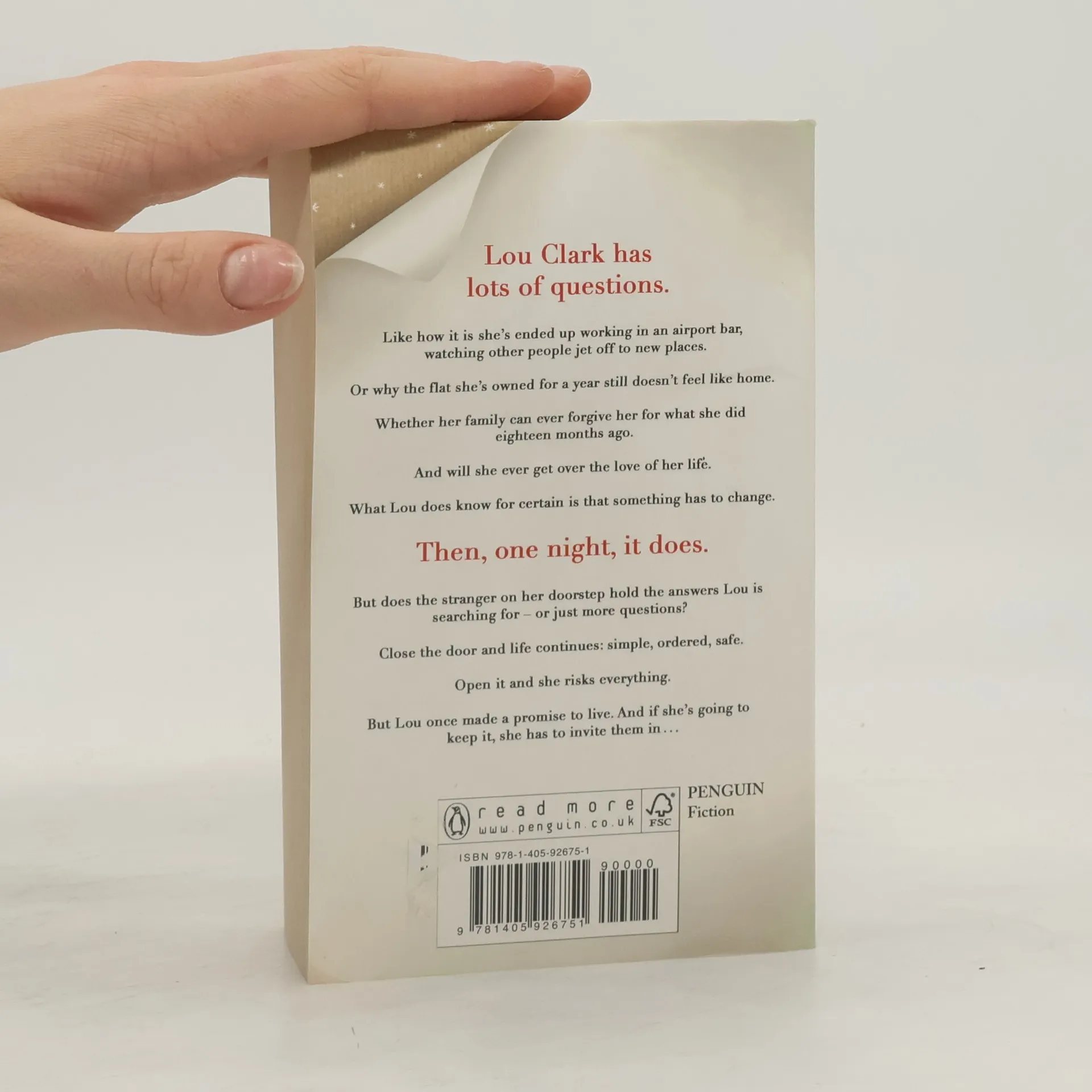 Lou Clark has lots of questions. Like how it is she's ended up working in an airport bar, watching other people jet off to new places. Or why the flat she's owned for a year still doesn't feel like home. Whether her family can ever forgive her for what she did eighteen months ago. And will she ever get over the love of her life. What Lou does know for certain is that something has to change. Then, one night, it does. But does the stranger on her doorstep hold the answers Lou is searching for - or just more questions ? Close the door and life continues : simple, ordered, safe. Open it and she risks everything. But Lou once made a promise to live. And if she's going to keep it, she has to invite them in...