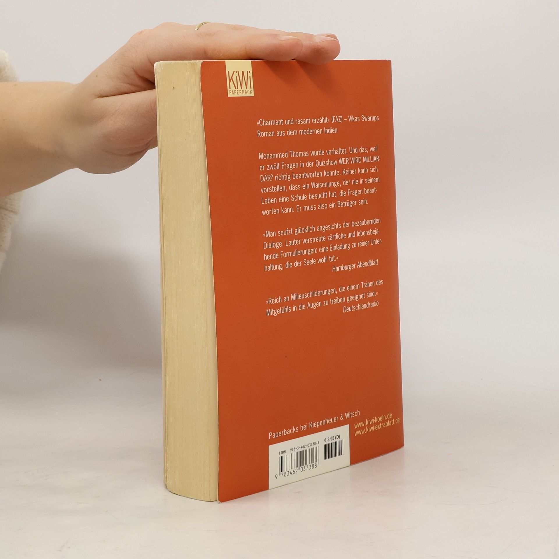 »Charmant und rasant erzählt« (FAZ) – Vikas Swarups Roman aus dem modernen Indien Warum sitzt ein armer indischer Kellner im Gefängnis? Er hat a) zu viel Whisky getrunken b) Geld aus der Kasse geklaut c) sich mit einem Kunden geprügelt d) in einer Quizshow gewonnen Mohammed Thomas wurde verhaftet. Und das, weil er zwölf Fragen in der Quizshow WER WIRD MILLIARDÄR? richtig beantworten konnte. Keiner kann sich vorstellen, dass ein Waisenjunge, der nie in seinem Leben eine Schule besucht oder eine Zeitung gelesen hat, weiß, wie der kleinste Planet unseres Sonnensystems heißt oder welche Stücke aus der Feder Shakespeares stammen. Er muss also ein Betrüger sein. Gemeinsam mit einer Anwältin, die wie die gute Fee aus dem Märchen im Gefängnis erscheint und Ram helfen will, schaut er sich die Videoaufzeichnung der Quizshow an, und erzählt ihr und dem Leser aus seinem unglaublichen Leben. Nach und nach wird klar, warum er die richtigen Antworten wusste. Rupien! Rupien! wurde 2009 verfilmt (Slumdog Millionär).