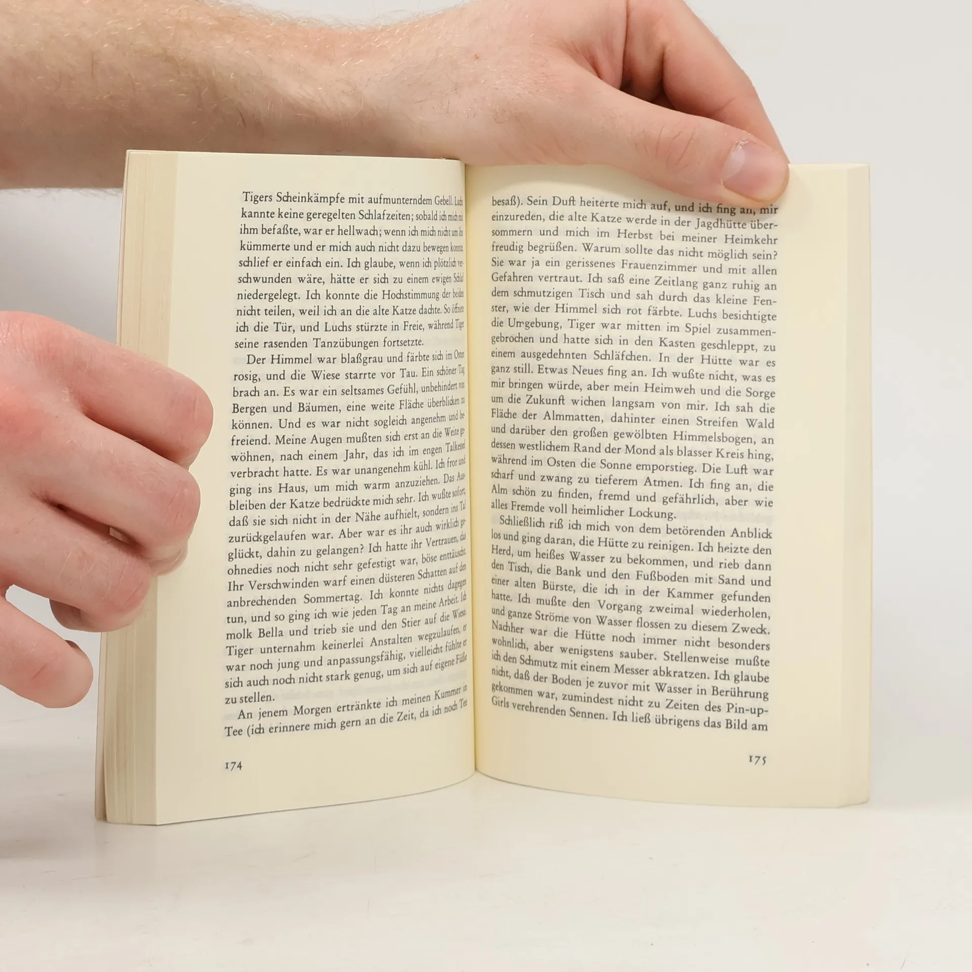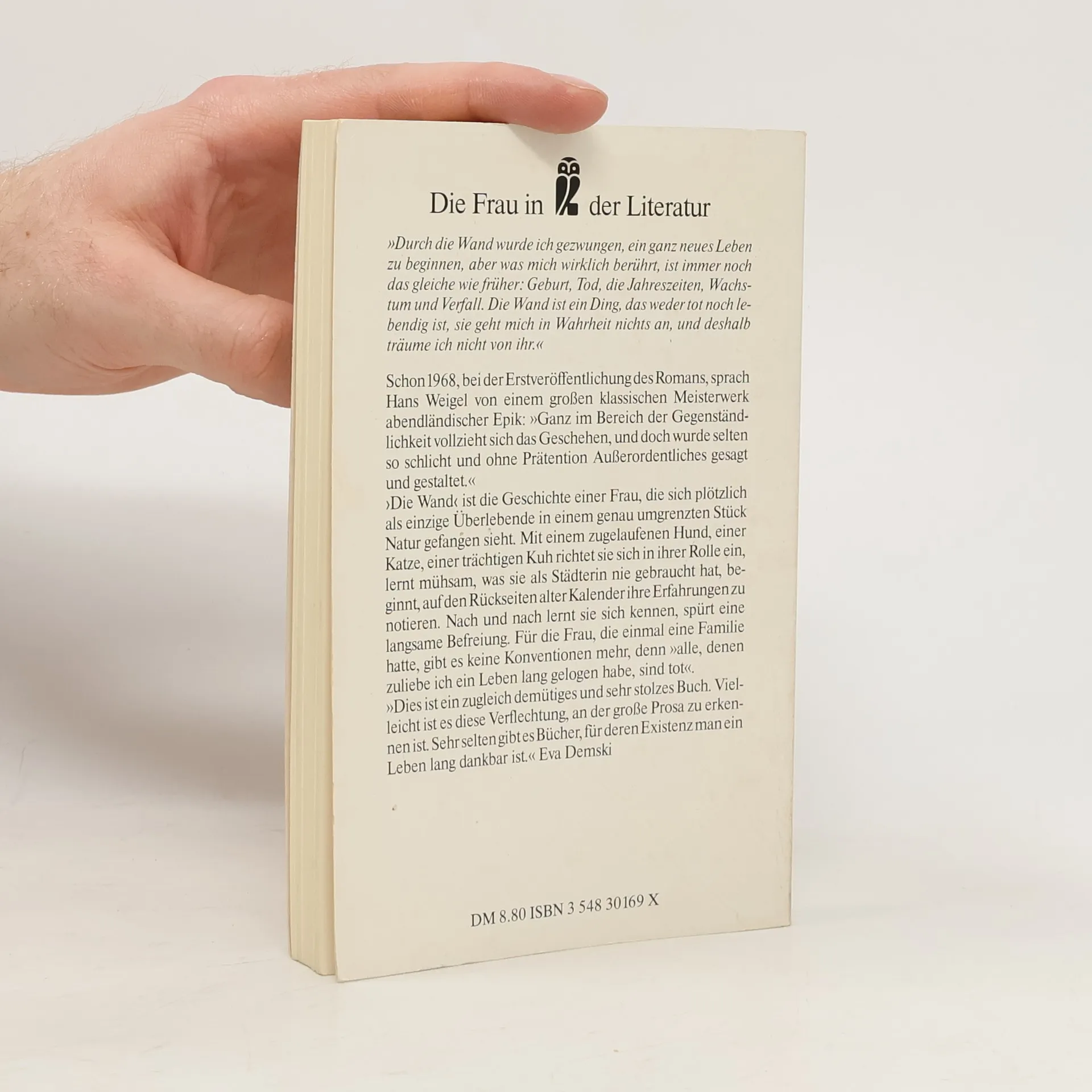 Die Geschichte einer Frau, die sich plötzlich als einzige Überlebende in einem genau umgrenzten Stück Natur gefangen sieht. Mit einem zugelaufenen Hund, einer Katze, einer trächtigen Kuh richtet sie sich in ihrer Rolle ein, lernt mühsam, was sie als Städterin nie gebraucht hat, beginnt auf den Rückseiten alter Kalender ihre Erfahrungen zu notieren. Nach und nach lernt sie sich kennen, spürt eine langsame Befreiung. Für die Frau, die einmal eine Familie hatte, gibt es keine Konventionen mehr, denn "alle, denen zuliebe ich ein Leben lang gelogen habe, sind tot". (Klappentext)