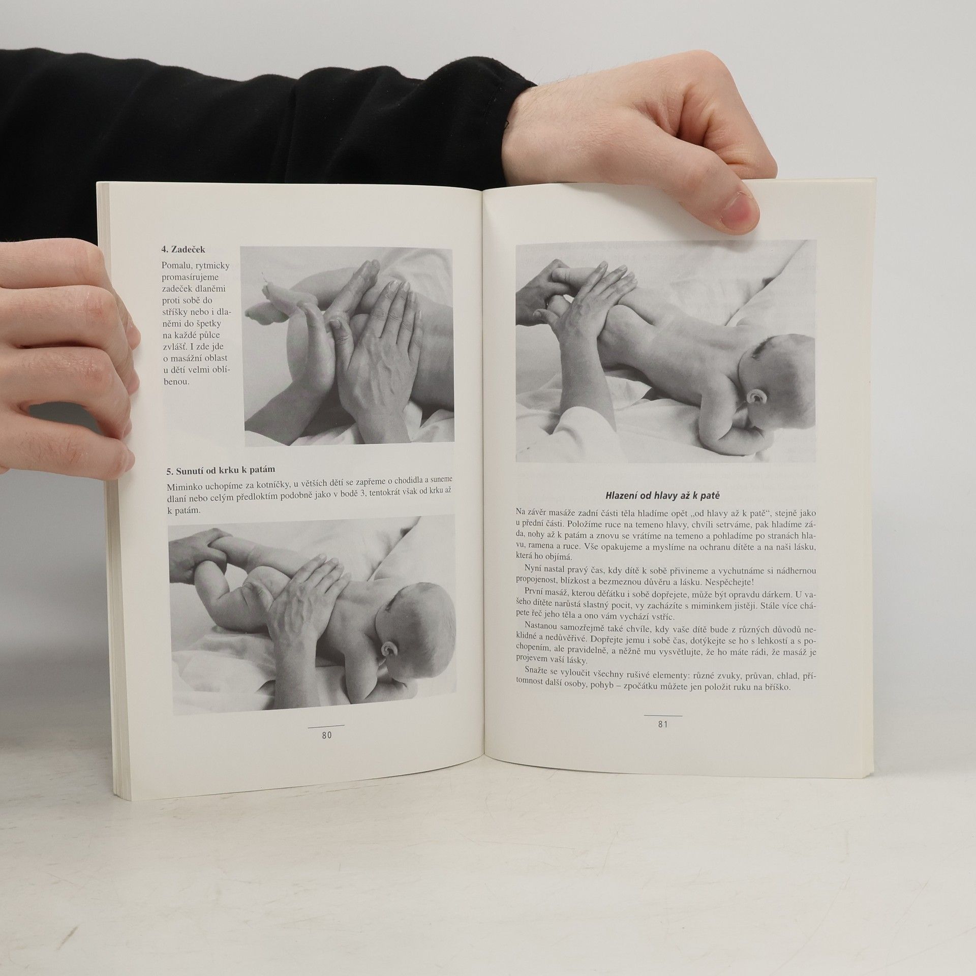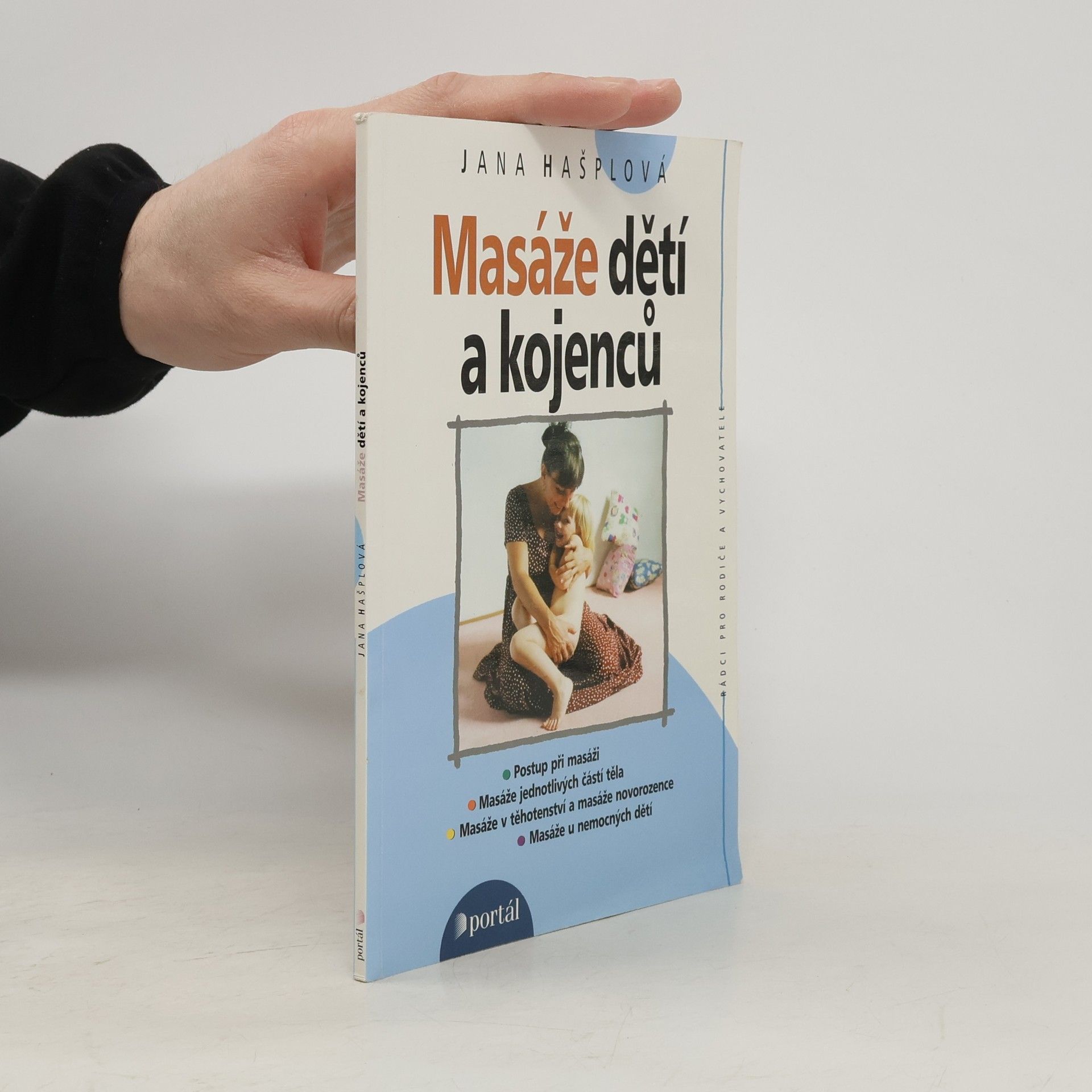 Postup při masáži, masáže jednotlivých částí těla, masáže v těhotenství a masáže novorozence, masáže u nemocných dětí. Názorné a přehledné uvedení do techniky masáží dětí a kojenců určené ať už pro výukové kurzy, pro profesionální pracovníky i pro samotné rodiče. Po teoretickém uvedení do problematiky masáží (účinnost masáží u zdravých i nemocných dětí, význam doteku jako součásti komunikace s dítětem, souvislosti a aroma- a muzikoterapií...) tvoří jádro knihy vlastní technika masáže, jež je ilustrována na cca. 75 fotografiích, které zájemcům pomohou osvojit si vlastní postup.
