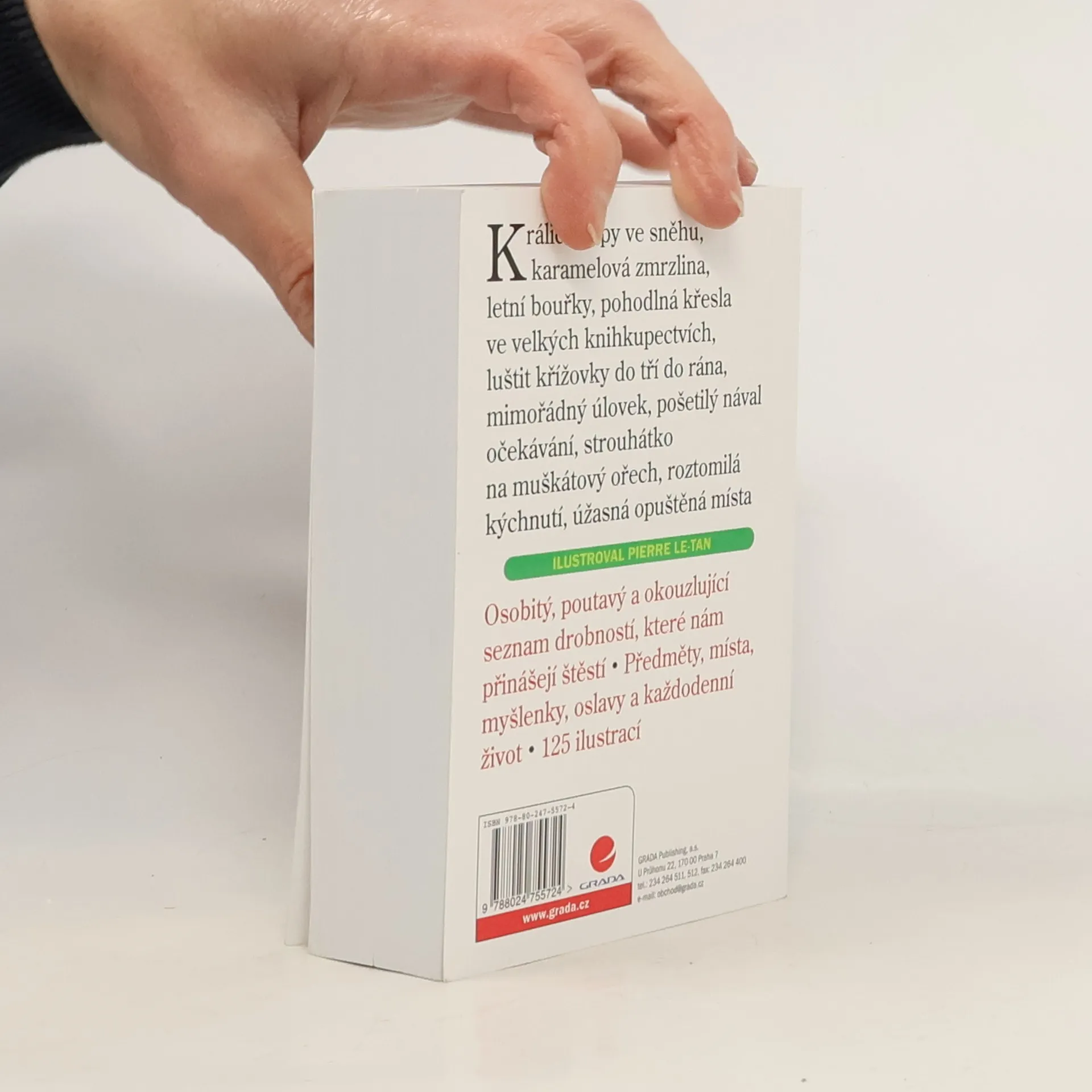 Můžete se pustit do čtení: králičí stopy ve sněhu, karamelová zmrzlina, letní bouřka, nadýchaný polštář, koupě letních sandálů, sbírání borůvek během výletu, urovnání rodinného sporu, zapnuté mlhovky, kočka milující fleece, nové tapety, … Autorka tohoto bestselleru, Barbara Ann Kipferová, si už jako dítě začala psát seznam věcí, které jí těší a dělají radost. Žádné rozbory, žádné názory, žádné poznámky pod čarou – jen jasný seznam milých a pozitivních věcí a zážitků. Je tak snadné se inspirovat, polemizovat či doplnit seznam o své vlastní body.