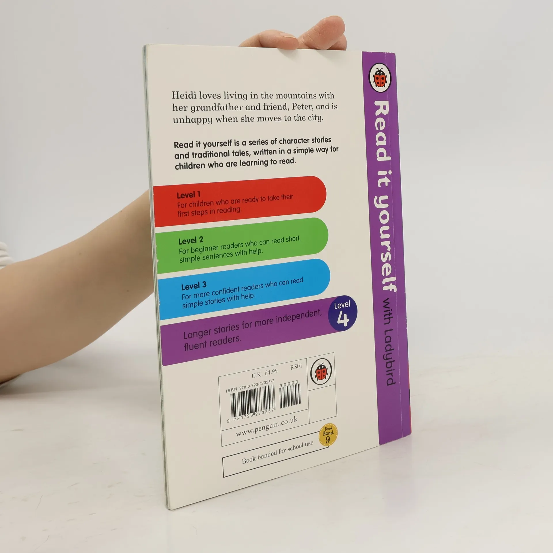 Based on the classic story by Johanna Spyri. Heidi loves living in the mountains with her grandfather and her friend Peter, and is homesick when she moves to Frankfurt. Will she make it back to her beloved mountains? Read it yourself with Ladybird is one of Ladybird's best-selling series. For over thirty-five years it has helped young children who are learning to read develop and improve their reading skills. Each Read it yourself book is very carefully written to include many key, high-frequency words that are vital for learning to read, as well as a limited number of story words that are introduced and practised throughout. Simple sentences and frequently repeated words help to build the confidence of beginner readers and the four different levels of books support children all the way from very first reading practice through to independent, fluent reading. Each book has been carefully checked by educational consultants and can be read independently at home or used in a guided reading session at school. Further content includes comprehension puzzles, helpful notes for parents, carers and teachers, and book band information for use in schools. Heidi is a Level 4 Read it yourself title, ideal for children who are ready to read longer stories with a wider vocabulary and are keen to read independently.