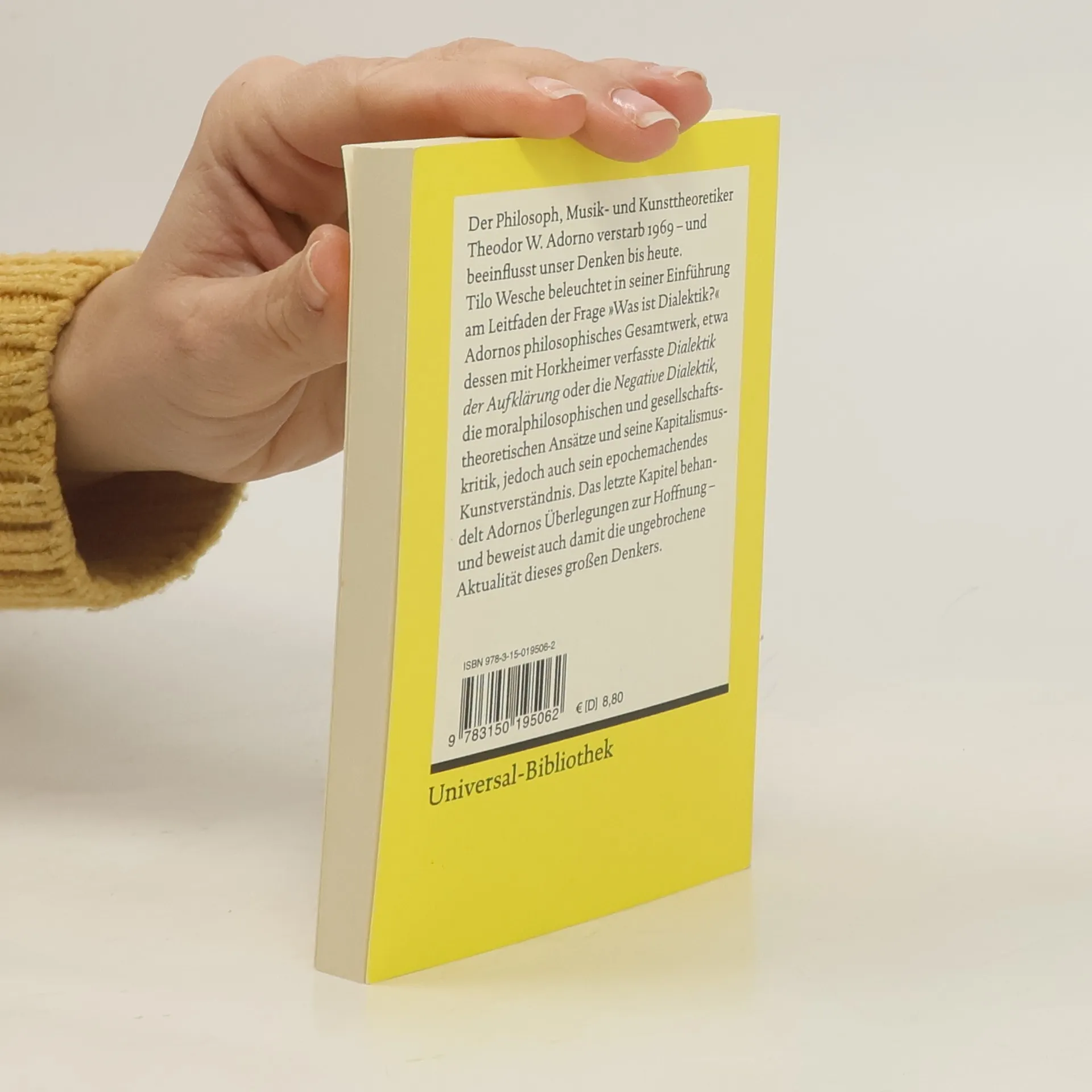 Der 1969 verstorbene Philosoph, Musik- und Kunsttheoretiker Theodor W. Adorno beeinflusst unser Denken bis heute. Tilo Wesche beleuchtet in seiner Einführung Adornos philosophisches Gesamtwerk, etwa dessen mit Horkheimer verfasste Dialektik der Aufklärung oder die Negative Dialektik , die moralphilosophischen und gesellschaftspolitischen Ansätze, seine Kapitalismus- und Gesellschaftskritik sowie sein epochemachendes Kunstverständnis. Das letzte Kapitel zielt auf Hoffnung – denn Adorno hoffte auf »das Entronnensein des Humanen aus dem Bann«, dass »Schicksal und Macht nicht das letzte Wort behalten«.