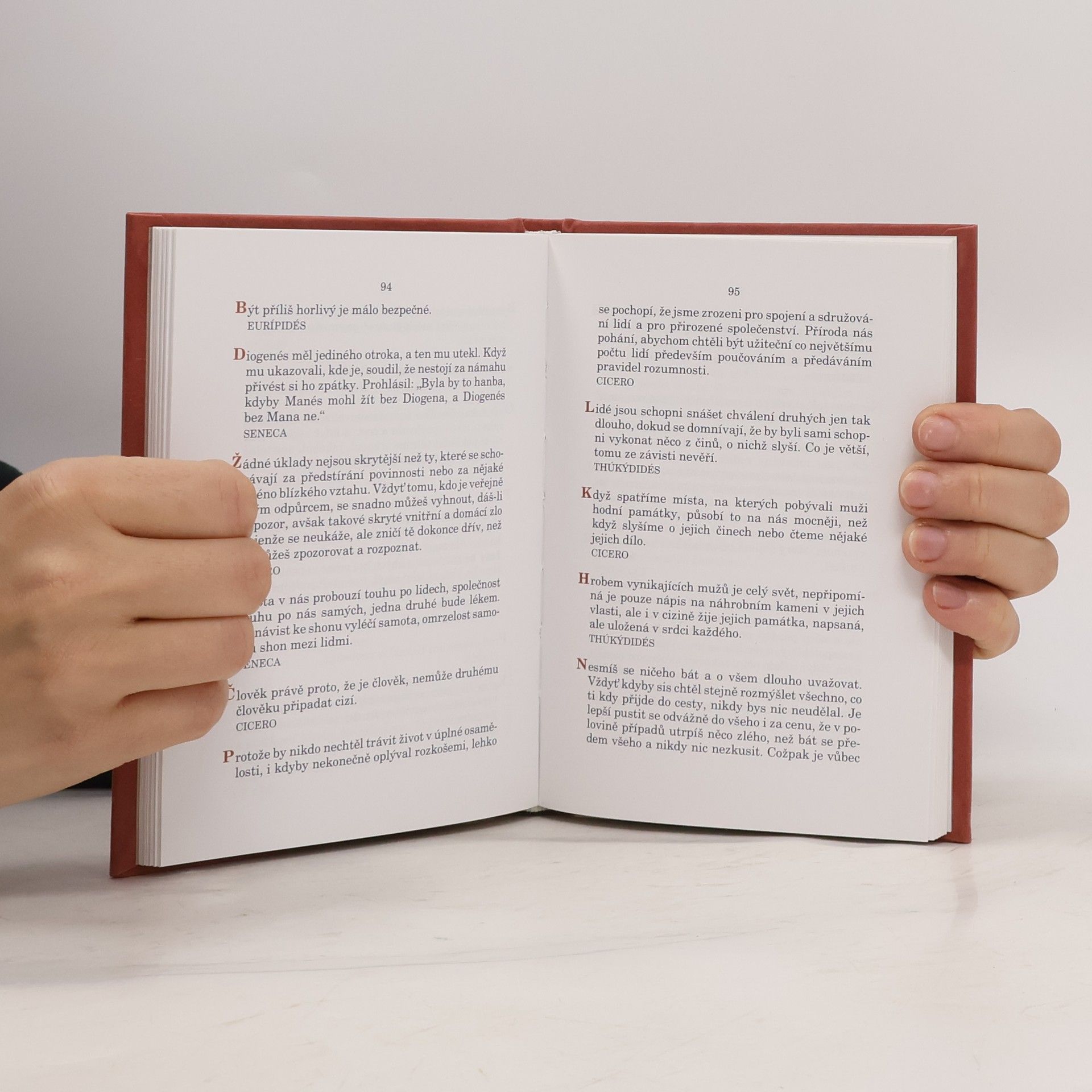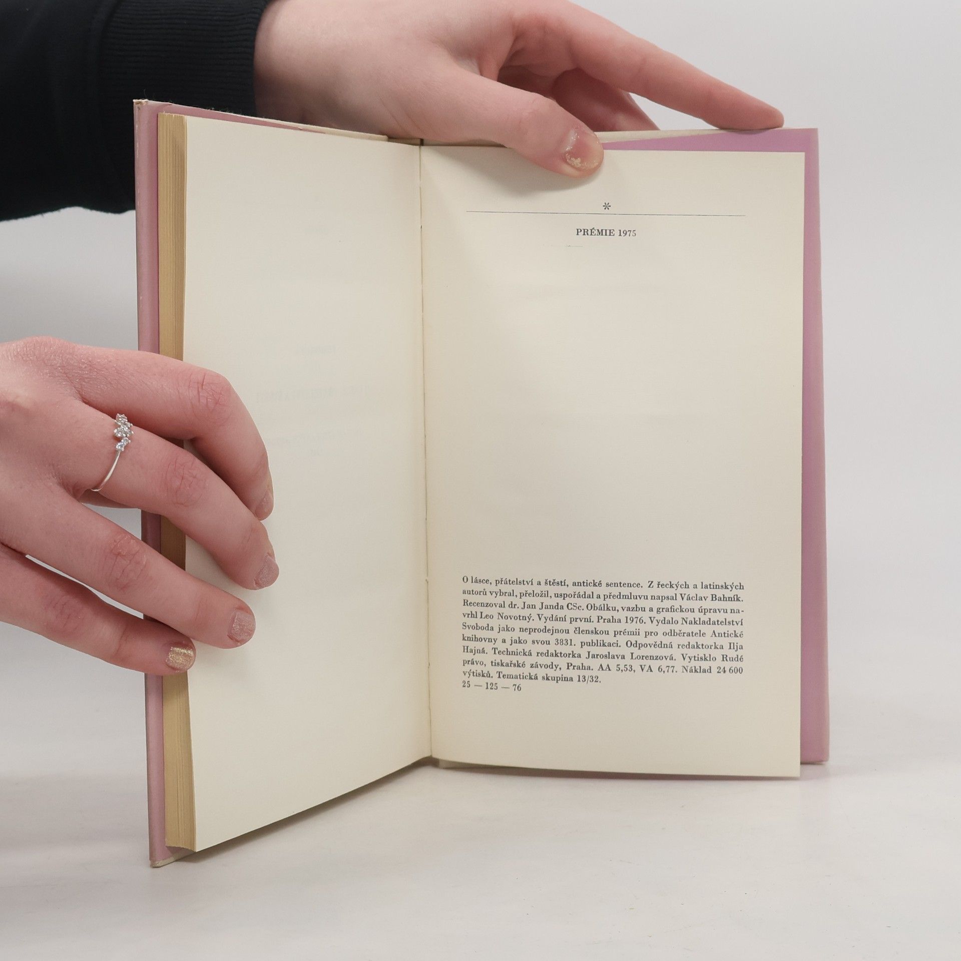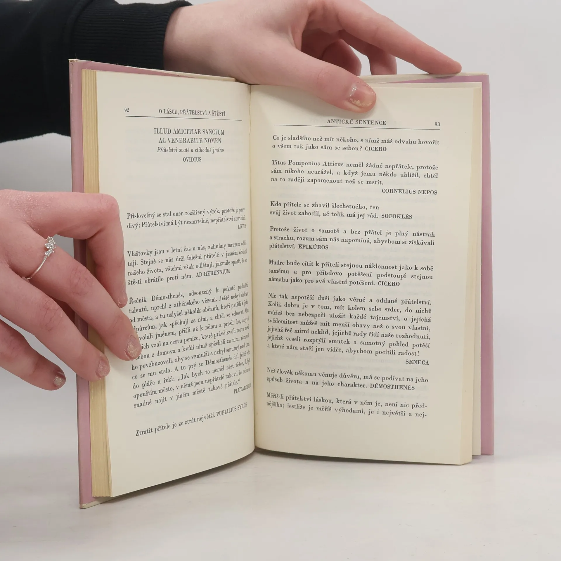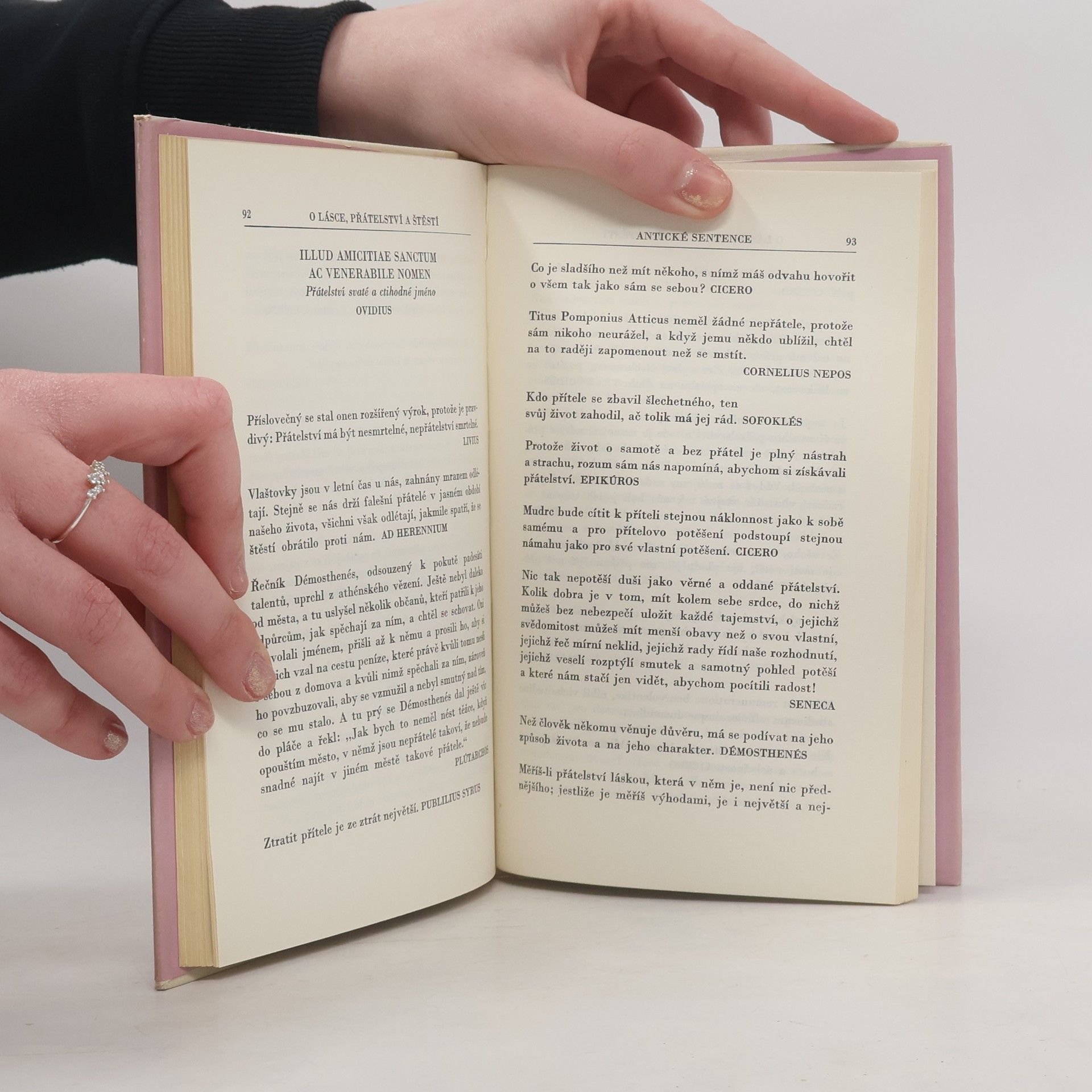 Antické sentence. Předmluva: Již staří Římané dělali to a ono - to bývalo zaklínadlo, které někdy pomáhalo omlouvat jednání, jehož správností si člověk nebyl jist, jindy varovalo před domýšlivou hrdostí na originalitu současné doby, jindy upozorňovalo na hodnoty všelidské a všečasové. Vybrali jsme pro vás z bohaté pokladnice antické literatury hrst příkladů, jak již staří Římané (a před nimi staří Řekové) dovedli vidět světlo a stín vzdělání, dobré i špatné vlastnosti člověka a různé aspekty vztahů mezi lidmi a formulovali mnohé pocity stejně jako lidé dvacátého (jednadvacátého) století. ... Přestože žijeme ve světě úplně jiném, některé myšlenky nás udivý tím, že byly formulovány tak, že mají platnost dodnes, i když se dnešní čtenář nemůže do písmene se vším ztotožnit, vše přejímat jako vidění světe. Václav Bahník Je to kniha plná citátů a přísloví.