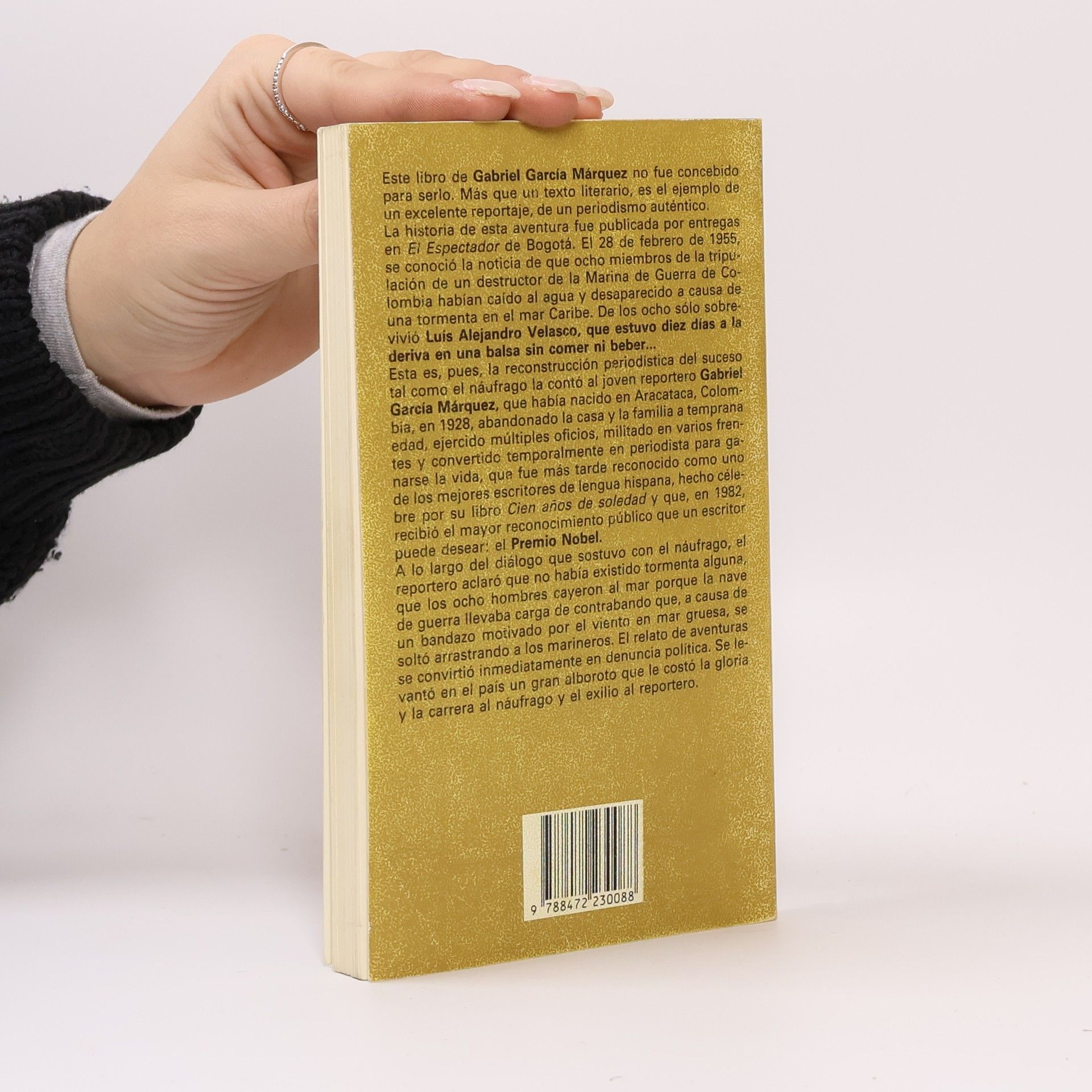Mi libro preferido, y el primero que escribi. Gabriel Garcia Marquez Con este libro, Gabriel Garcia Marquez se descubrio a si mismo como un narrador. Sin embargo, la intencion primera era escribir un reportaje sobre un hombre, Luis Alejandro Velasco, que estuvo diez dias a la deriva en una balsa mecida por el mar Caribe. El futuro Nobel de Literatura y entonces joven reportero que era Garcia Marquez escucho el relato de los hechos de boca de su protagonista y los transformo, tal vez sin pretenderlo, en un prodigioso ejercicio literario, una narracion escueta y vigorosa donde late el pulso de un gran escritor. La publicacion por entregas del reportaje en El Espectador de Bogota supuso un alboroto politico considerable -se revelaba la existencia de contrabando ilegal en un buque de la Armada colombiana, lo que costo la vida de siete marineros y el naufragio, mas afortunado, de Velasco- y el exilio para su autor. El 22 de febrero nos anuncio que regresariamos a Colombia. Teniamos ocho meses de estar en Mobile, Alabama, Estados Unidos, donde el A.R.C. Caldas fue sometido a reparaciones electronicas y de sus armamentos. En los dias de franquicia haciamos lo que hacen todos los marineros en tierra: ibamos al cine con la novia y nos reuniamos despues en Joe Palooka, una taberna del puerto, donde tomabamos whisky y armabamos una bronca de vez en cuando.