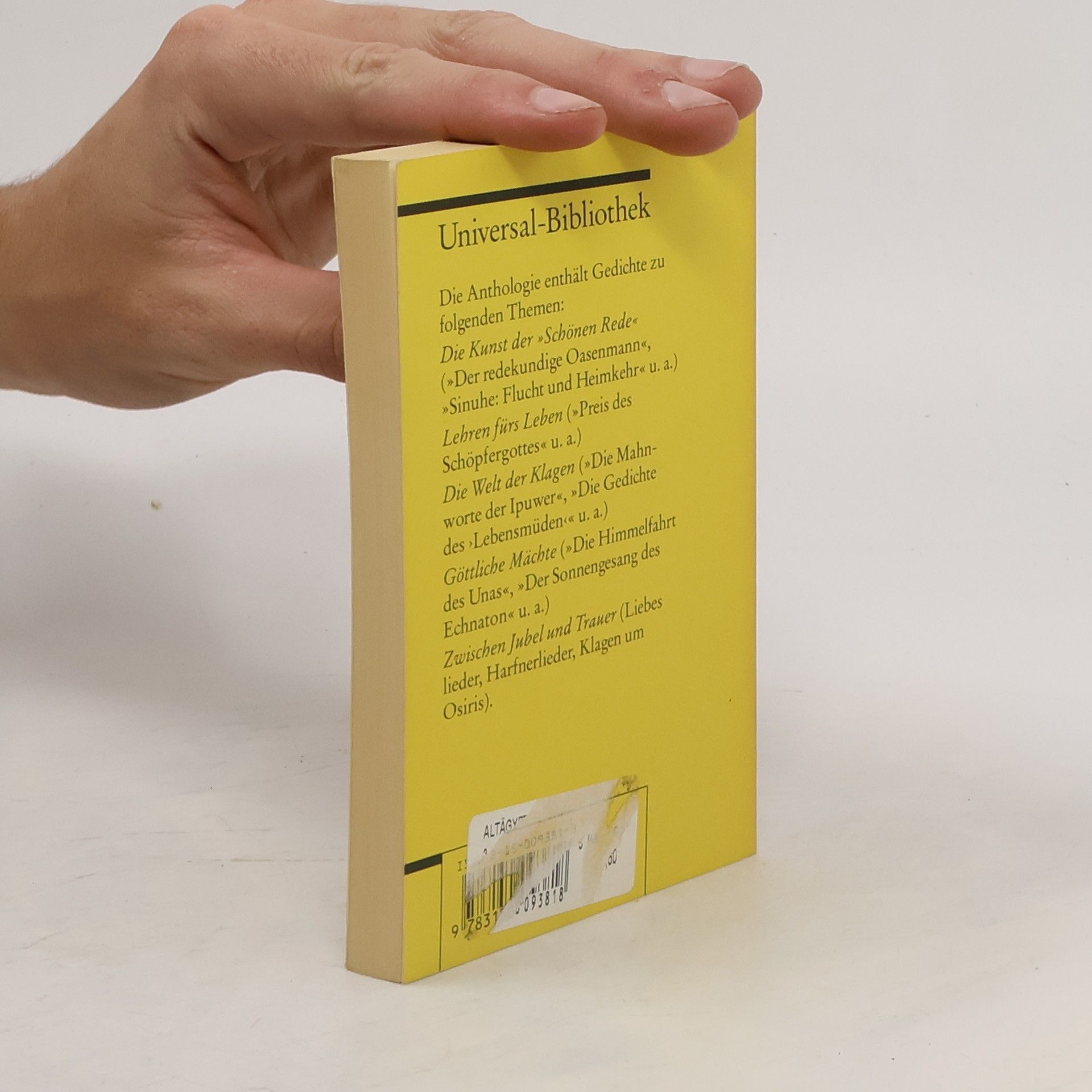 InhaltsverzeichnisEinleitung Die Kunst der »Schönen Rede« Der redekundige Oasenmann Sinu he: Flucht und Heimkehr Wenamun in schwieriger Mission Lehren für das Leben Der weise Ptahhotep Ein Preis des Schöpfergottes Die Welt der Klagen Die Mahnworte des Ipuwer Chacheperreseneb klagt Neferti prophezeit Die Gedichte des »Lebensmüden« Göttliche Mächte Die Himmelfahrt des Unas Der Allherr über seine Schöpfung Lied der vier Winde Die Rechtfertigung im Totengericht Der Sonnengesang Echnatons Ramses II in Not Zwischen Jubel und Trauer Liebeslieder Harfnerlieder Klagen um Osiris Epilog: Der Nachruhm des Schreibers Zu den Texten Literaturhinweise