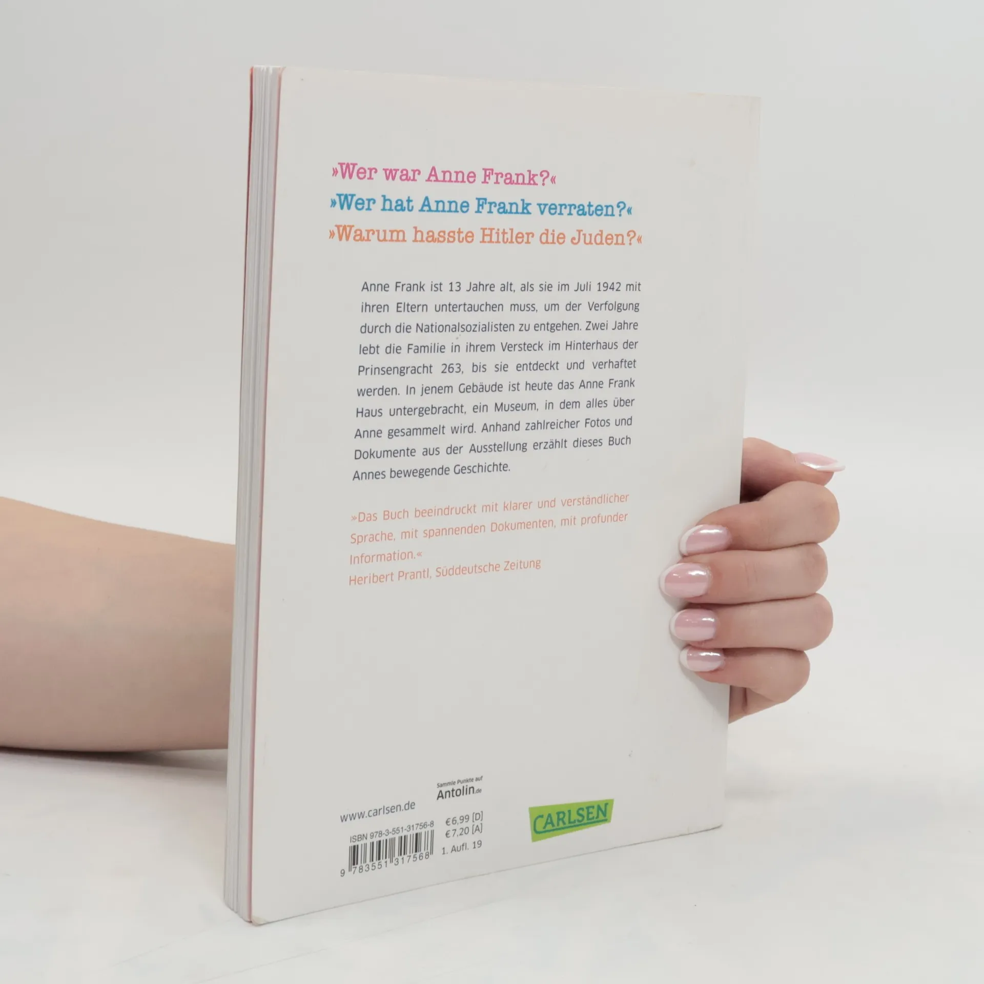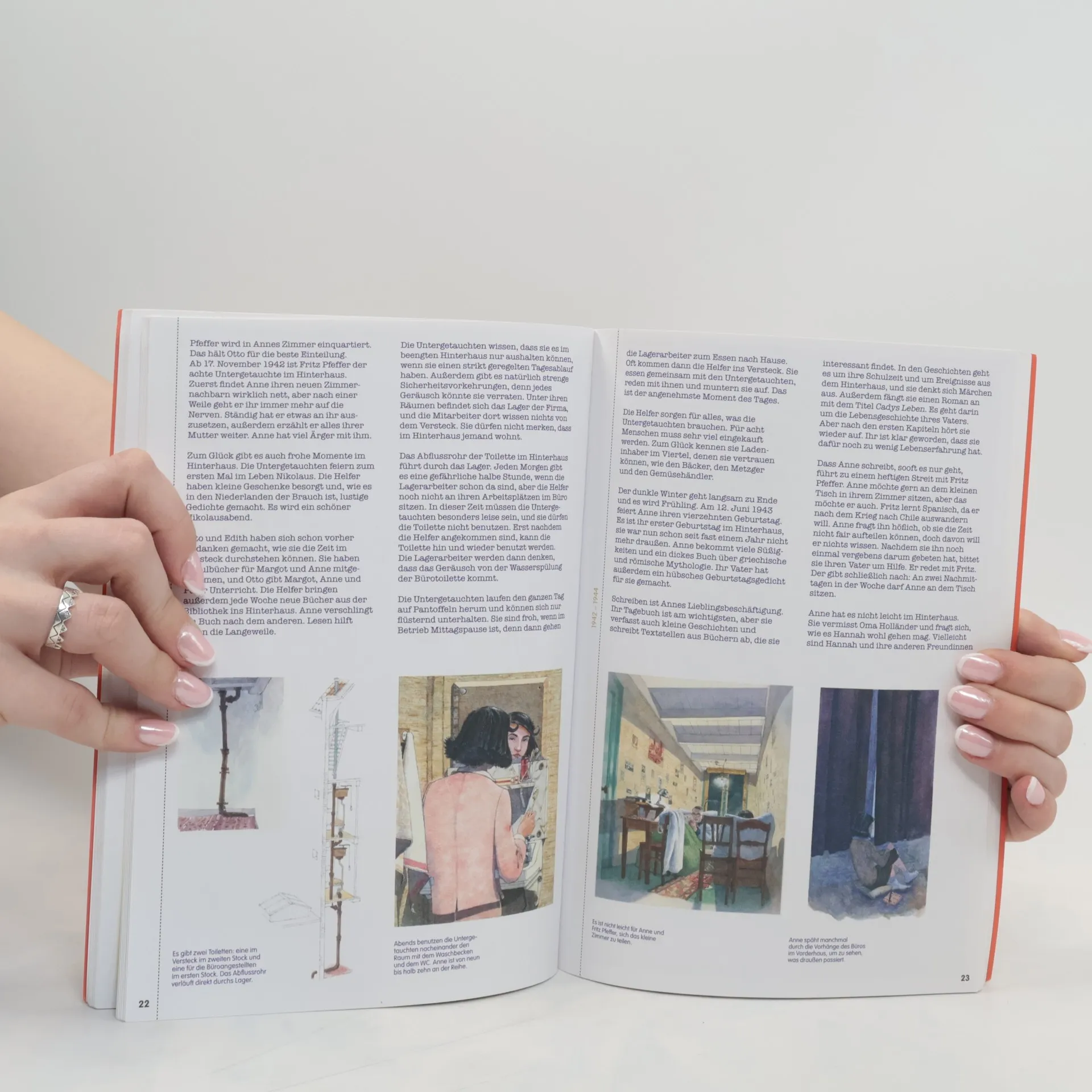 Am 6. Juli 1942 macht sich Anne Frank mit ihren Eltern auf in das Versteck im Hinterhaus der Prinsengracht 263, um sich hier vor den Nationalsozialisten zu verbergen. Damals war sie gerade 13 Jahre alt. Zahlreiche Fotos von Anne, ihren Eltern und ihren Freundinnen, zeitgenössische Dokumente wie Zeitungsberichte, Pässe, Plakate, ein leicht zugänglicher Text und viele begleitende Illustrationen erzählen von Annes Leben und ihrem Tod. Ergänzend werden viele Sachinformationen zum Nationalsozialismus vermittelt.