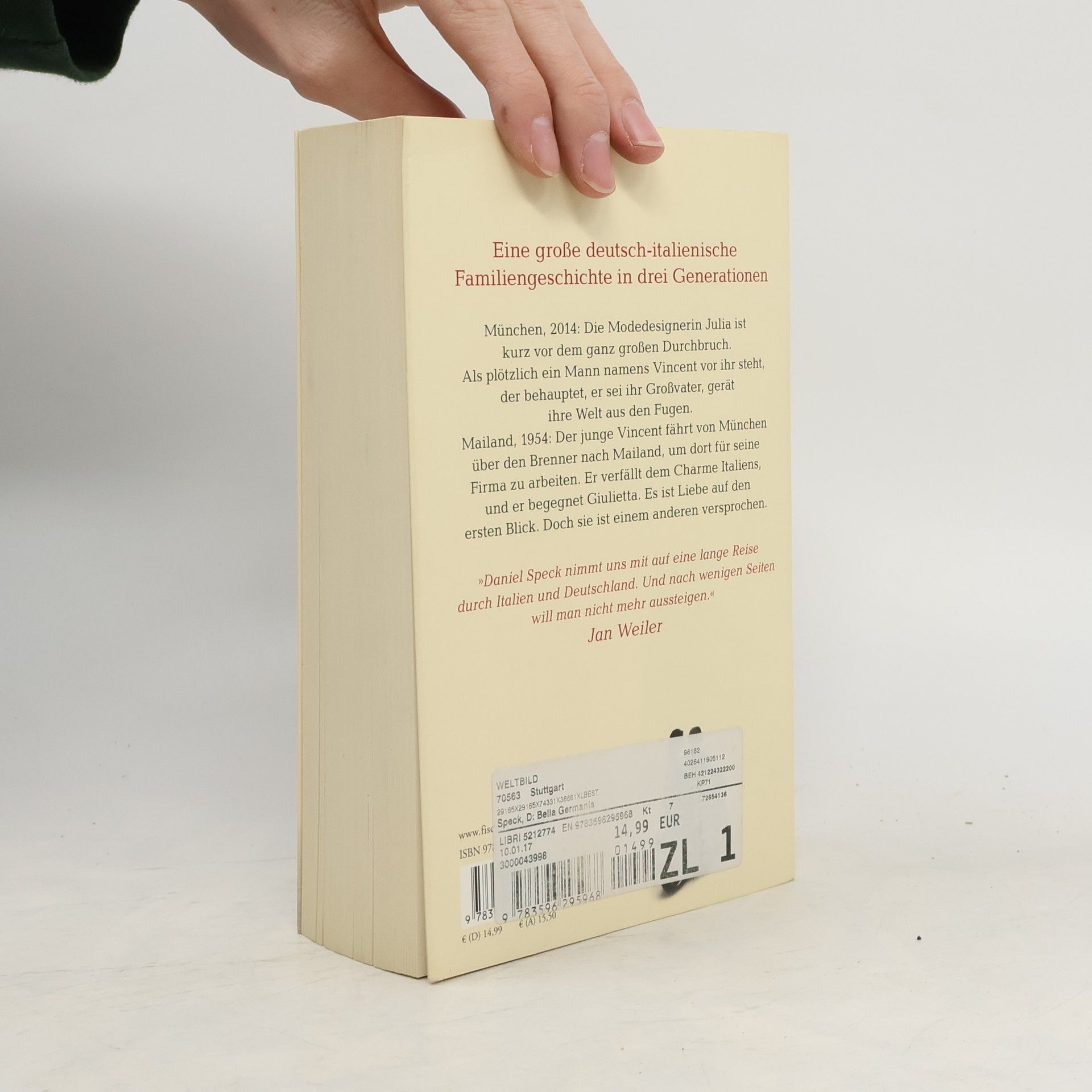 »Eine packende Geschichte – und wunderschön erzählt.« Jan Weiler Daniel Specks Roman »Bella Germania« ist eine große deutsch-italienische Familiengeschichte in drei Generationen – voller Zeitkolorit, dramatischer Wendungen und großer Gefühle.»Er reichte mir ein altes Foto. Ein junges Paar vor dem Mailänder Dom. Die Frau hatte schwarze Haare und sah aus wie ich. Es war, als blickte ich direkt in einen Spiegel. ›Das ist Giulietta‹, sagte er, ›deine Großmutter.‹« München, 2014: Die Modedesignerin Julia ist kurz vor dem ganz großen Durchbruch. Als plötzlich ein Mann namens Vincent vor ihr steht, der behauptet, er sei ihr Großvater, gerät ihre Welt aus den Fugen. Mailand, 1954: Der junge Vincent fährt von München über den Brenner nach Mailand, um dort für seine Firma zu arbeiten. Er verfällt dem Charme Italiens, und er begegnet Giulietta. Es ist Liebe auf den ersten Blick. Doch sie ist einem anderen versprochen.Eine tragische Liebe nimmt ihren Lauf, die auch Jahrzehnte später noch das Leben von Julia völlig verändern wird. »Daniel Speck nimmt uns mit auf eine lange Reise durch Italien und Deutschland. Und nach wenigen Seiten will man nicht mehr aussteigen.« Jan Weiler