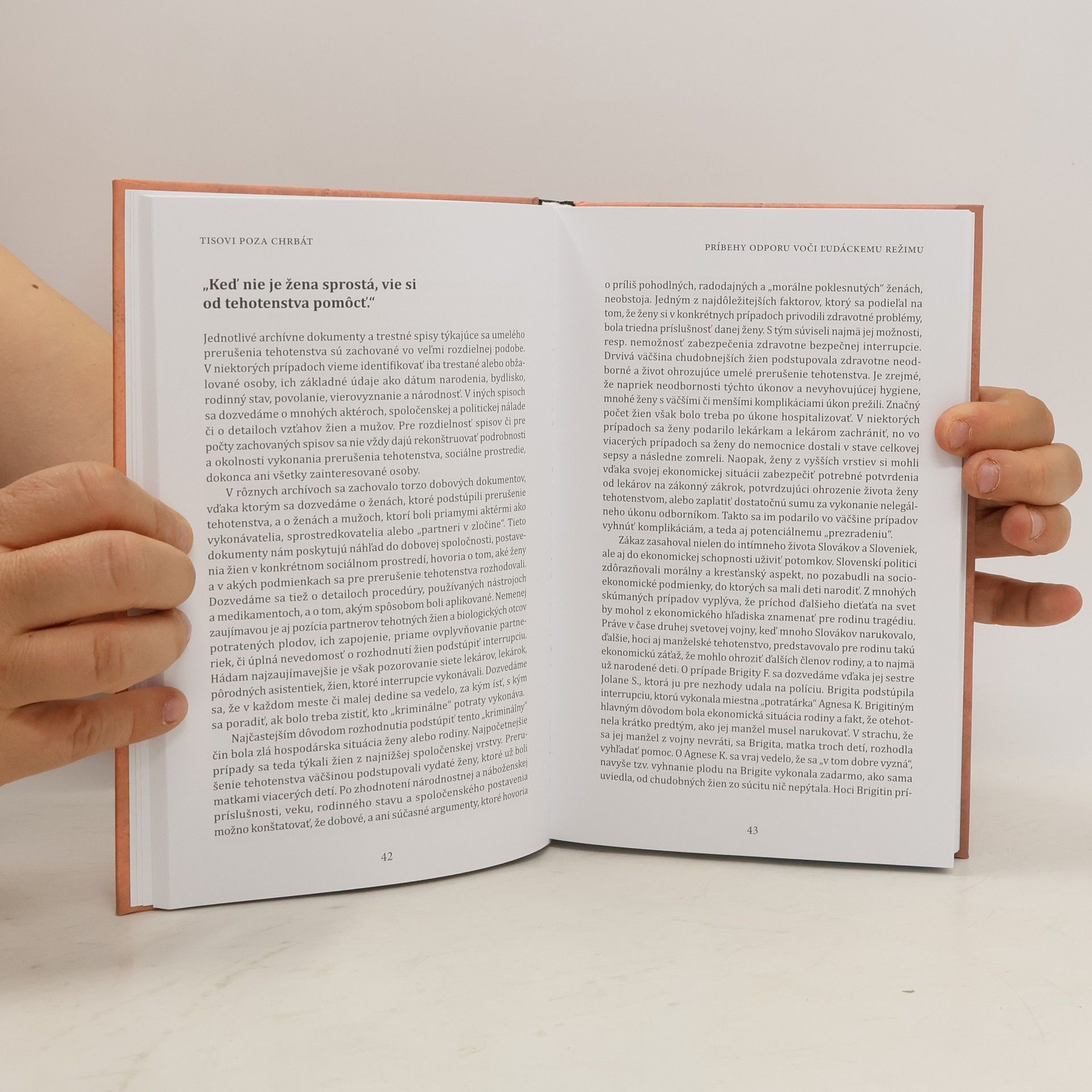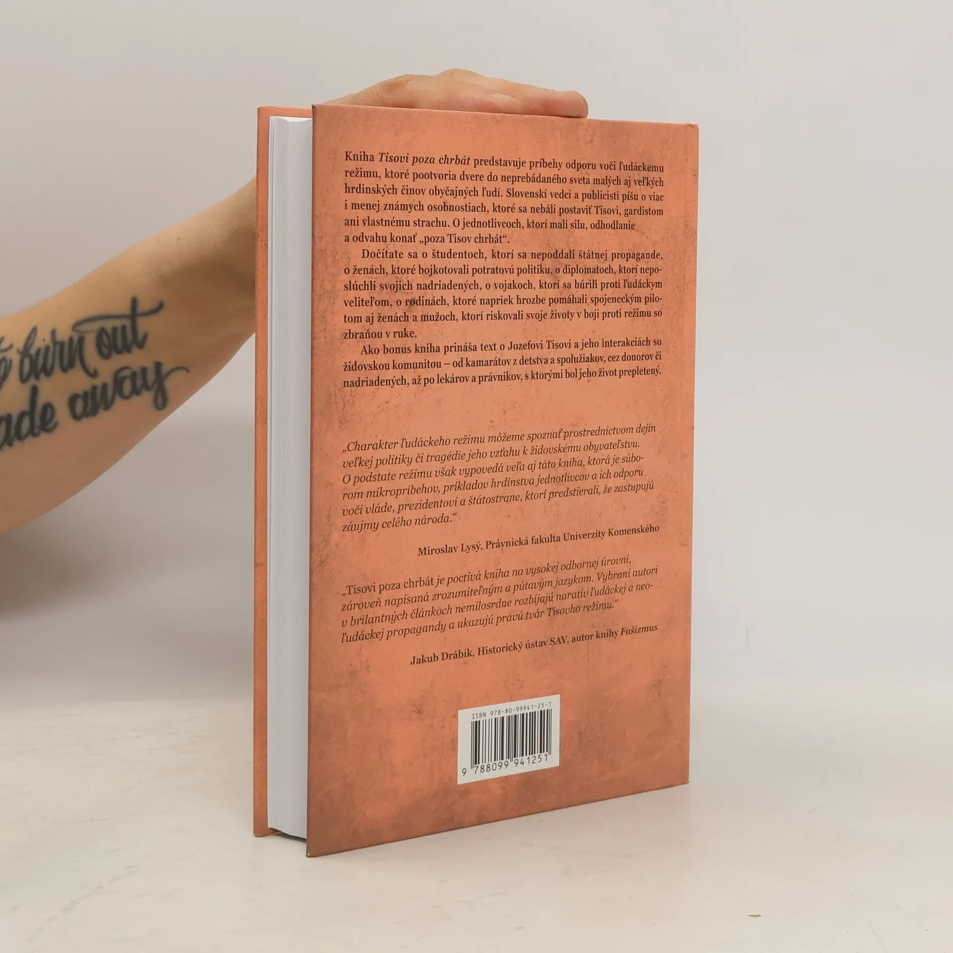 Kniha Tisovi poza chrbát predstavuje príbehy odporu voči ľudáckemu režimu, ktoré pootvoria dvere do neprebádaného sveta malých aj veľkých hrdinských činov obyčajných ľudí. Slovenskí vedci a publicisti píšu o viac i menej známych osobnostiach, ktoré sa nebáli postaviť Tisovi, gardistom ani vlastnému strachu. O jednotlivcoch, ktorí mali silu, odhodlanie a odvahu konať „poza Tisov chrbát“. Dočítate sa o študentoch, ktorí sa nepoddali štátnej propagande, o ženách, ktoré bojkotovali potratovú politiku, o diplomatoch, ktorí neposlúchli svojich nadriadených, o vojakoch, ktorí sa búrili proti ľudáckym veliteľom, o rodinách, ktoré napriek hrozbe pomáhali spojeneckým pilotom aj ženách a mužoch, ktorí riskovali svoje životy v boji proti režimu so zbraňou v ruke. Ako bonus kniha prináša text o Jozefovi Tisovi a jeho interakciách so židovskou komunitou – od kamarátov z detstva a spolužiakov, cez donorov či nadriadených, až po lekárov a právnikov, s ktorými bol jeho život prepletený.