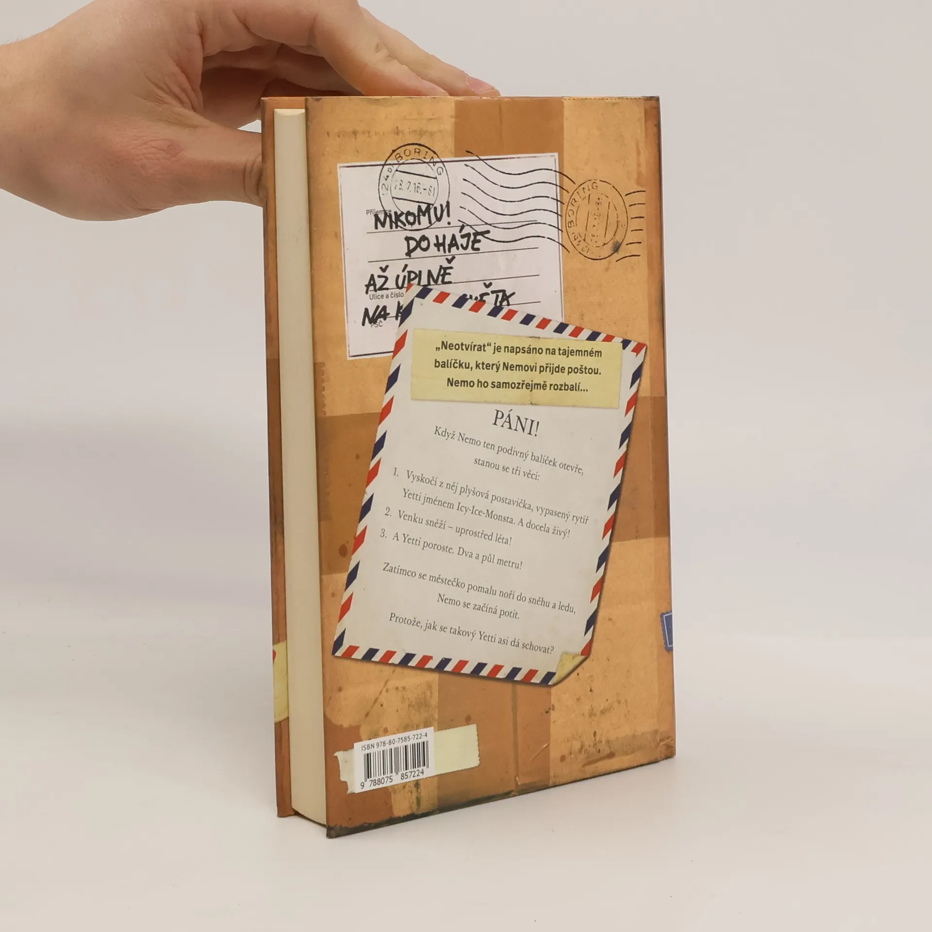 V Horním Suchopáru se téměř nic neděje. Nemo si myslí, že život v městečku je opravdu jedna velká nuda. Všichni jsou tu na sebe pořád hodní, pomáhají si a ještě k tomu je vedro a blíží se konec školního roku. Nemovi ale přijde poštou podivný balíček, na kterém je důrazně napsáno „Neotevírat!“ Nemo ho samozřejmě rozbalí ... Páni! Když tu podivnou zásilku otevře, stanou se tři věci: 1. Vyskočí z něj plyšová postavička, vypasený rytíř Yetti jménem Icy-Ice-Monsta. Zdá se, že je docela živý! 2. Venku sněží – uprostřed léta! 3. A Yetti bude velký. Dva a půl metru. Zatímco se městečko pomalu noří do sněhu a ledu, Nemo se začíná potit. Protože, jak se takový Yetti asi dá schovat? Nemo a jeho přátelé Béda a Otka mají co dělat, aby všechno zvládli. Podaří se jim to? Příběh tří přátel a velkého Yettiho zaujme napínavou zápletkou, spoustou dobrodružství a legrace. Vtipné vyprávění, ve kterém jde v prvé řadě o čas, pobaví i dospělé, třeba při čtení na doboru noc.