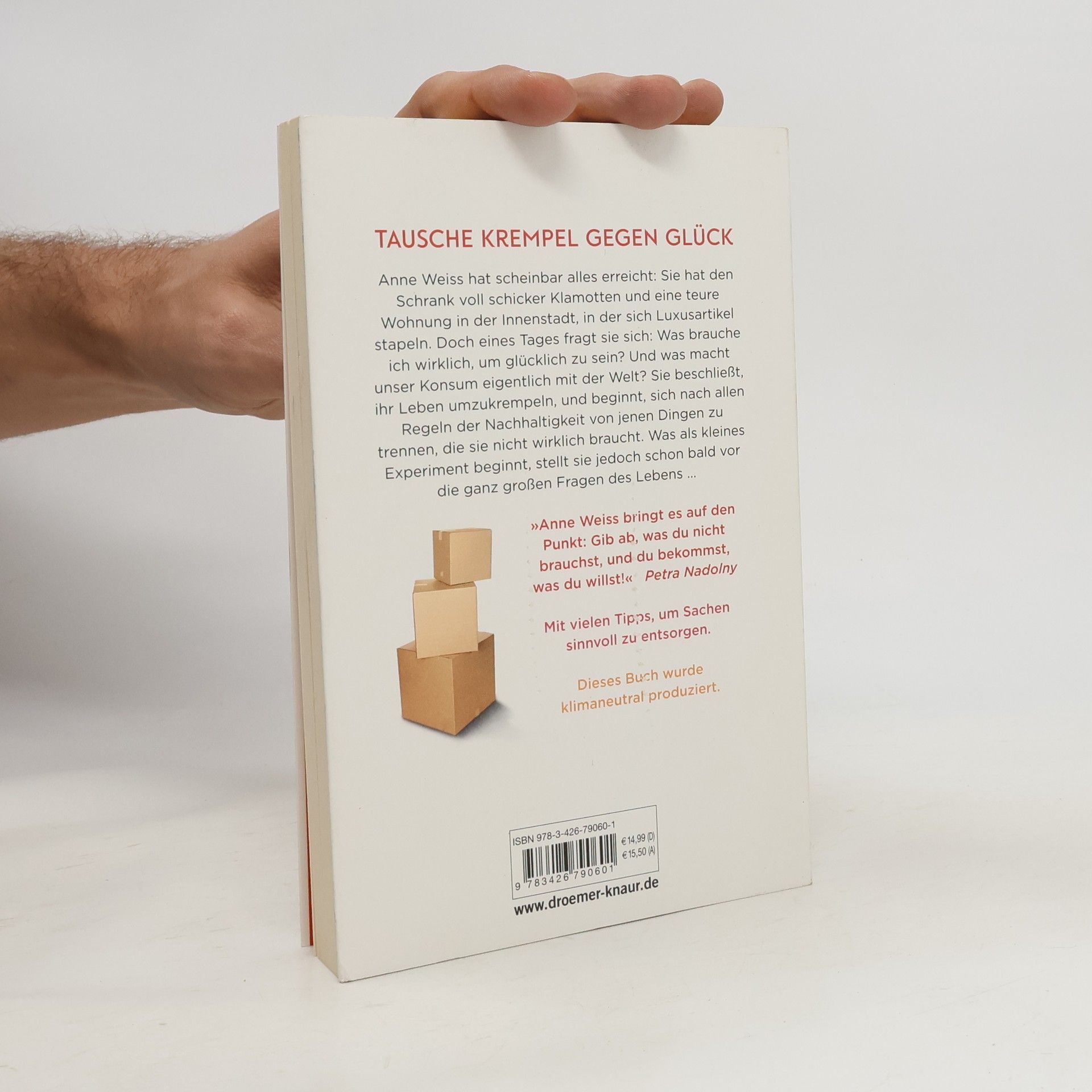 Minimalismus und Aufräumen liegen voll im Trend. Bestsellerautorin Anne Weiss erzählt in diesem Buch, wie sie ihren Krempel gegen Lebensglück eintauschte – und gibt Tipps, wie man seine Sachen sinnvoll und nachhaltig entsorgt.Anne Weiss hat den Kleiderschrank voll schicker Klamotten und eine teure Wohnung in der Innenstadt, in der sich Luxusartikel stapeln – alles, was sie sich nach Jahren auf der Karriereleiter endlich leisten kann. Stolz ist sie drauf, aber als sie ihren Job verliert, stellt das alles, woran sie bisher geglaubt hat, infrage. Wofür hat sie sich so abgestrampelt? Was ist das gute Leben, und wo in diesem ganzen Krempel ist eigentlich sie selbst? Und vor allem: Was macht dieser ganze Konsum eigentlich mit unserer Welt? Je mehr sie entrümpelt, verschenkt, nach allen Regeln der Nachhaltigkeit entsorgt, desto leichter fühlt sie sich. Heute passt ihr Besitz in drei Kisten – und sie stellt fest, dass sie neben einer großen Freiheit auch Platz gewann: für alles, was sie wirklich gerne tut, und die Menschen, die sie liebt.
