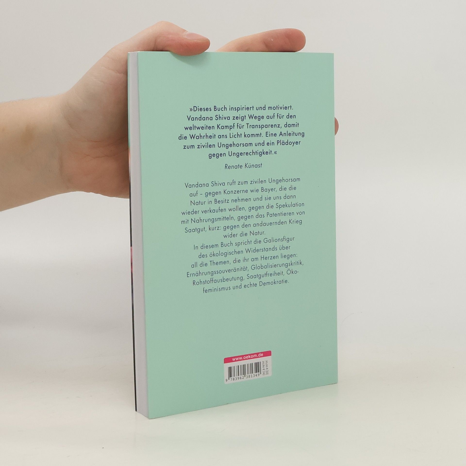 »Dieses Buch inspiriert und motiviert. Vandana Shiva zeigt Wege auf für den weltweiten Kampf für Transparenz, damit die Wahrheit ans Licht kommt. Eine Anleitung zum zivilen Ungehorsam und ein Plädoyer gegen Ungerechtigkeit.« Renate Künast Vandana Shiva ruft zum zivilen Ungehorsam auf – gegen Konzerne wie Bayer, die die Natur in Besitz nehmen und sie uns dann wieder verkaufen wollen, gegen die Spekulation mit Nahrungsmitteln, gegen das Patentieren von Saatgut, kurz: gegen den andauernden Krieg wider die Natur. In diesem Buch spricht die Galionsfigur des ökologischen Widerstands über all die Themen, die ihr am Herzen liegen: Ernährungssouveränität, Globalisierungskritik, Rohstoffausbeutung, Saatgutfreiheit, Ökofeminismus und echte Demokratie.