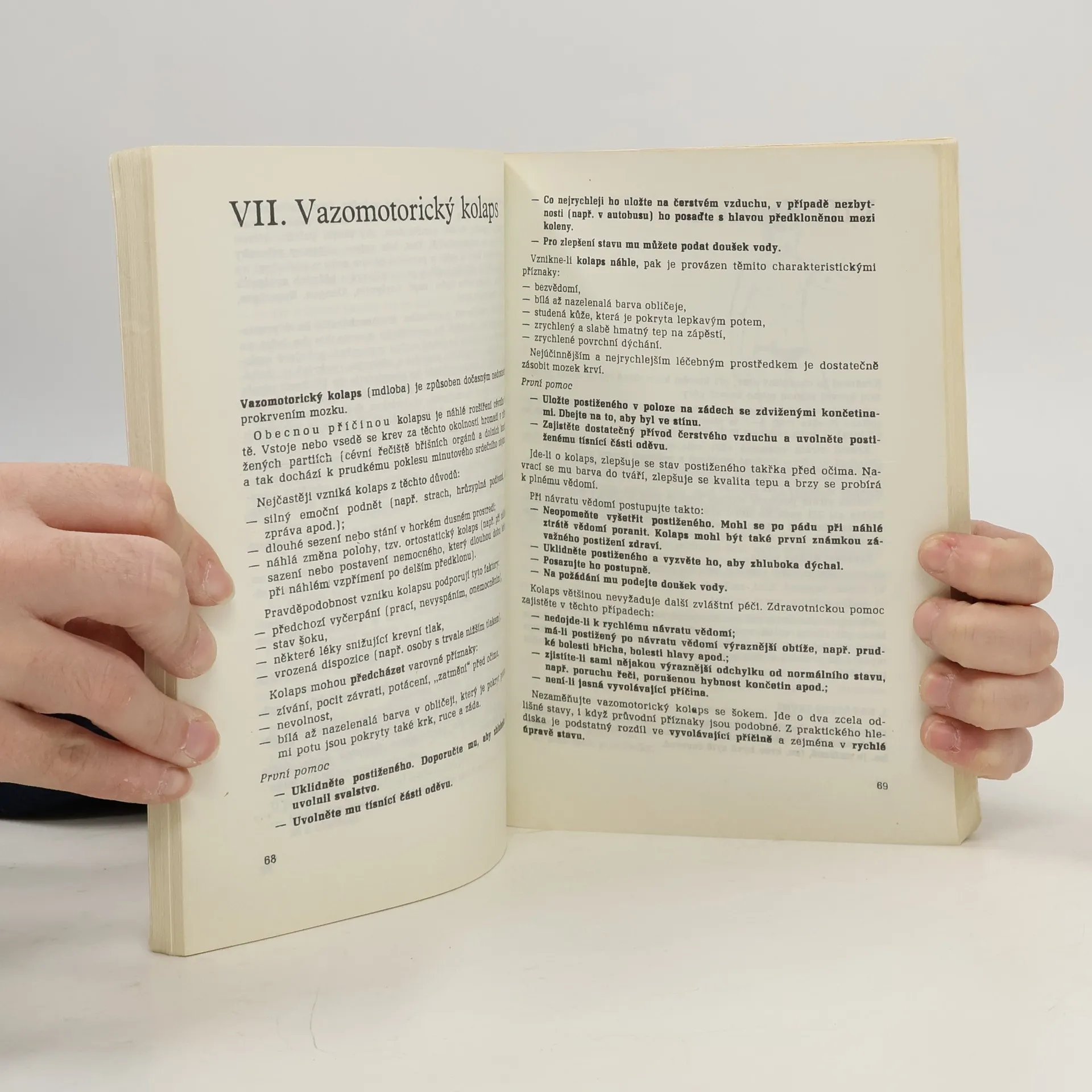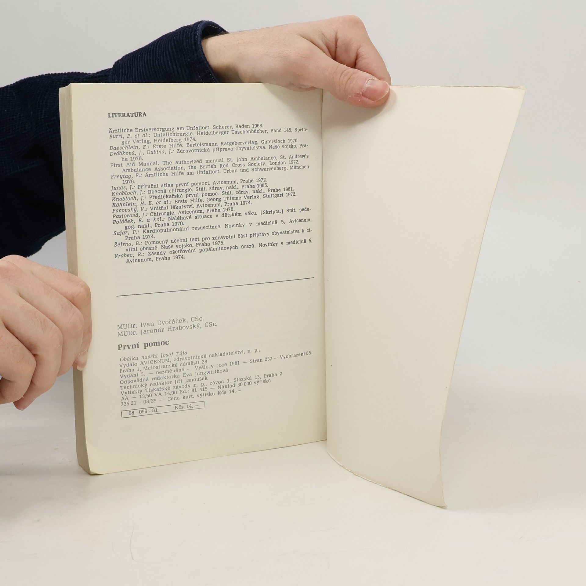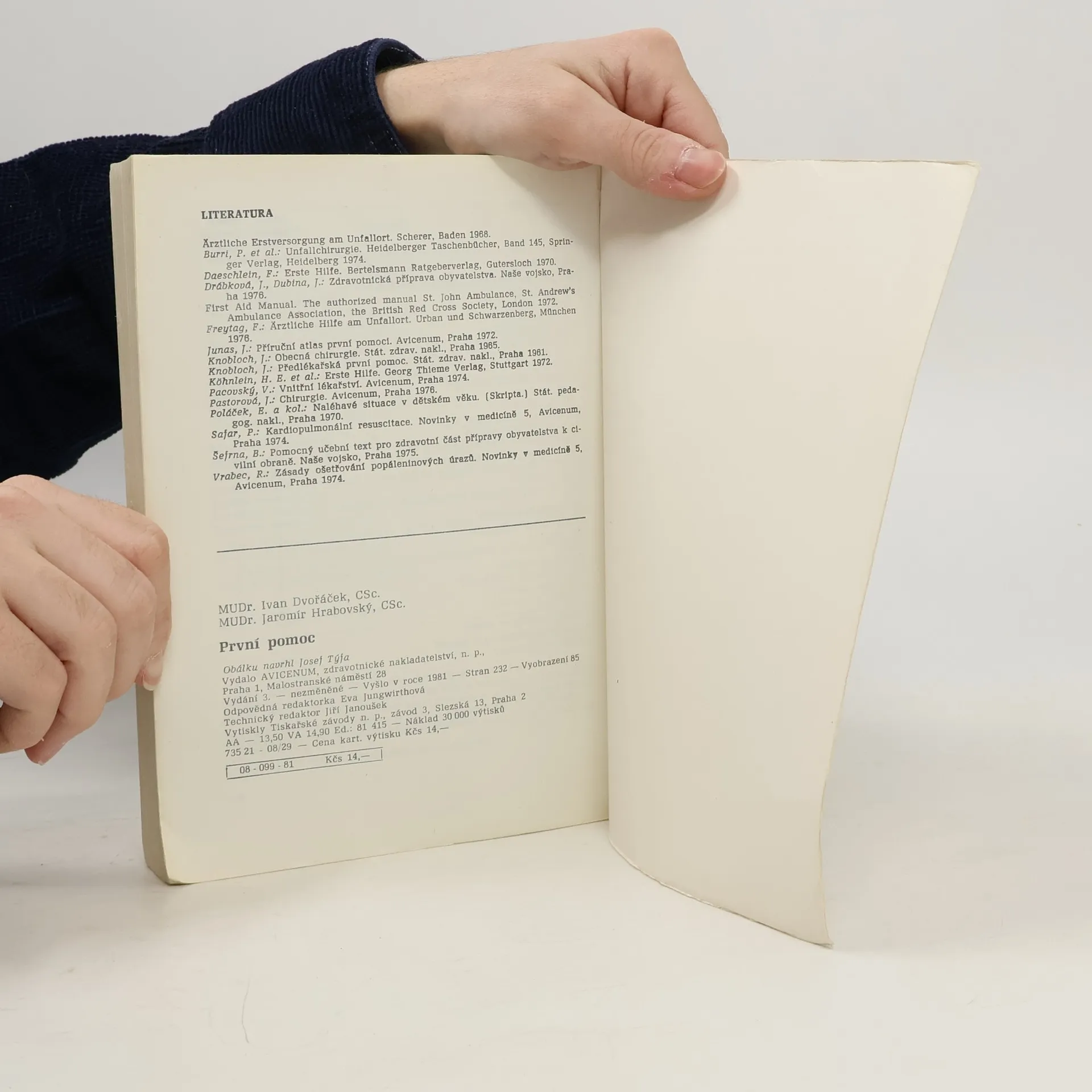 Učebnice pro zdravotnické školy. Příručka seznamuje s nejdůležitějšími postupy při poskytování první pomoci, zejména při stavech bezprostředního ohrožení života. Po výkladu o struktuře a základních funkcích organismu informuje o provádění neodkladnéresuscitace, o první pomoci v případě bezvědomí, šoku, krvácení, závažných i menších poranění, akutních otravách apod