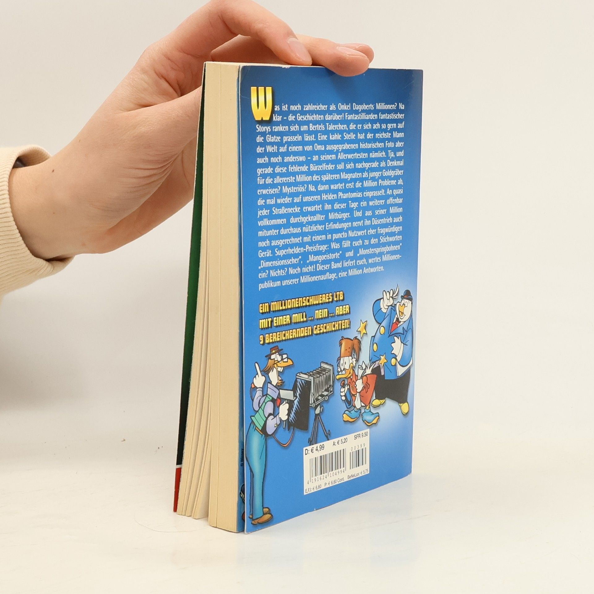 Was ist noch zahlreicher als Onkel Dagoberts Millionen? Na klar – die Geschichten darüber! Fantastilliarden fantastischer Storys ranken sich um Bertels Talerchen, die er sich ach so gern auf die Glatze prasseln lässt. Eine kahle Stelle hat der reichste Mann der Welt auf einem von Oma ausgegrabenen historischen Foto aber auch noch anderswo – an seinem Allerwertesten nämlich. Tja, und gerade diese fehlende Bürzelfeder soll sich nachgerade als Denkmal für die allererste Million des späteren Magnaten als junger Goldgräber erweisen? Mysteriös? Na, dann wartet erst die Million Probleme ab, die mal wieder auf unseren Helden Phantomias einprasselt. An quasi jeder Straßenecke erwartet ihn dieser Tage ein weiterer offenbar vollkommen durchgeknallter Mitbürger. Und aus seiner Million mitunter durchaus nützlicher Erfindungen nervt ihn Düsentrieb auch noch ausgerechnet mit einem in puncto Nutzwert eher fragwürdigen Gerät. Superhelden-Preisfrage: Was fällt euch zu den Stichworten „Dimensionsseher“, „Mangoeistorte“ und „Monsterspringbohnen“ ein? Nichts? Noch nicht! Dieser Band liefert euch, wertes Millionenpublikum unserer Millionenauflage, eine Million Antworten. Ein millionenschweres LTB mit einer Mill ... nein ... aber 9 bereichernden Geschichten!