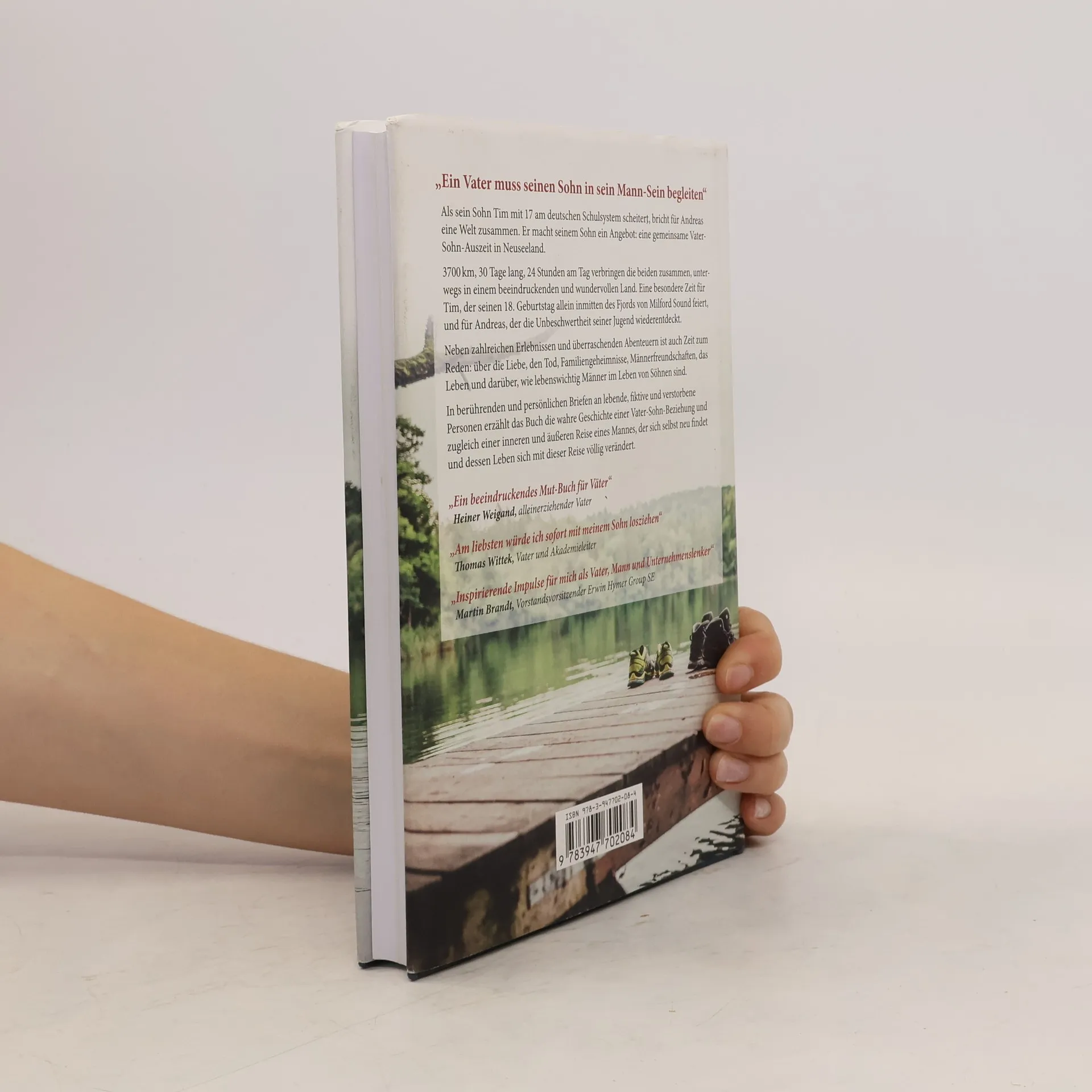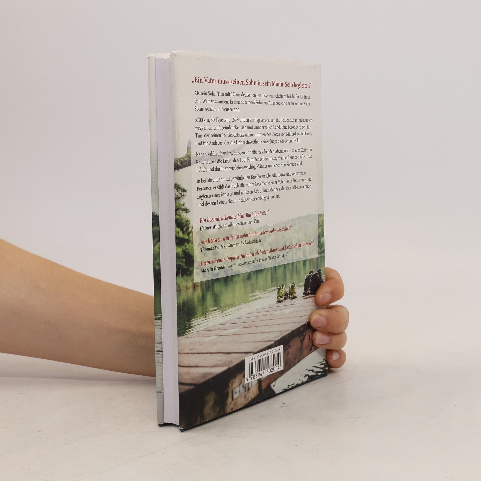 Als sein Sohn Tim mit 17 am deutschen Schulsystem scheitert, bricht für Andreas eine Welt zusammen. Er macht seinem Sohn ein Angebot: eine gemeinsame Vater-Sohn-Auszeit in Neuseeland. 3700 km, 30 Tage lang, 24 Stunden am Tag verbringen die beiden zusammen, unterwegs in einem beeindruckenden und wundervollen Land. Eine besondere Zeit für Tim, der seinen 18. Geburtstag allein, ohne Freunde, inmitten des Fjords von Milford Sound feiert, und für Andreas, der die Unbeschwertheit seiner Jugend wiederentdeckt. Neben zahlreichen Erlebnissen und überraschenden Abenteuern ist auch Zeit zum Reden: über falsche Freundinnen, Familiengeheimnisse, Männerfreundschaften, das Leben und darüber, wie lebenswichtig Männer im Leben von Söhnen sind. In berührenden und persönlichen Briefen an lebende, fiktive und verstorbene Personen erzählt das Buch die wahre Geschichte einer Vater-Sohn-Beziehung und zugleich einer inneren und äußeren Reise eines Mannes, der sich selbst neu findet und dessen Leben sich mit dieser Reise völlig verändert.
