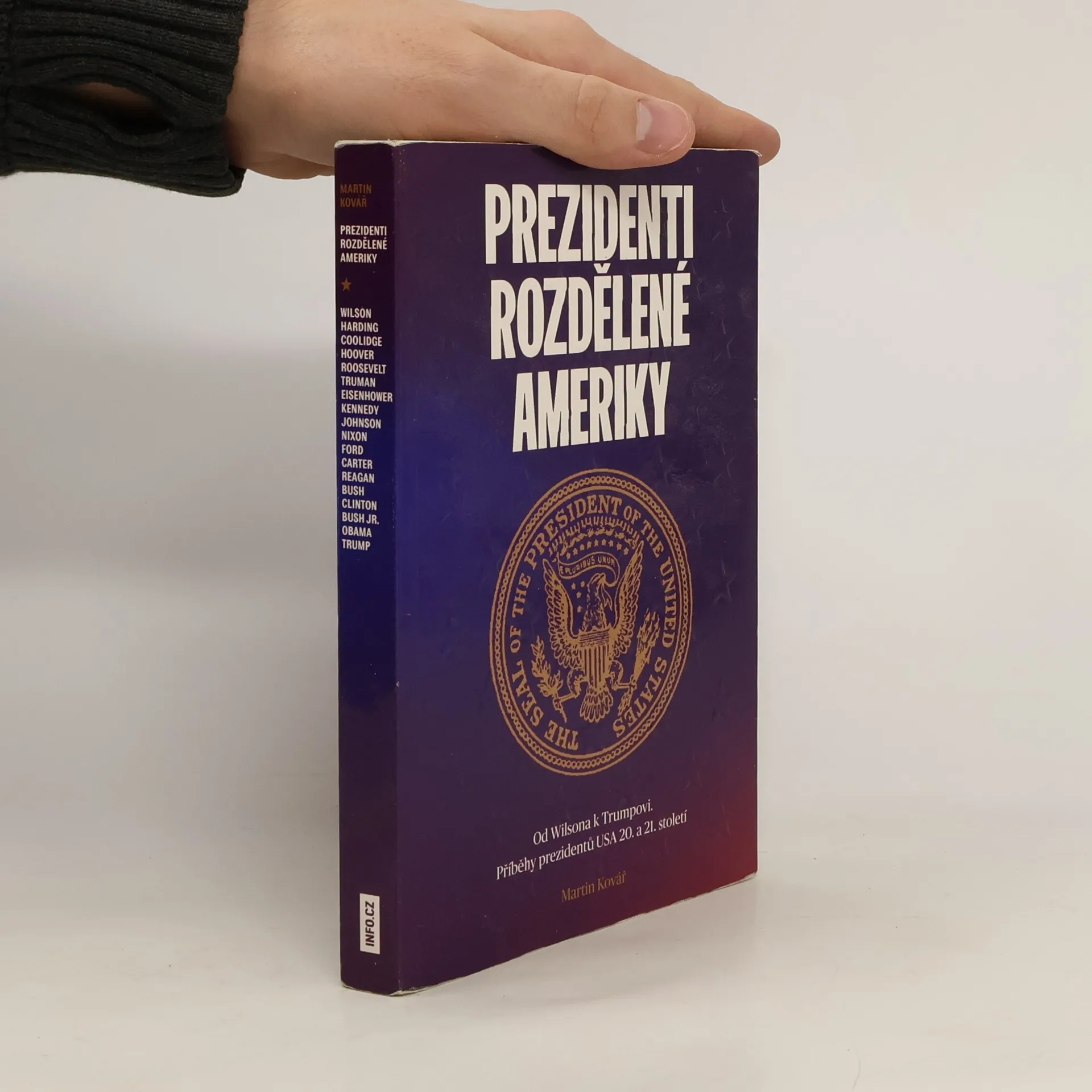 Od Wilsona k Trumpovi: Příběhy amerických prezidentů 20. a 21. století. Americký prezident je nejen hlavou státu, ale i jedním z nejmocnějších politiků na světě. Historik Martin Kovář glosuje jejich příběhy od Woodrowa Wilsona až po Donalda Trumpa. Ukazuje složitý vývoj Spojených státech amerických, jejich odvěkou rozdělenost i opakující se problémy, stejně jako tragiku a novou naději v dějinách 20. a nyní už i 21. století. Ohlíží se za tím, jaké osobnosti v Bílém domě úřadovaly, jak je vnímali jejich současníci v Americe i v zámoří a jak na ně s odstupem času nahlíží velká historie. Byl Franklin D. Roosevelt mocichtivý gigant s tyranskými sklony? Proč patří John F. Kennedy k nejpřeceňovanějším postavám dějin? A nekřivdí naopak historie Richardu Nixonovi či Georgi W. Bushovi? Kniha Prezidenti vychází z původního úspěšného seriálu INFO.CZ a přináší rovněž množství dalších speciálně připravených materiálů a textů.