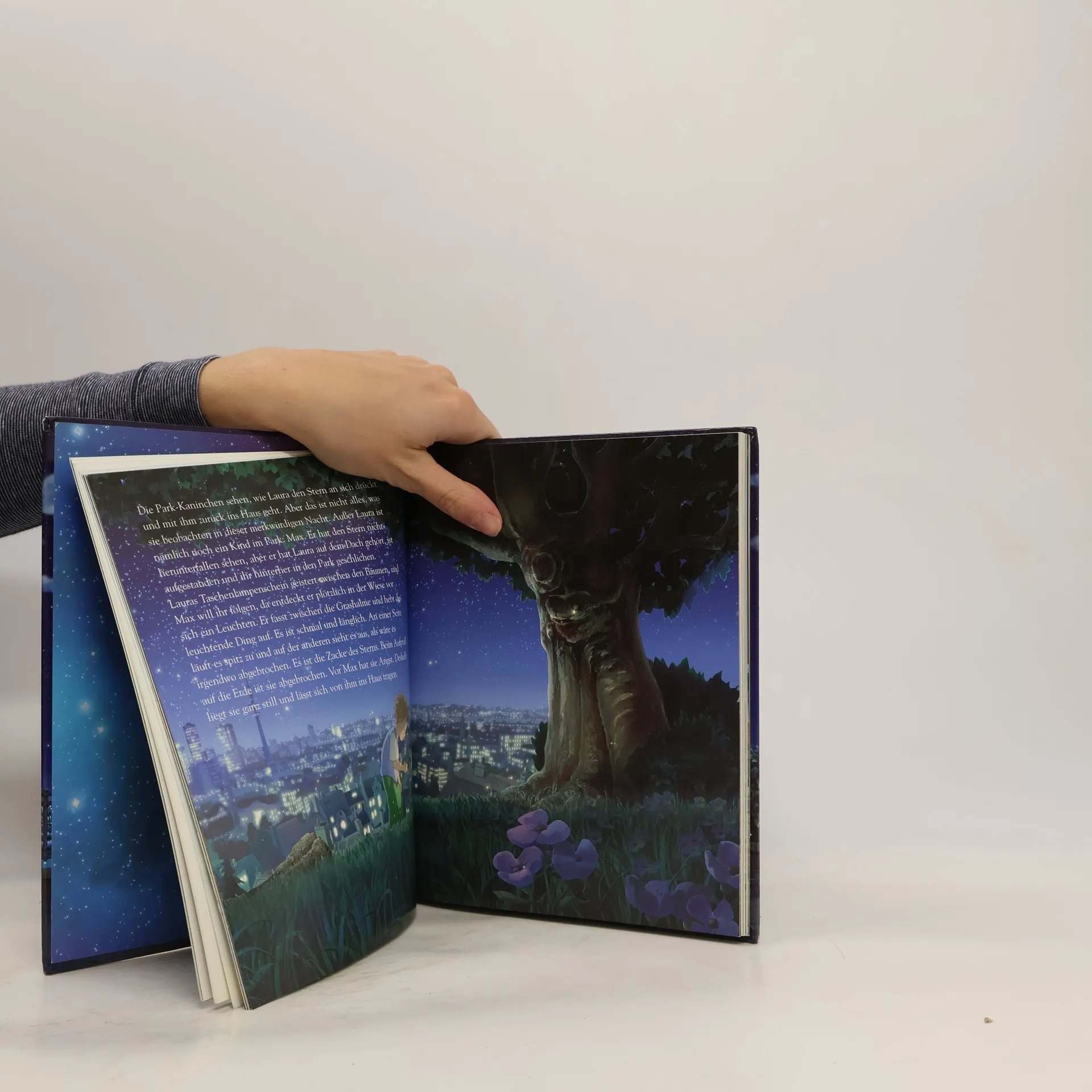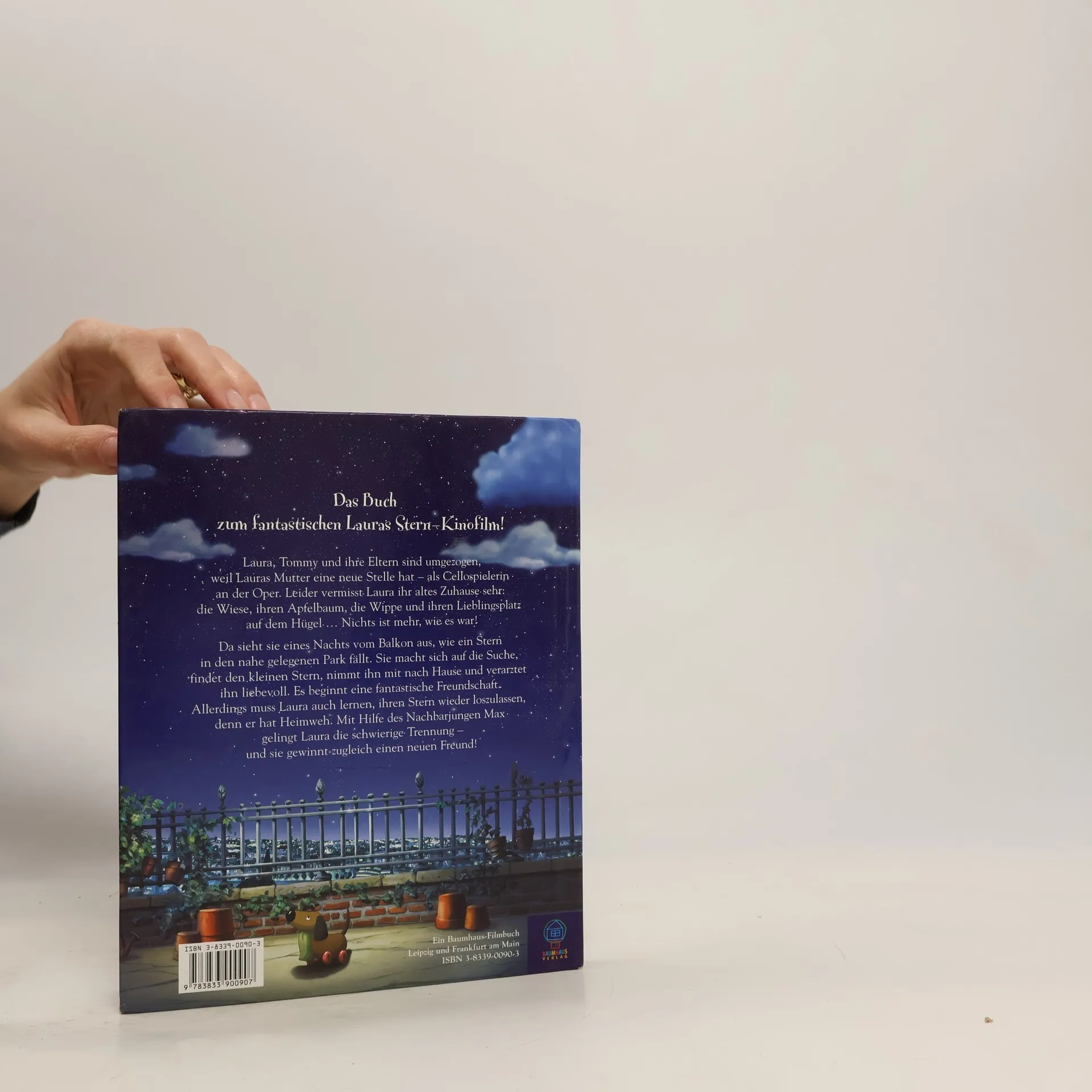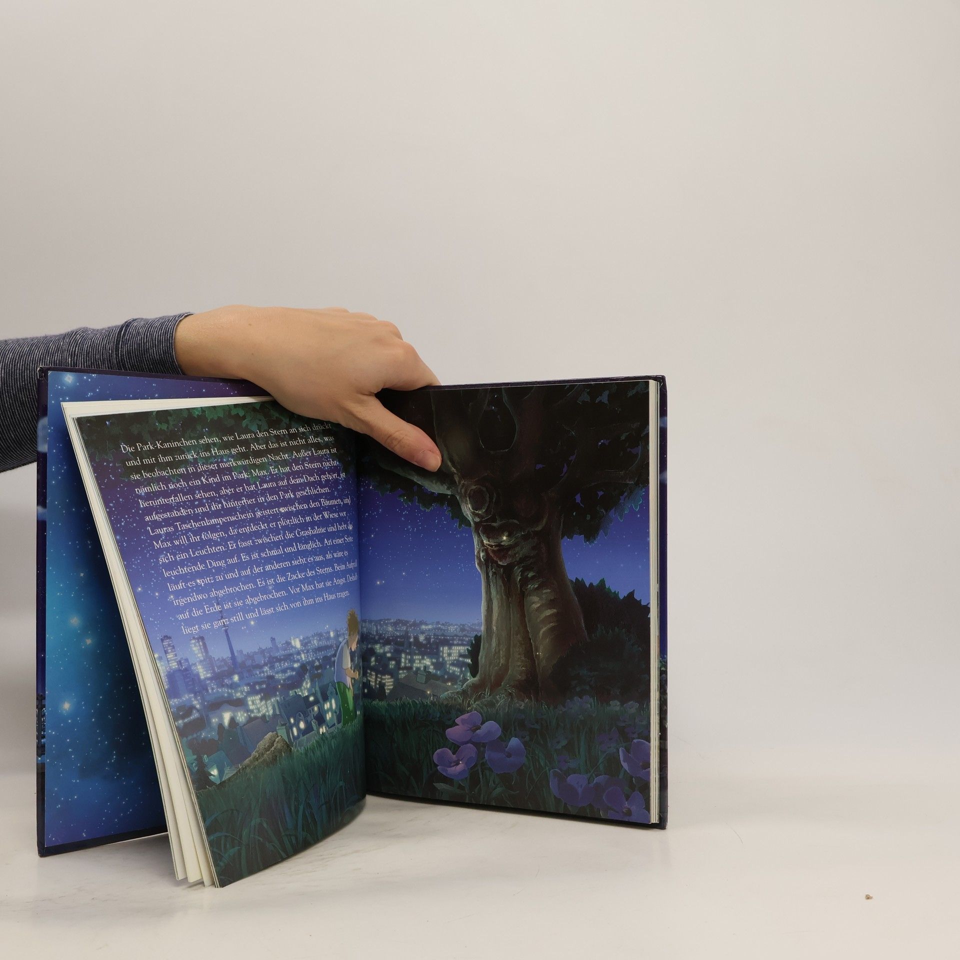 Laura, Tommy und ihre Eltern sind umgezogen, weil Lauras Mutter eine neue Stelle hat – als Cellospielerin an der Oper. Leider kommentiert Laura den Umzug ziemlich ungnädig: „Mein Apfelbaum ist nicht da! Die Wiese fehlt auch! Und das Vogelhäuschen! Meine Wippe! Meine Blumen …“ Und Tommy ist beim Umzug auch noch sein Beschütz-mich-Hund verloren gegangen! Am liebsten würde Laura gleich morgen wieder zurück in ihr altes Zuhause ziehen. In der Nacht entdeckt sie von ihrer Dachterrasse aus, wie ein kleiner Stern in den nahe gelegenen Park fällt. Sie nimmt ihn mit in ihr Zimmer, verarztet ihn liebevoll und versteckt ihn vor den Eltern. Es beginnt eine phantastische Freundschaft. Allerdings ahnt Laura, dass der Stern Heimweh hat. Und tatsächlich: Er verliert seine Leuchtkraft und Laura muss lernen, ihn wieder loszulassen. Mit Hilfe des Nachbarjungen Max, der die beiden beobachtet hat, gelingt Laura die Trennung – und sie gewinnt zugleich einen neuen Freund…