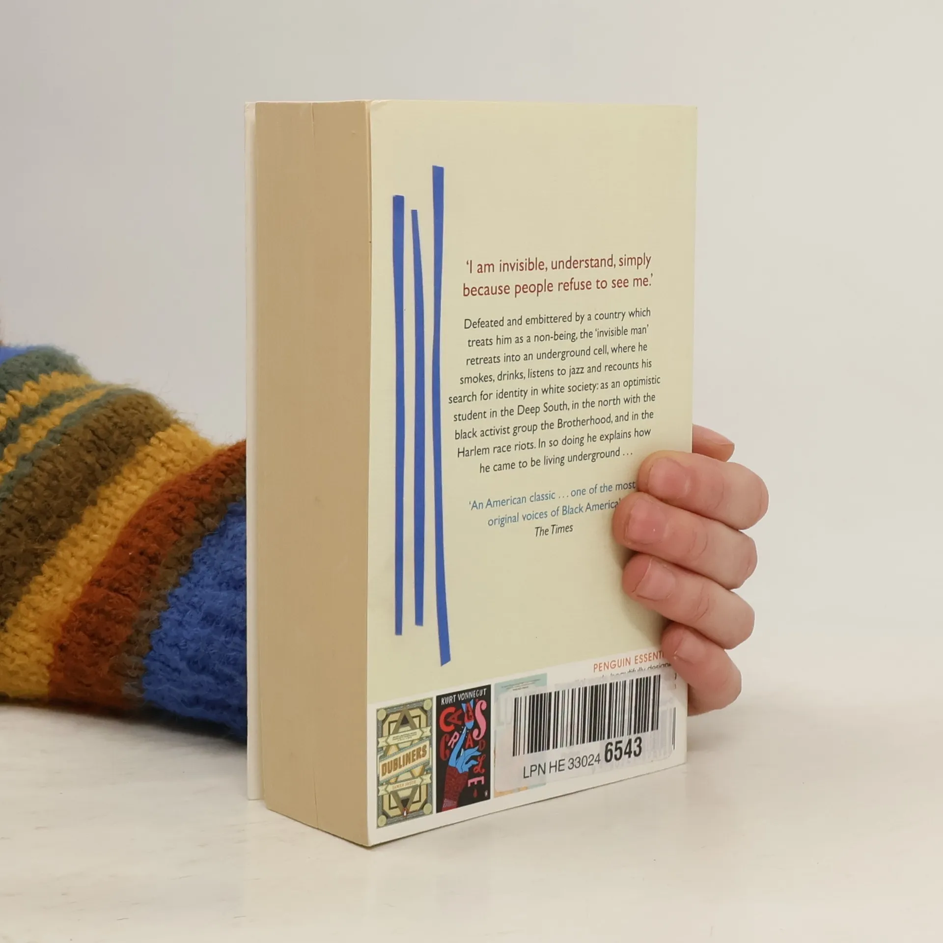 The invisible man is the unnamed narrator of this impassioned novel of black lives in 1940s America. Embittered by a country which treats him as a non-being he retreats to an underground cell.